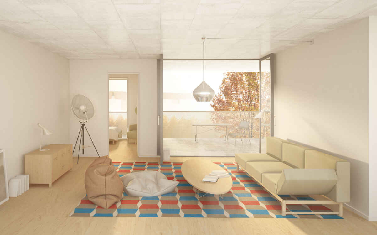 Als Antwort zum bewegten Bau auf der anderen Seite der Zürichstrasse wird die langgezogene Fassade mir Vor- und Rücksprüngen rhythmisiert. Diese nehmen Bezug auf die Treppenhäuser und schaffen klare Adressen und einen Massstab für die Bewohner. Die Gliederung schafft Qualitäten für die Wohnungen, ein Eckfenster beim Essbereich offeriert schöne Perspektiven in den Strassenraum.
