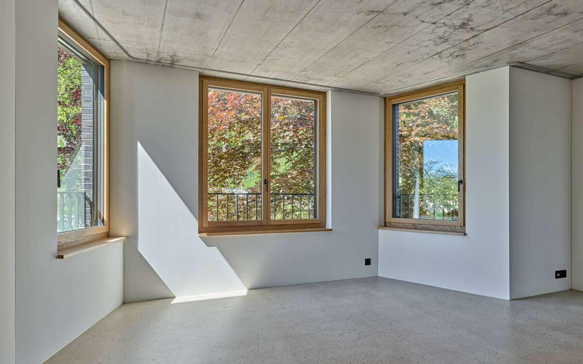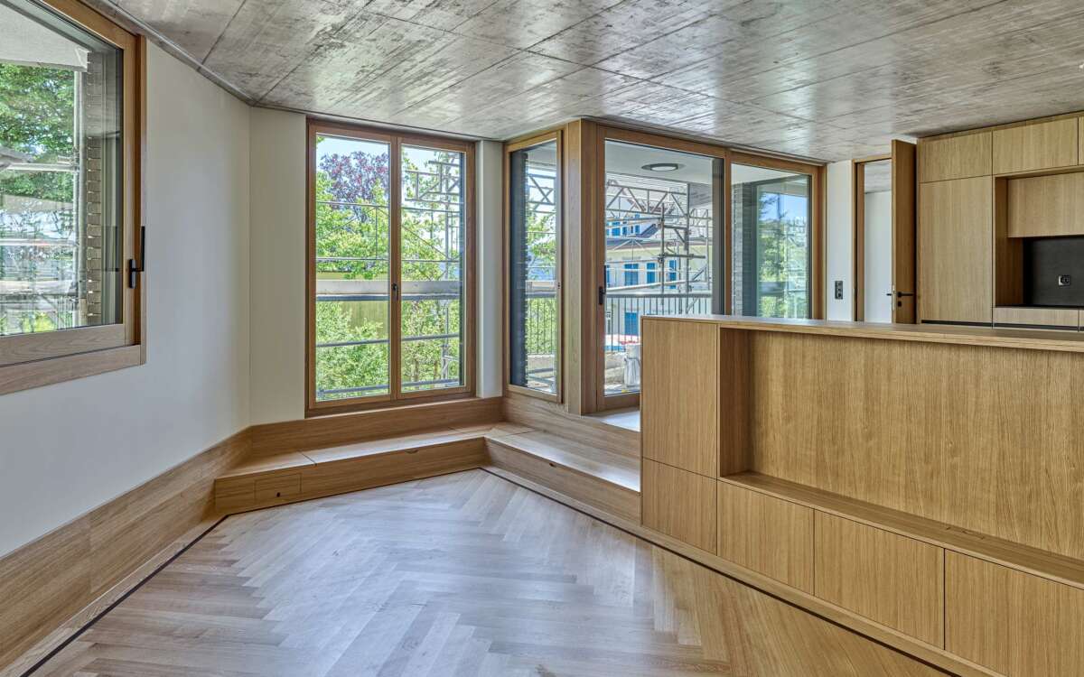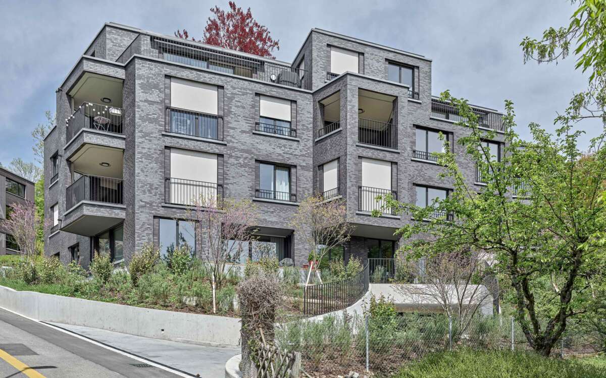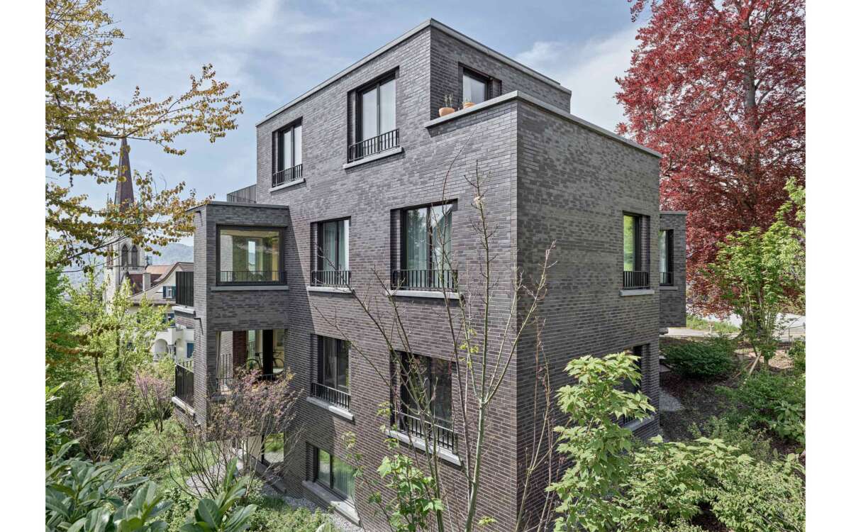 Im Rücken die stark befahrene Tièche-Strasse, hangabwärts das beinahe dörfliche Bild aus Punkthäusern und einer Kirche, im Westen der kolossale Riegel einer Genossenschaft: Der Ersatzneubau von Züst Gübeli Gambetti ist umringt von einer denkbar gemischten Nachbarschaft. Seine polygonale Form ist der Parzellenform geschuldet, deren baurechtliche Möglichkeiten er ausreizt. Zugleich passt er sich bestens in das heterogene Umfeld ein. Die Hauptrolle kommt indes einer wuchtigen Rotbuche zu; von der Strasse her ist zunächst nur die Krone sichtbar, dann schiebt sich der eigens für den Baum zurückversetzte Backsteinbau ins Sichtfeld.