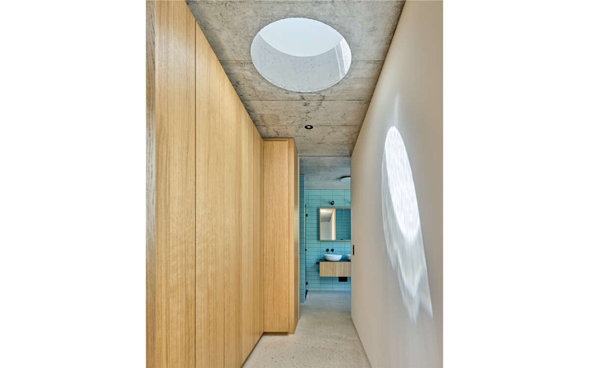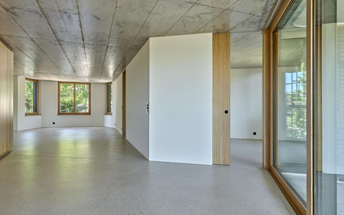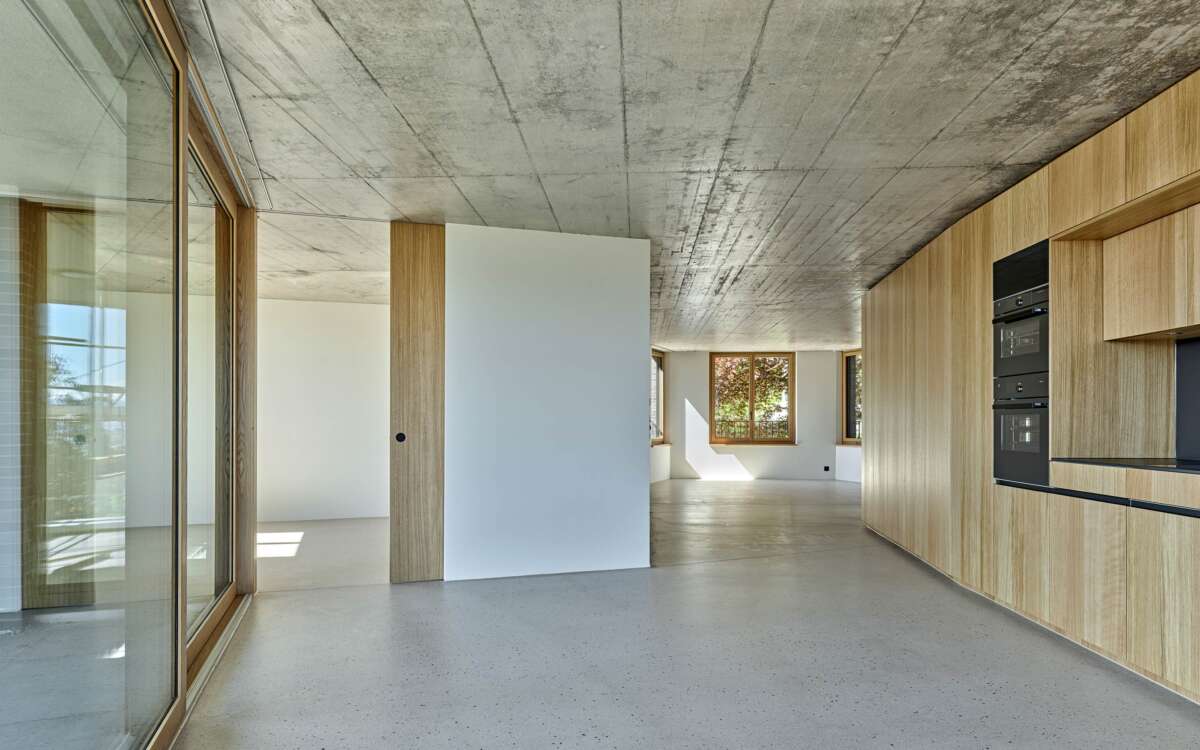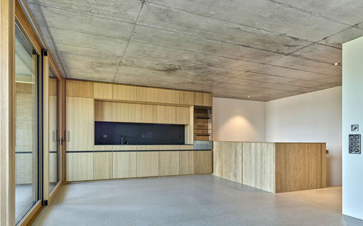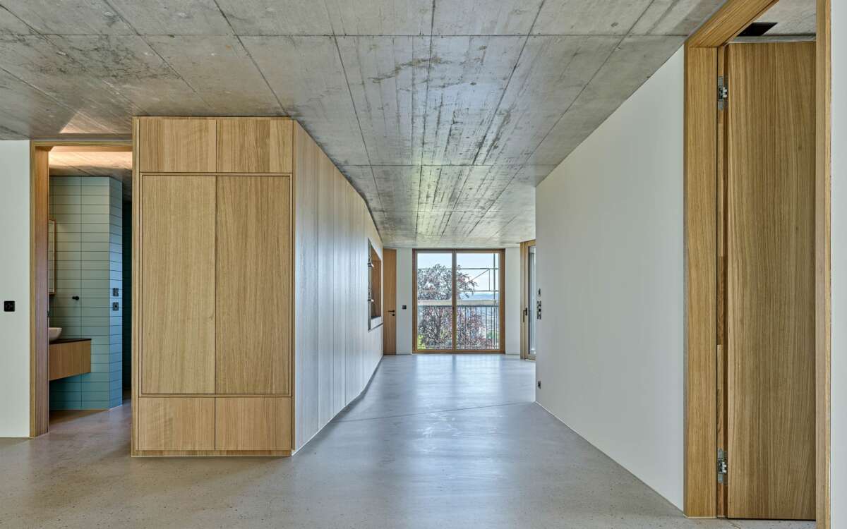 Im Rücken die stark befahrene Tièche-Strasse, hangabwärts das beinahe dörfliche Bild aus Punkthäusern und einer Kirche, im Westen der kolossale Riegel einer Genossenschaft: Der Ersatzneubau von Züst Gübeli Gambetti ist umringt von einer denkbar gemischten Nachbarschaft. Seine polygonale Form ist der Parzellenform geschuldet, deren baurechtliche Möglichkeiten er ausreizt. Zugleich passt er sich bestens in das heterogene Umfeld ein. Die Hauptrolle kommt indes einer wuchtigen Rotbuche zu; von der Strasse her ist zunächst nur die Krone sichtbar, dann schiebt sich der eigens für den Baum zurückversetzte Backsteinbau ins Sichtfeld.