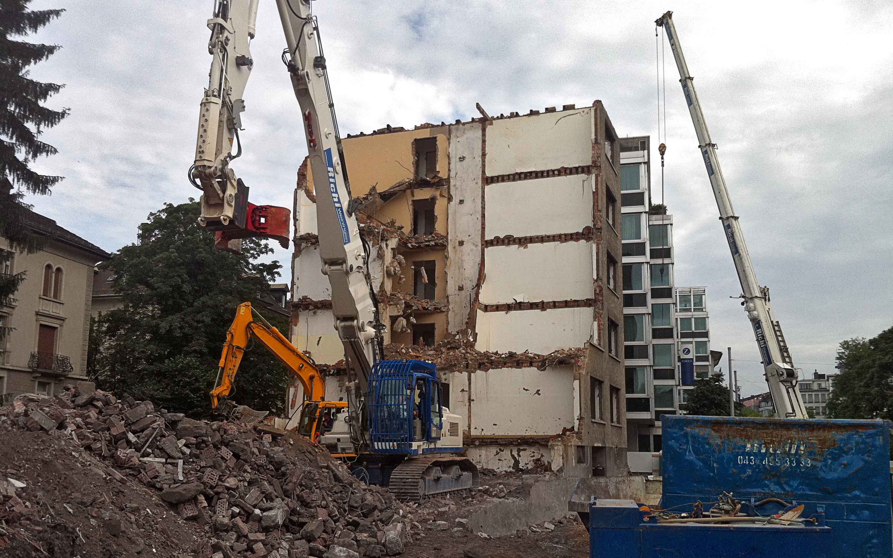 An der Alfred Escher Strasse wird abgebrochen Das Projekt schreitet voran. Seit Juni fährt an der Alfred Escher Strasse schweres Geschütz auf und schafft Platz für 28 neue Wohnungen der Zürich Anlagestiftung.