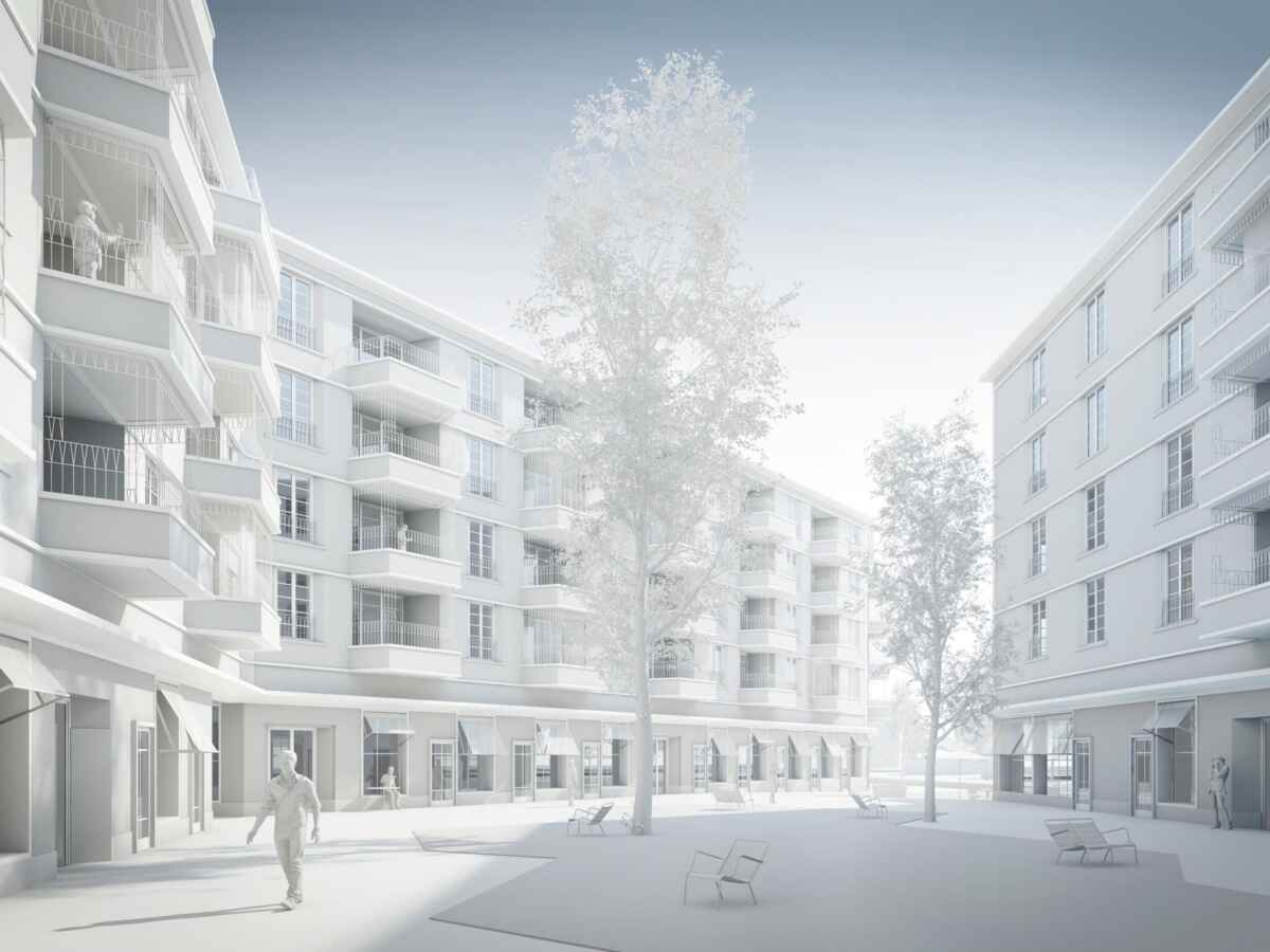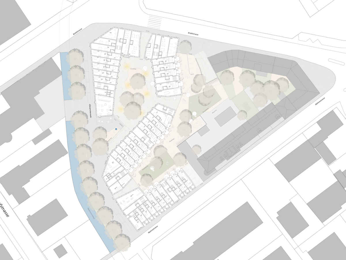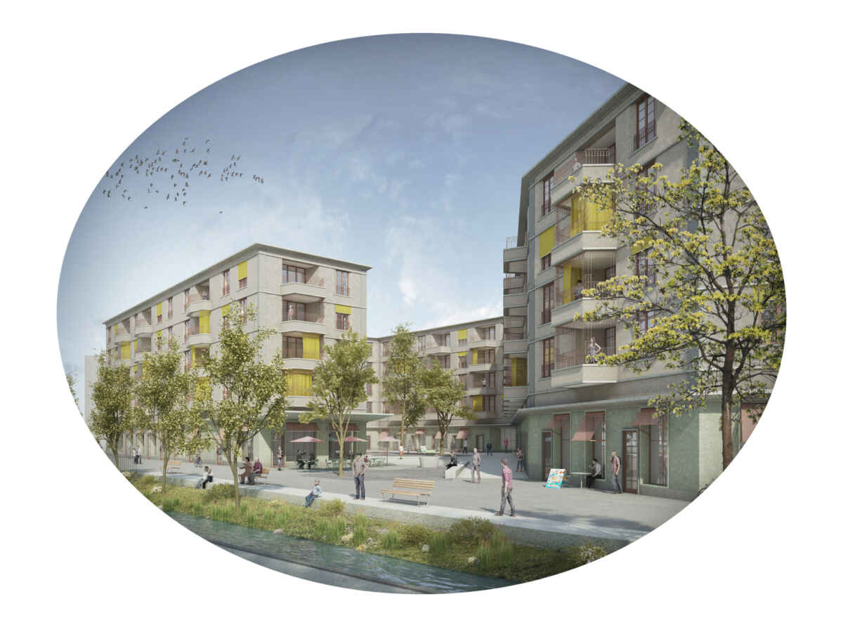 Der eigentliche «Baustoff», der den Reiz des Areals ausmacht, ist indes der nicht-gebaute Raum – er verleiht der Anlage ihre Prägnanz. Das Herzstück ist eine «Hoftasche»: Von einem Konzentrat kleiner Wohn- und Gewerbeateliers im Erdgeschoss gerahmt, wird sie zum Ort der Begegnung und des Austauschs. Als ruhigerer Gegenpol wirkt – durch eine Passage erreichbar – ein Wohn- und Spielhof, der zusammen mit dem historischen Brühlhof entsteht. Entlang des Kanals fungiert die Alleepromenade als Boulevard wie auch als weitere Querverbindung. Resultat ist ein dichtes Gefüge unterschiedlicher Typologien, was für soziale Diversität und atmosphärischen Reichtum sorgt. (mc)