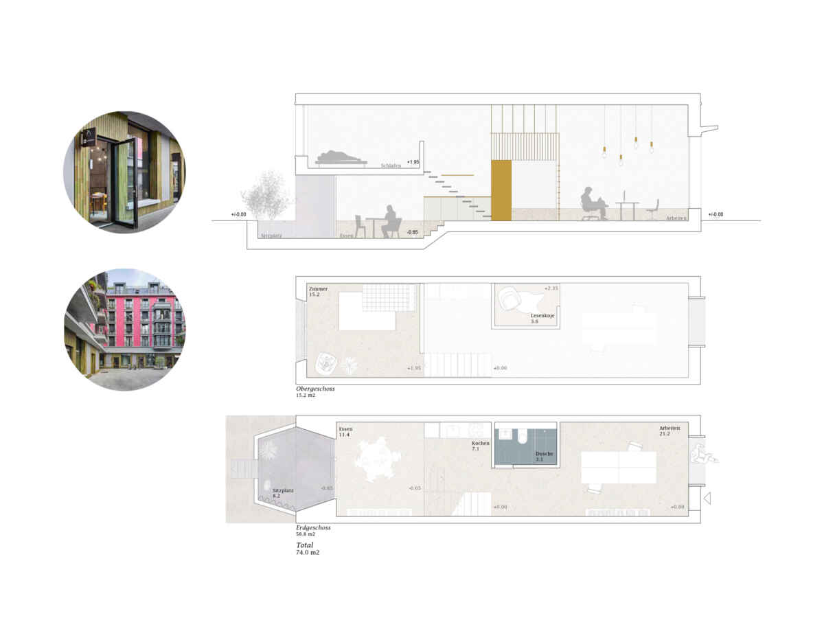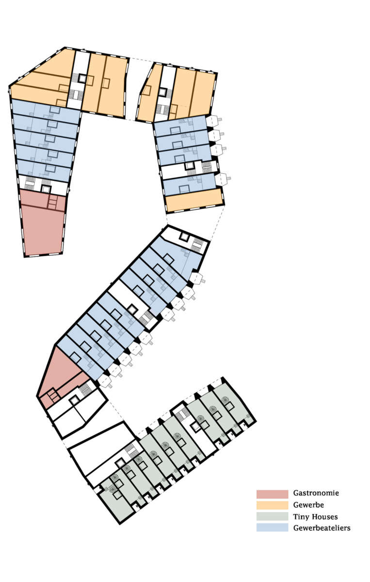 Solide Basis für die Nachverdichtung und Umnutzung eines kernstädtischen Areals in Biel bildet daher ein kleinteiliges, gut überschaubares Raumgebilde mit Clustern aus nutzungsoffenen und gemeinschaftlichen Flächen, die auf das Wohnen, Arbeiten und Zusammenleben osmotisch wirken und das Auf- und Nebeneinander fördern. Für punktuelle Stimulation an sinnfälligen Stellen sorgen öffentliche Nutzungen wie ein Café oder Läden für den täglichen Bedarf. Ergänzt wird das Angebot durch zweigeschossige Tiny Houses an der Mattenstrasse, die vor allem junge Familien ansprechen sollen.