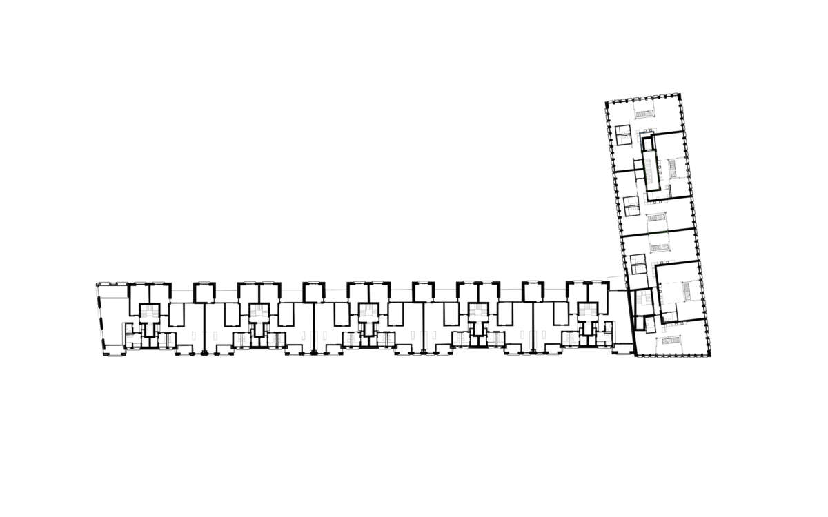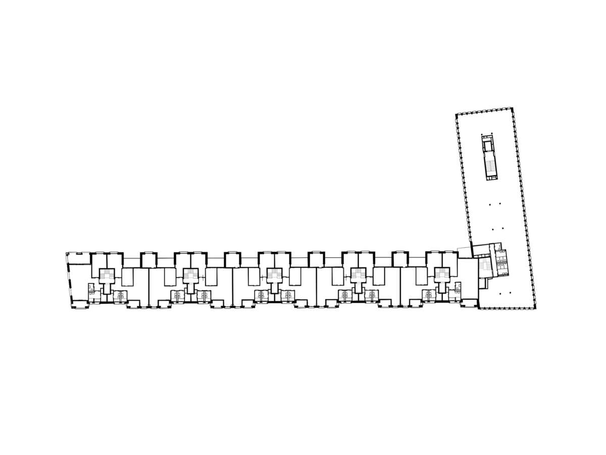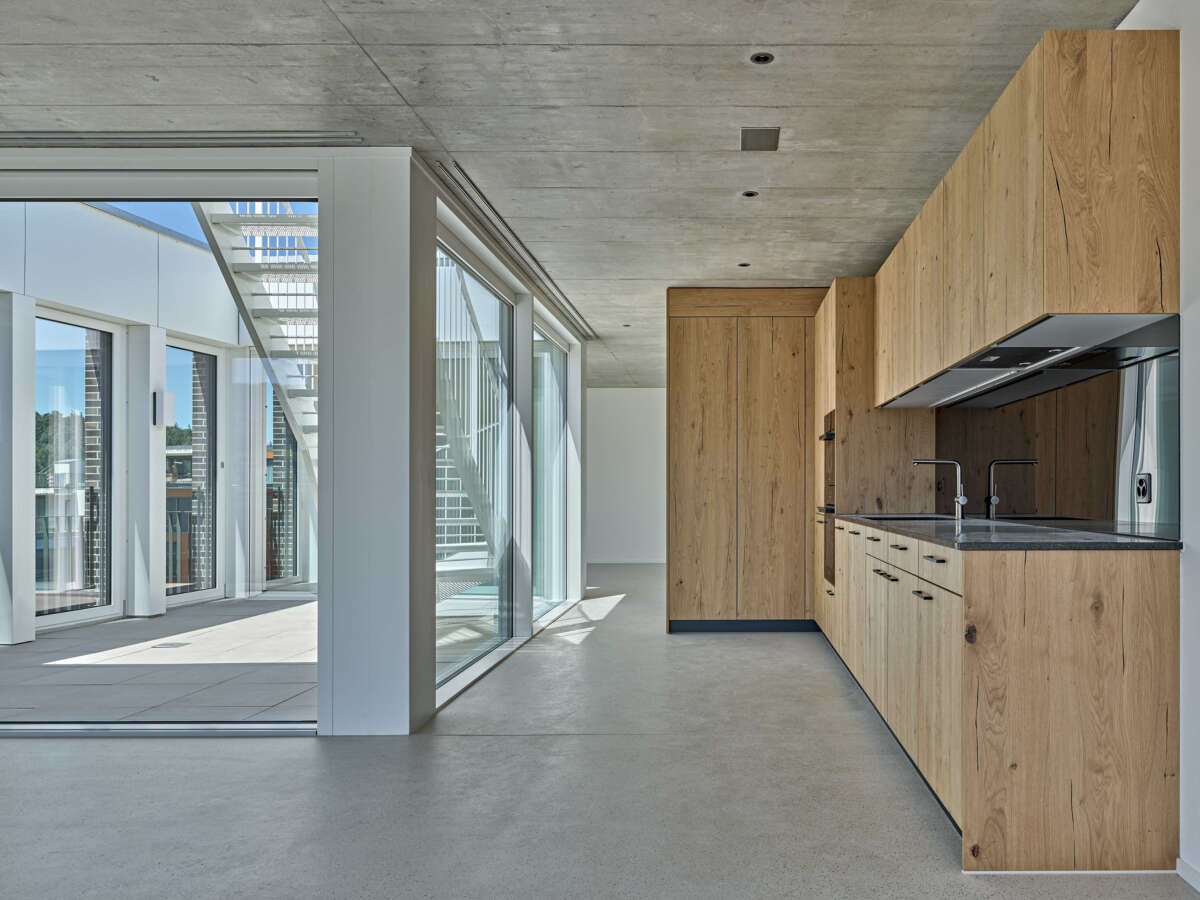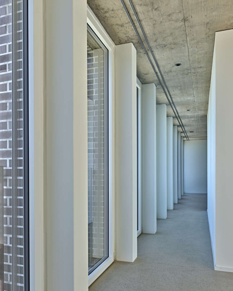 Bei der Gestaltung der Wohnungen hatten Raumerlebnis und Lichteinfall Priorität. Aus der Lärmabwehr geborene Schichtungen, Einlagerungen und Ausstülpungen der Räume ergeben ein regelrechtes szenografisches Zusammenspiel. Sogar eine Art Berliner Zimmer gibt es: Einst ein polyvalentes Raumgelenk mit typischem Eckfenster zum Hof, ist es hier ein Beitrag zur inneren Vielfalt. Das Attika des Gewerbekopfs beherbergt Atriumwohnungen mit fliessenden Raumbezügen, die den Aufgang auf private Dachterrassen erlauben. Trotz Mischnutzung bilden Kopf und Rückgrat ein stimmiges Ganzes, wobei ihre scharfkantige Form mit den streng rhythmisierten Klinkerfassaden korrespondiert. (mc)