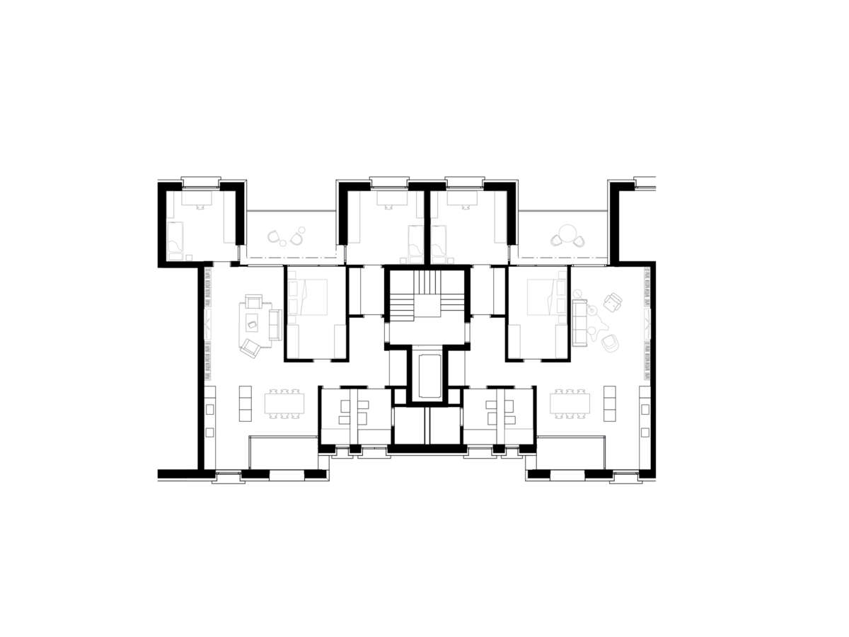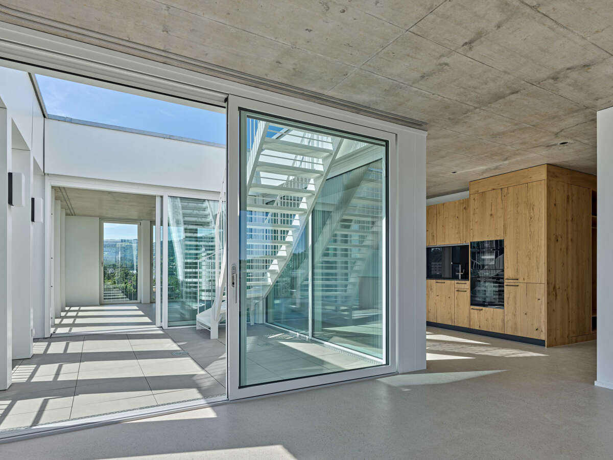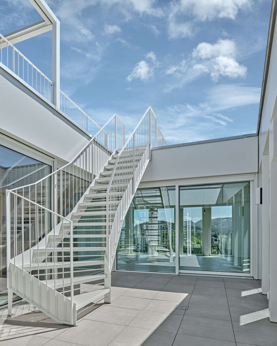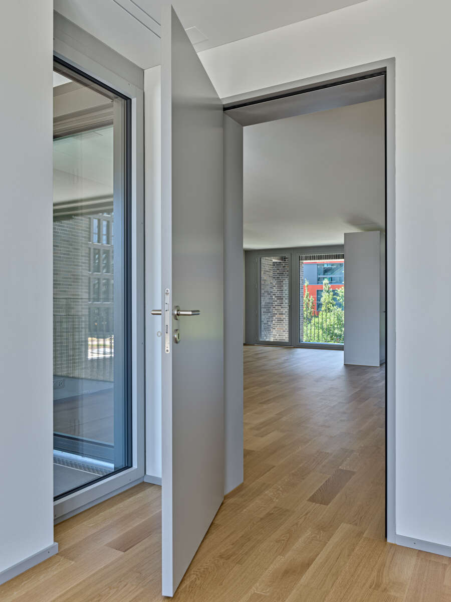 Bei der Gestaltung der Wohnungen hatten Raumerlebnis und Lichteinfall Priorität. Aus der Lärmabwehr geborene Schichtungen, Einlagerungen und Ausstülpungen der Räume ergeben ein regelrechtes szenografisches Zusammenspiel. Sogar eine Art Berliner Zimmer gibt es: Einst ein polyvalentes Raumgelenk mit typischem Eckfenster zum Hof, ist es hier ein Beitrag zur inneren Vielfalt. Das Attika des Gewerbekopfs beherbergt Atriumwohnungen mit fliessenden Raumbezügen, die den Aufgang auf private Dachterrassen erlauben. Trotz Mischnutzung bilden Kopf und Rückgrat ein stimmiges Ganzes, wobei ihre scharfkantige Form mit den streng rhythmisierten Klinkerfassaden korrespondiert. (mc)