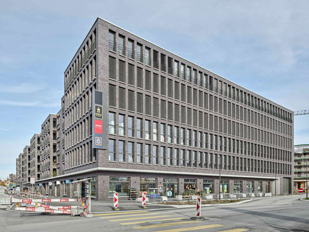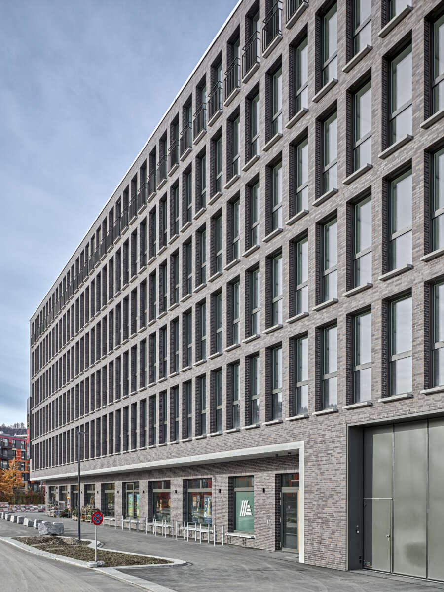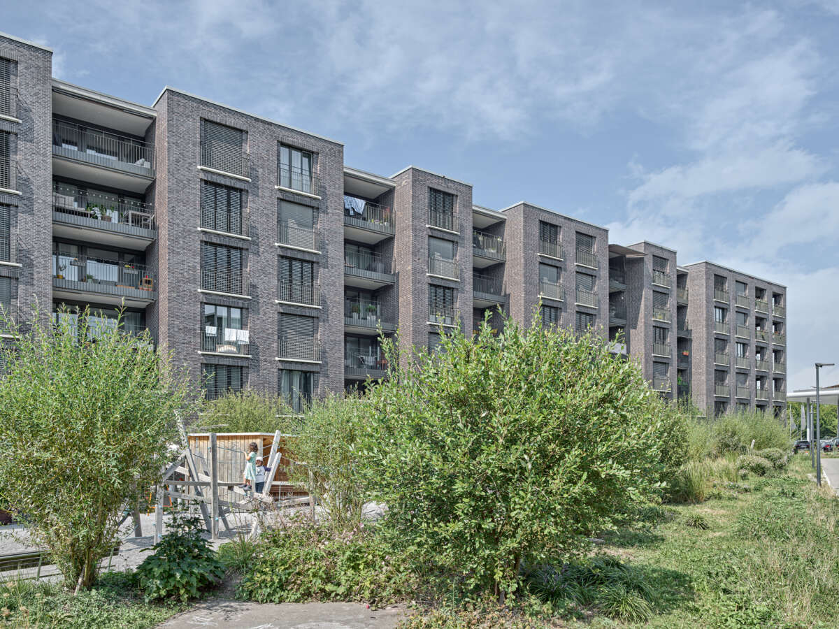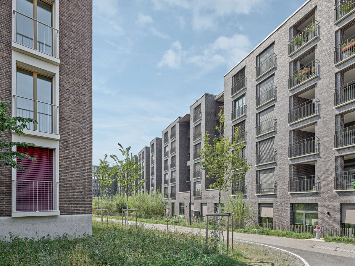 Dank eines L-förmigen Baus ist städtebaulich der richtige Schritt getan, um dem neuen Quartier ein Gesicht zu verleihen und auf den lang ersehnten Platz einzulenken. Der Gewerbekopf sorgt für ein einprägsames Signet und beschirmte Ladenflächen. Auch der Wohnriegel an der Strasse bildet eine klare Kante aus. Seine Vor- und Rücksprünge sind eine prononcierte Antwort auf den Grüt-Park vis-à-vis und helfen, Massstab wie Schall zu brechen. Rückseits entsteht im Dialog mit der künftigen Nachbarschaft ein grüner Hinterhof, der das Hermetische der Fronten relativiert. Ein öffentlicher Zugang seitens des Platzes und ein interner Gebäudedurchgang laden ein, den Hof zu betreten.