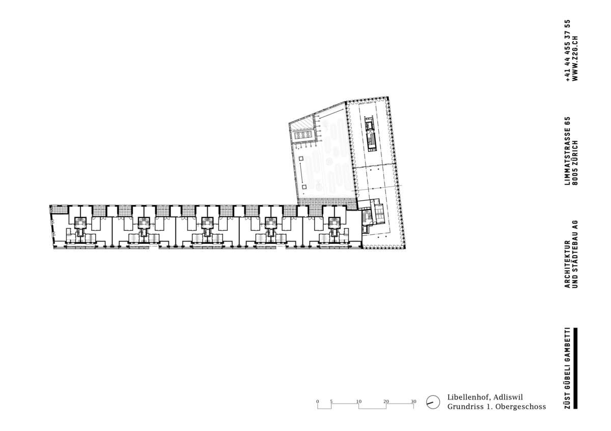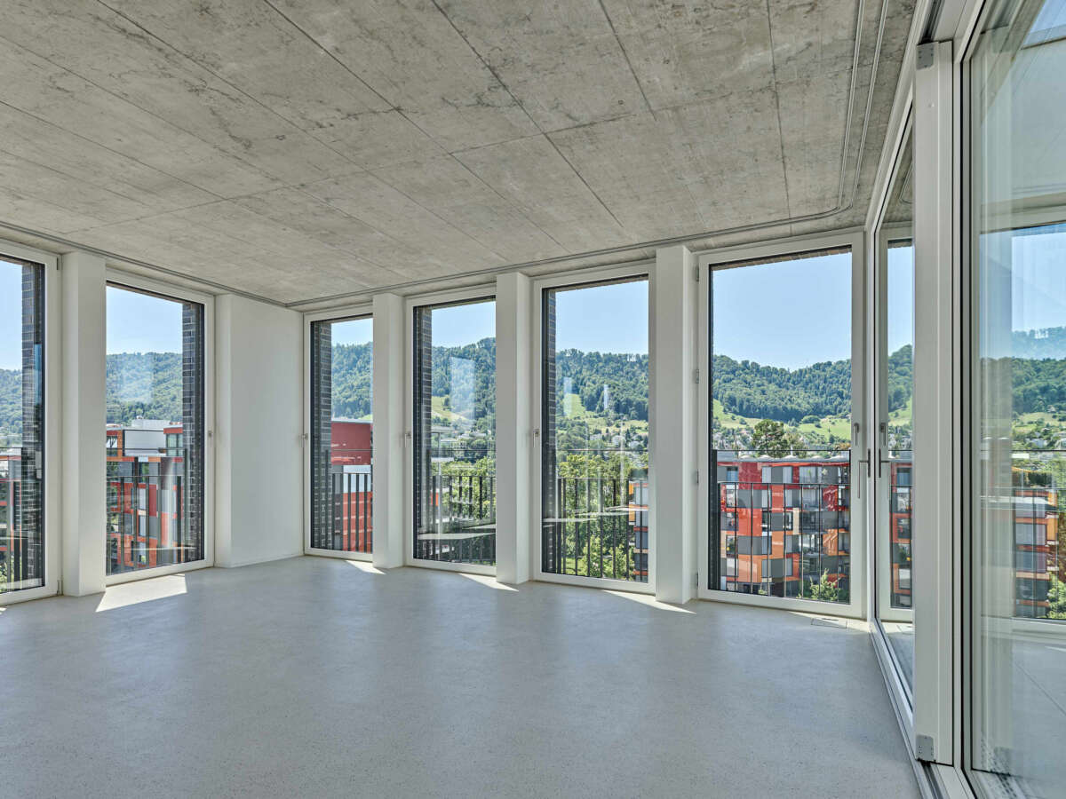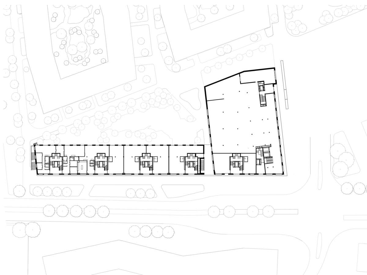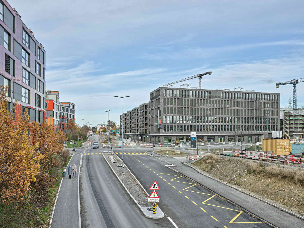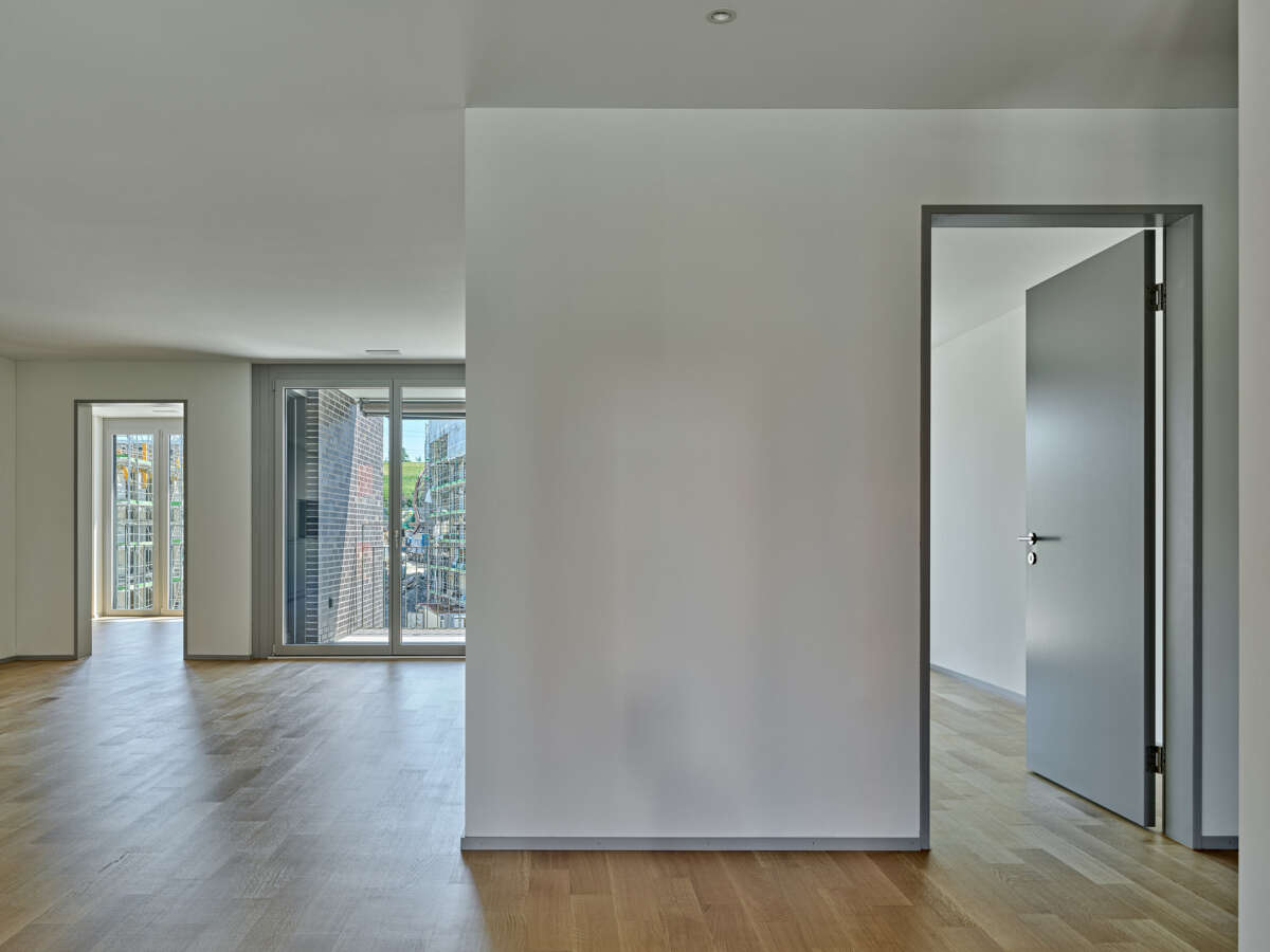 Dank eines L-förmigen Baus ist städtebaulich der richtige Schritt getan, um dem neuen Quartier ein Gesicht zu verleihen und auf den lang ersehnten Platz einzulenken. Der Gewerbekopf sorgt für ein einprägsames Signet und beschirmte Ladenflächen. Auch der Wohnriegel an der Strasse bildet eine klare Kante aus. Seine Vor- und Rücksprünge sind eine prononcierte Antwort auf den Grüt-Park vis-à-vis und helfen, Massstab wie Schall zu brechen. Rückseits entsteht im Dialog mit der künftigen Nachbarschaft ein grüner Hinterhof, der das Hermetische der Fronten relativiert. Ein öffentlicher Zugang seitens des Platzes und ein interner Gebäudedurchgang laden ein, den Hof zu betreten.