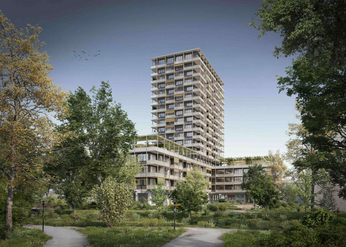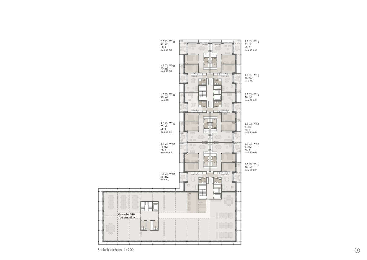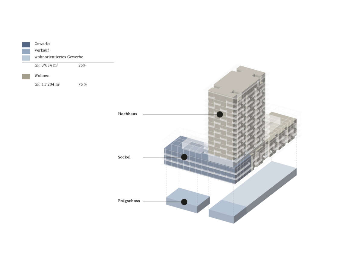 Seine Basis gibt die Haltung zum öffentlichen Raum preis: An der Neugutstrasse verleiht sie als Gewerbefront der Überbauung ein markiges Gesicht. Auf Augenhöhe angesiedelt sind Verkaufsflächen sowie ein einladender Durchstich in den Hof und rückwärtigen Park. Letzterer ergiesst sich bis zur Glatt und setzt mittels massiver Baumbepflanzung der Gebäudemasse einen Kontrapunkt. Im zum Breitibach abgedrehten Schenkel konzentrieren sich kleinteilige Coworking-Einheiten und soziale Einrichtungen. Darüber wird gewohnt. Die oberste Sockeletage zeichnet mit Pergola-artigem Ausdruck den Übergang zum Hochhaus und steht dank Dachterrasse, Bar, Party- und Fitnessraum sowie Waschsalon im Dienst der Gemeinschaft.