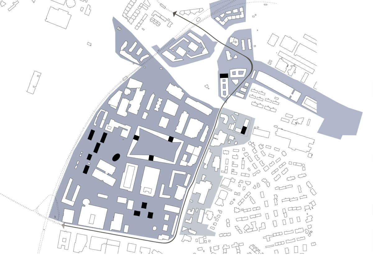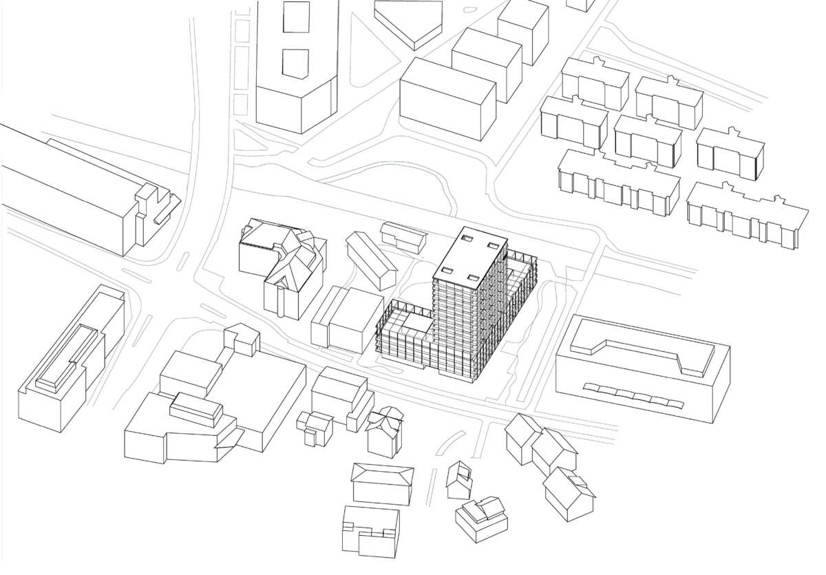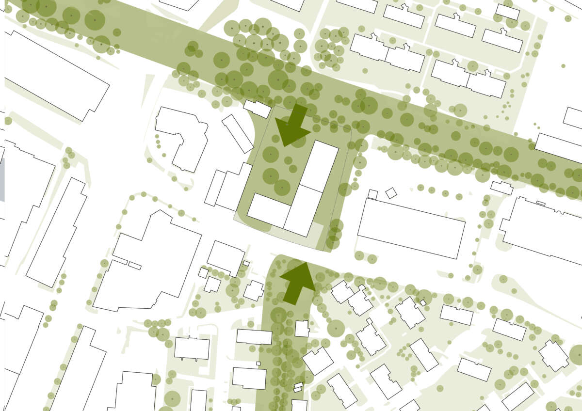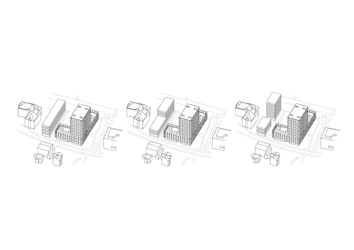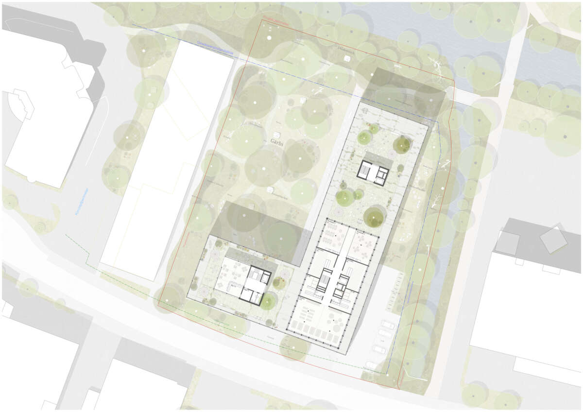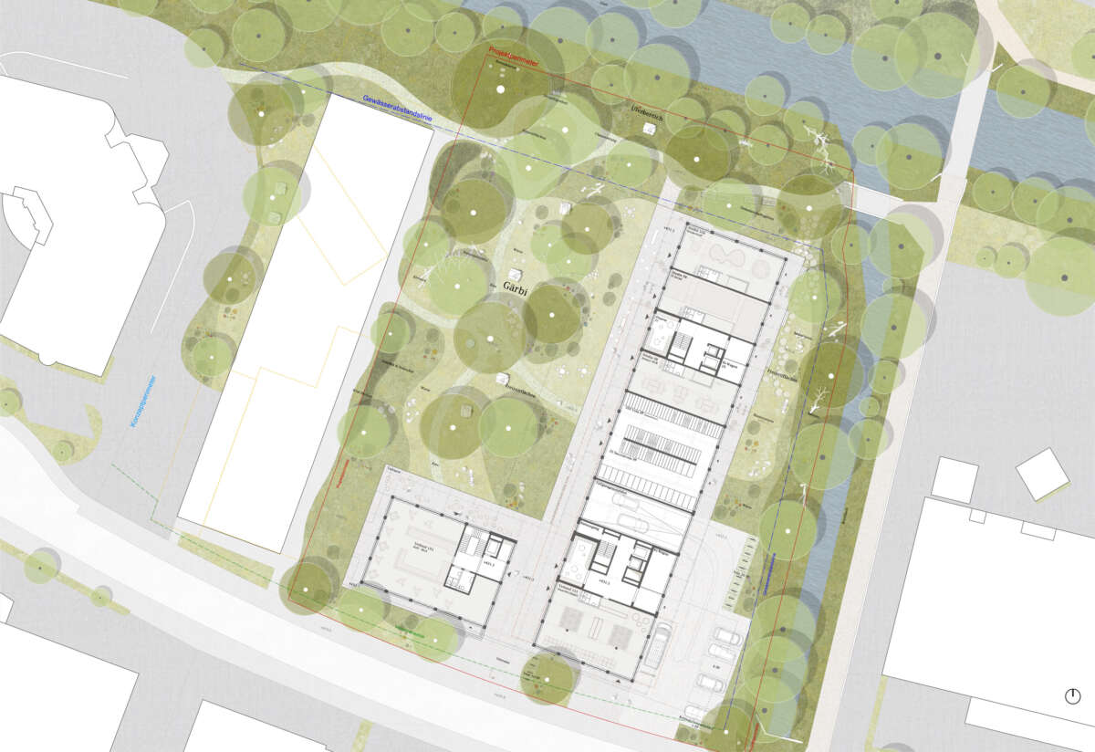 Östlich des boomenden Hochbord-Quartiers im Scharnier zum ruhigen Wohngebiet liegt eine 5‘800m2-Brache. Sie soll in einen hochwertigen Stadtbaustein mit hohem Wohnanteil überführt werden, der zugleich die Identität sowie den für das Quartier wichtigen Grünraum an der Glatt stärkt. Städtebauliche Antwort ist eine L-förmige Gebäudeanlage, aus deren Winkel ein Wohnturm ragt. Er nutzt die Verdichtung in die Höhe, um einen grossen Hof freizuspielen und vielfältige Schwellenräume anzubieten. Ebenso übernimmt die austarierte Gebäudekonfiguration eine Mittlerrolle zwischen den hohen Solitären in der Nachbarschaft und dem angrenzenden Wohngebiet.