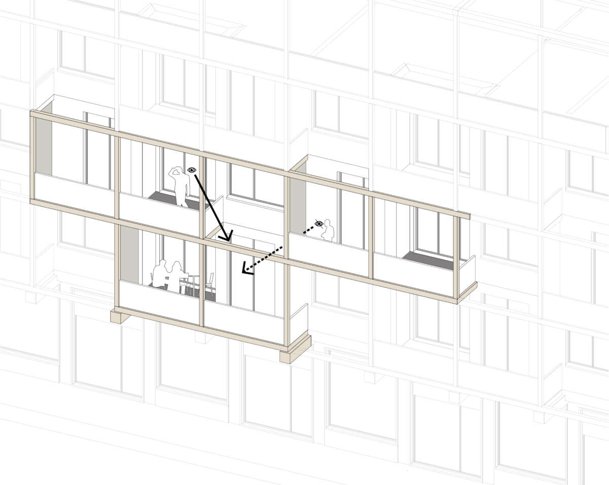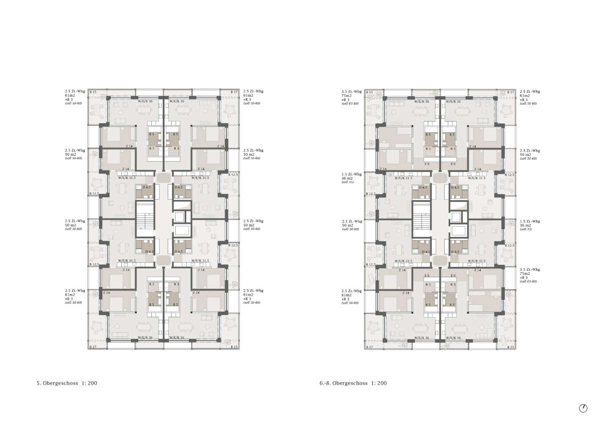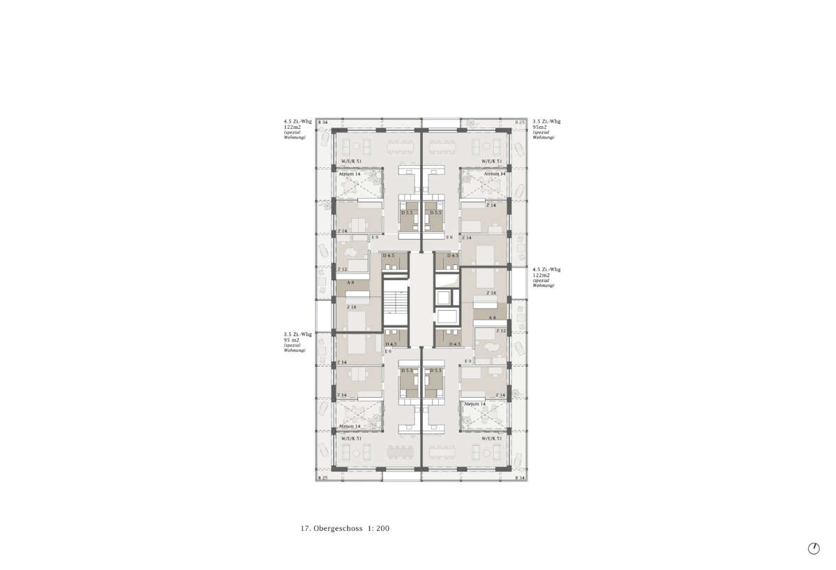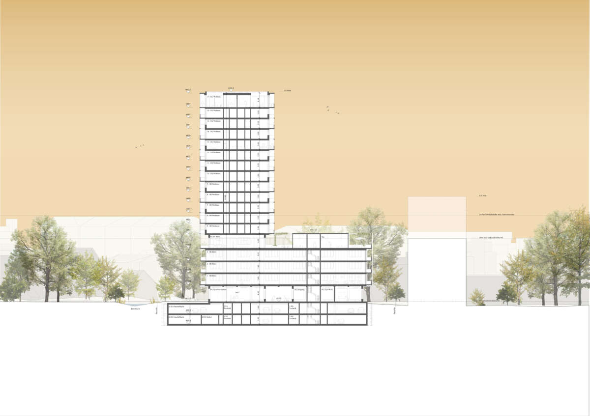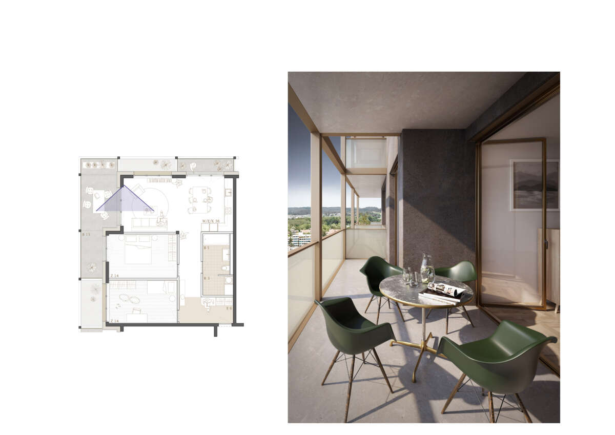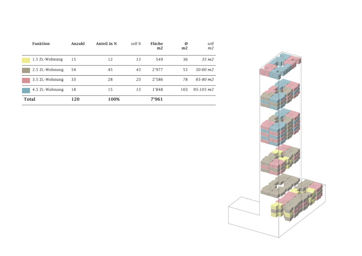 Im 17-geschossigen Wohnturm befinden sich pro Geschoss bis zu acht Wohnungen. Dabei teilen sich je vier Einheiten einen indirekt belichteten Vorbereich. Durch geschickt angeordnete Schaltzimmer lässt sich der Wohnungsmix auch anders adaptieren. Allen Wohnungen gemein ist eine der Fassade vorgelagerte, filigran wirkende Raumstruktur, die eine umlaufende, unterschiedlich tiefe bzw. hohe Balkonschicht ausbildet. Teils mit doppelgeschossigen Lufträumen versehen, befördern diese eine Raumerweiterung ins Aussen, eine optimierte Belichtung sowie als Bilder gerahmte Aussichten. Im Attika bieten in die Wohnungen eingeschriebene, nach oben offenen Atrien ein zusätzliches Wohnerlebnis. (mc)