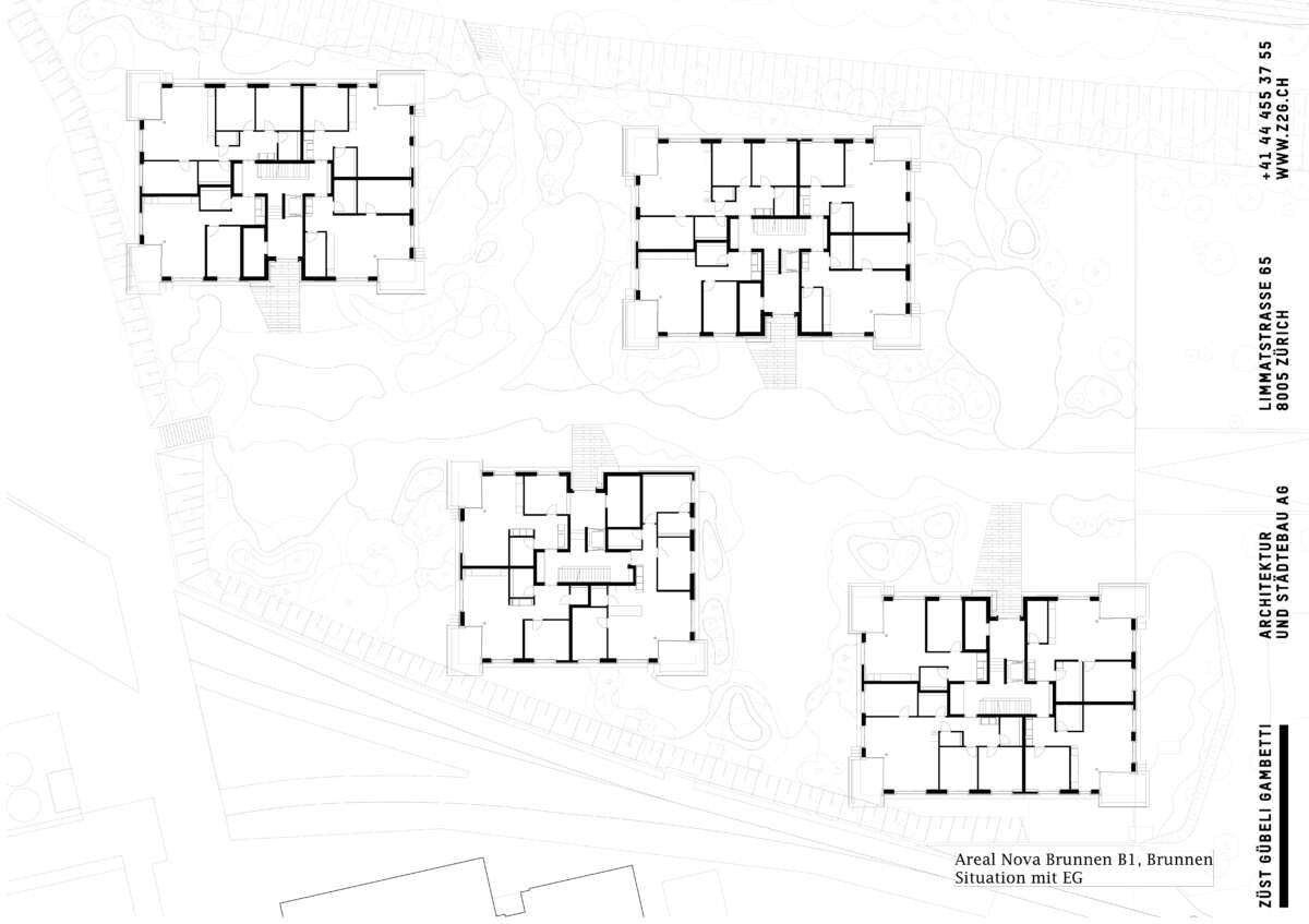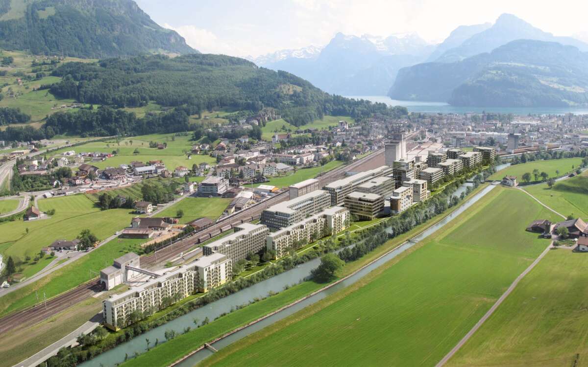 Nova Brunnen entsteht auf einem stillgelegten Industrieareal, nahe der Bahntrasse und trotz Gehdistanz zum Dorfzentrumim aktuellen Niemandsland. Das geschichtsträchtige Areal, auf dem Jahrzehnte lang Zement hergestellt wurde, liegt eingebettet in einen faszinierenden Naturraum. Von der Muota begleitet und einer imposanten Bergwelt gerahmt, lag ZüstGübeliGambettis Augenmerk auf einer Integration und Inszenierung des Natur- und Freiraums:Trotz sportlicher Dichtevorgaben sollte das Versprechen von Wohnen mit Weitsicht eingelöst werden, damit alle Bewohner in den Genuss der Naturschönheiten kommen.