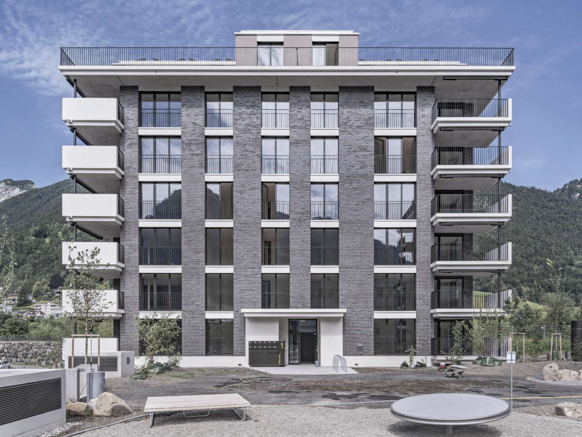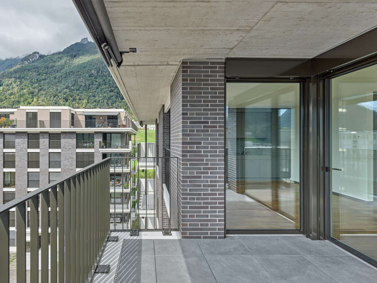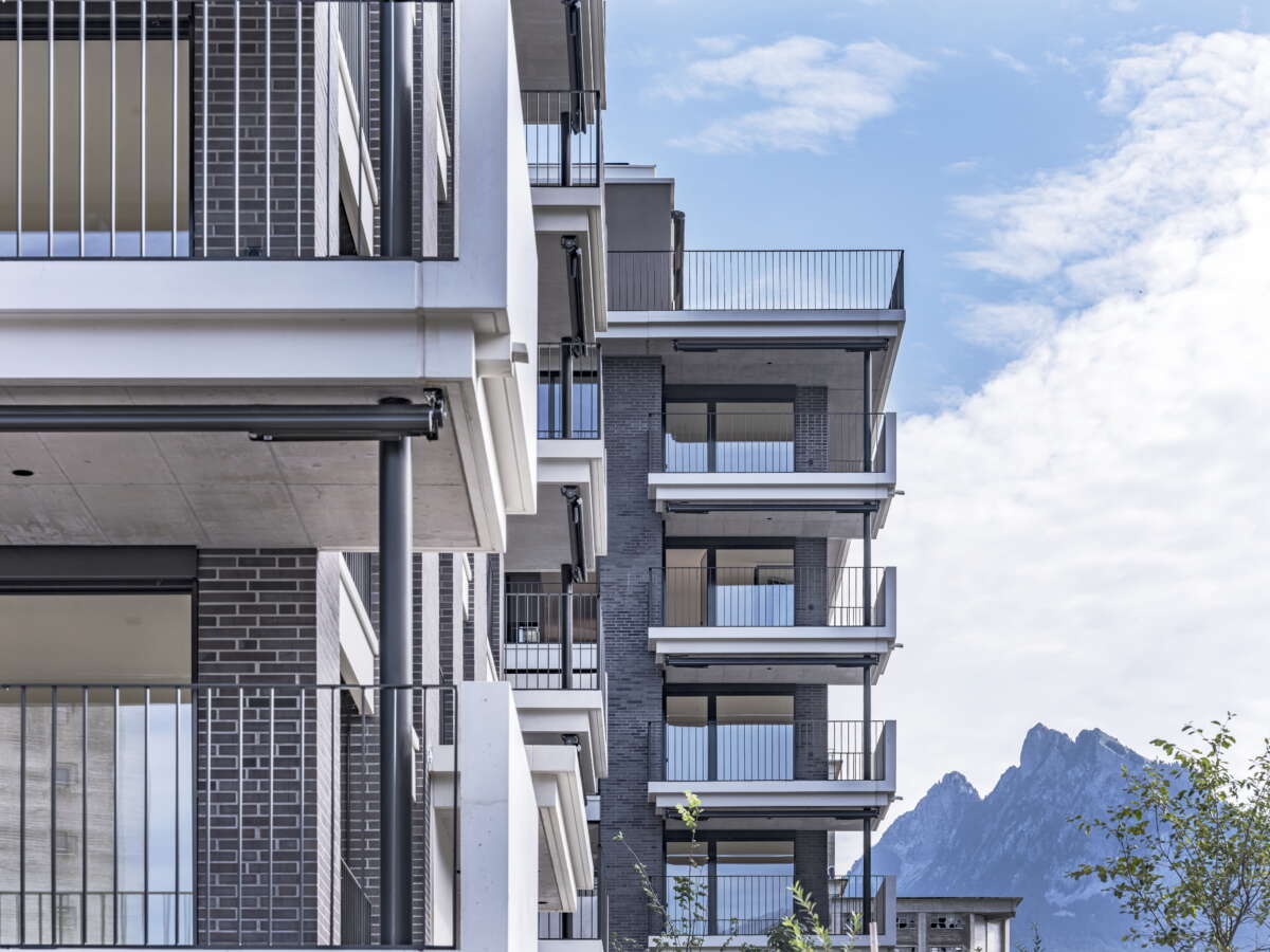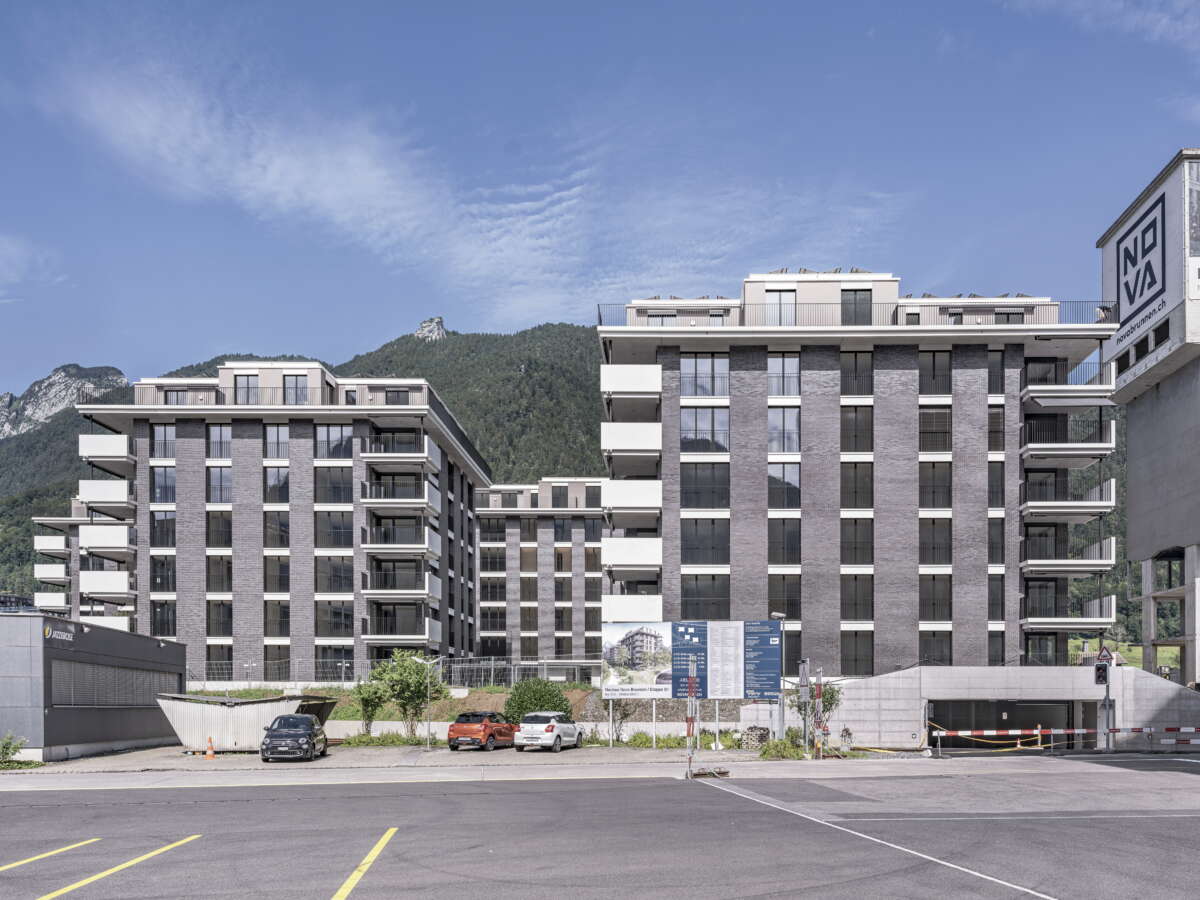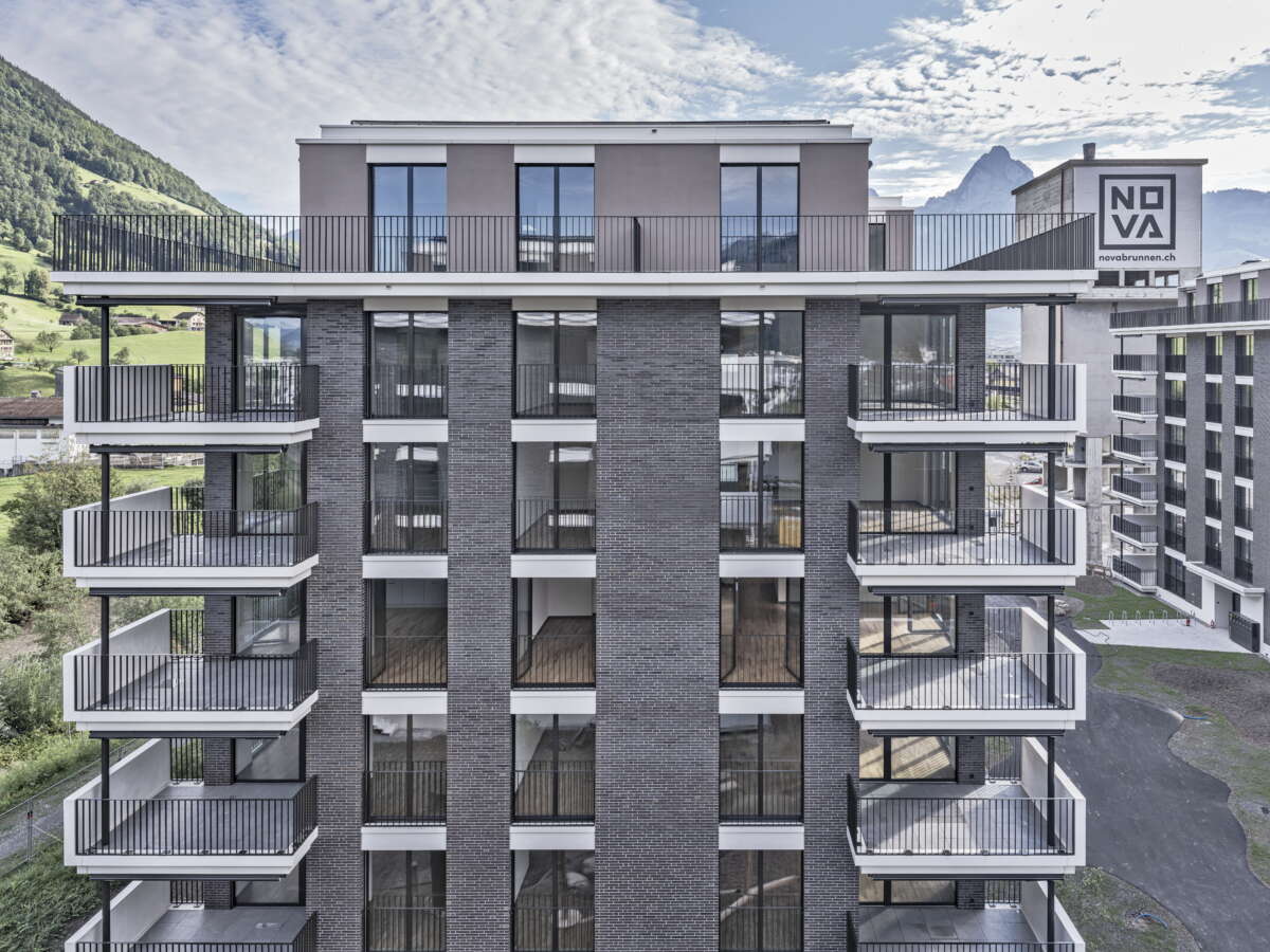 Nach über zehnjähriger Entwicklungszeit erfolgte 2022 der Spatenstich zu «Nova Port», dem zum Ortszentrum nächsten Baufeld: Hier machen vier Punktbauten sowie ein Silo als Zeitzeuge den Arealauftakt. Auch diese Häuser versetzt zueinander angeordnet, was abwechslungsreiche Ausblicke auf die Muota und die Bergkulisse gewährt. Zugleich entstehen zwischen den Vierspännern fein justierte Freiräume, die eine optimale Besonnung der insgesamt 101 Mietwohnungen mit ihren ausladenden Eckloggien erlauben. Zudem erhält die reiche Geschichte der ehemaligen Zementfabrik in den Bauten dank Klinkerfassaden und vorfabrizierten Betonelementen eine Reminiszenz. (mc)