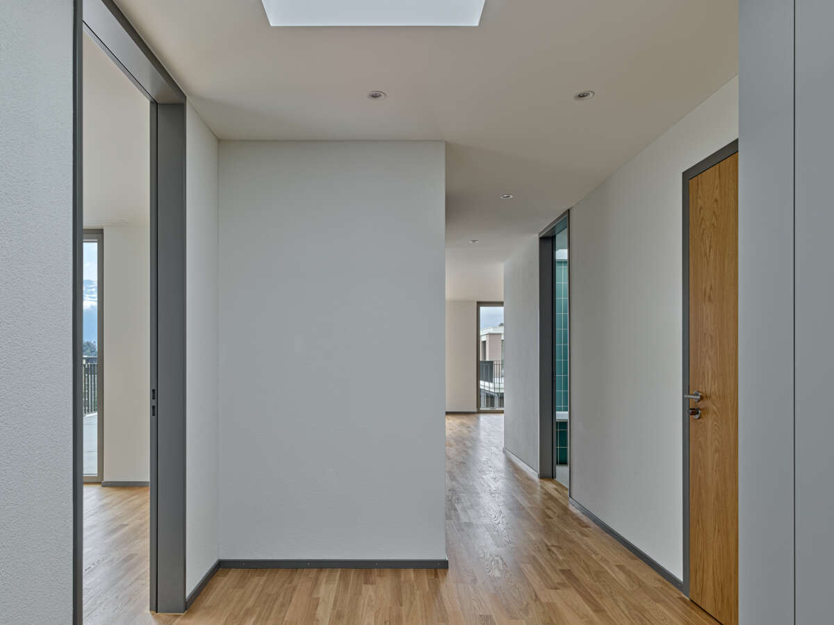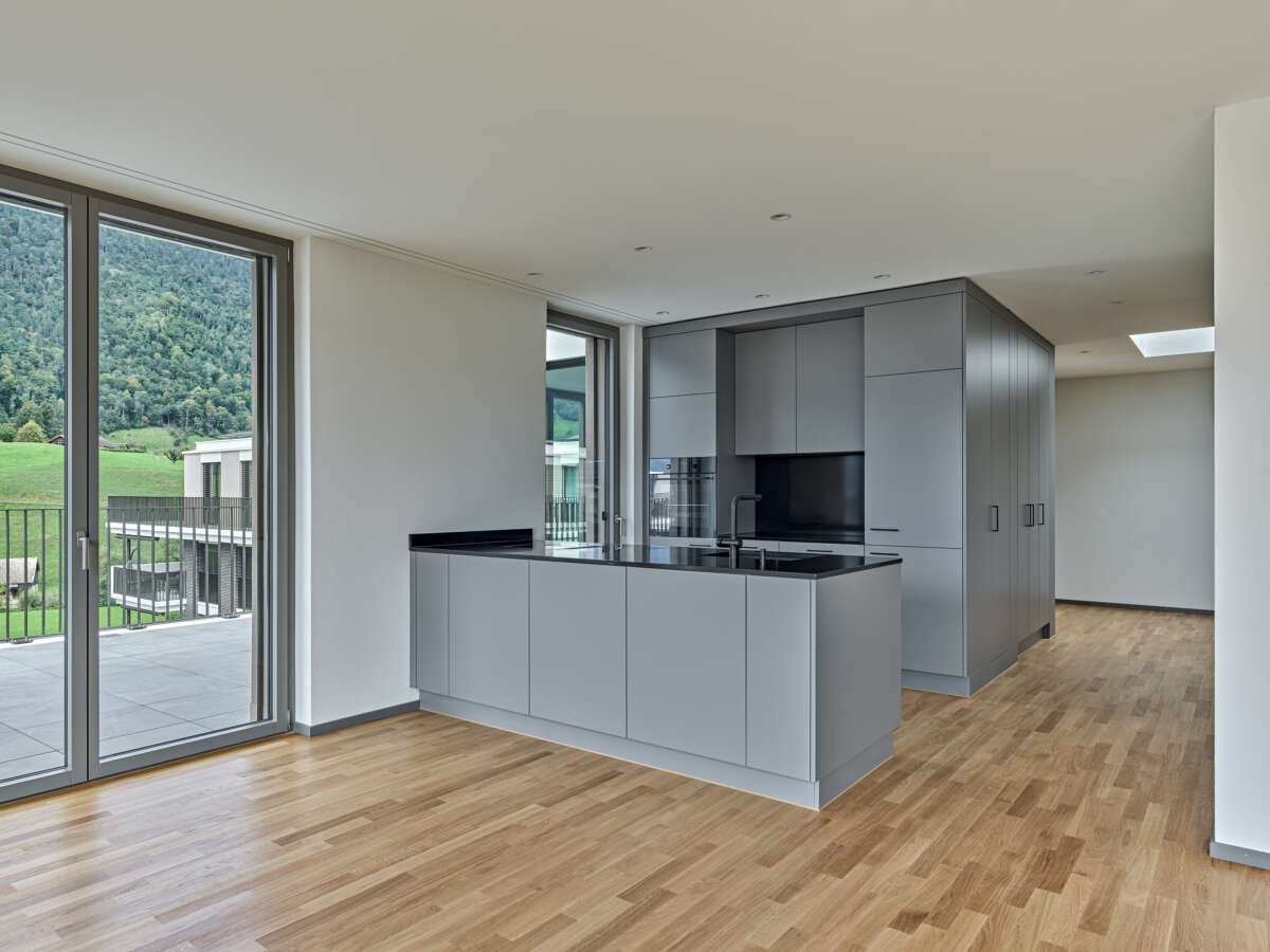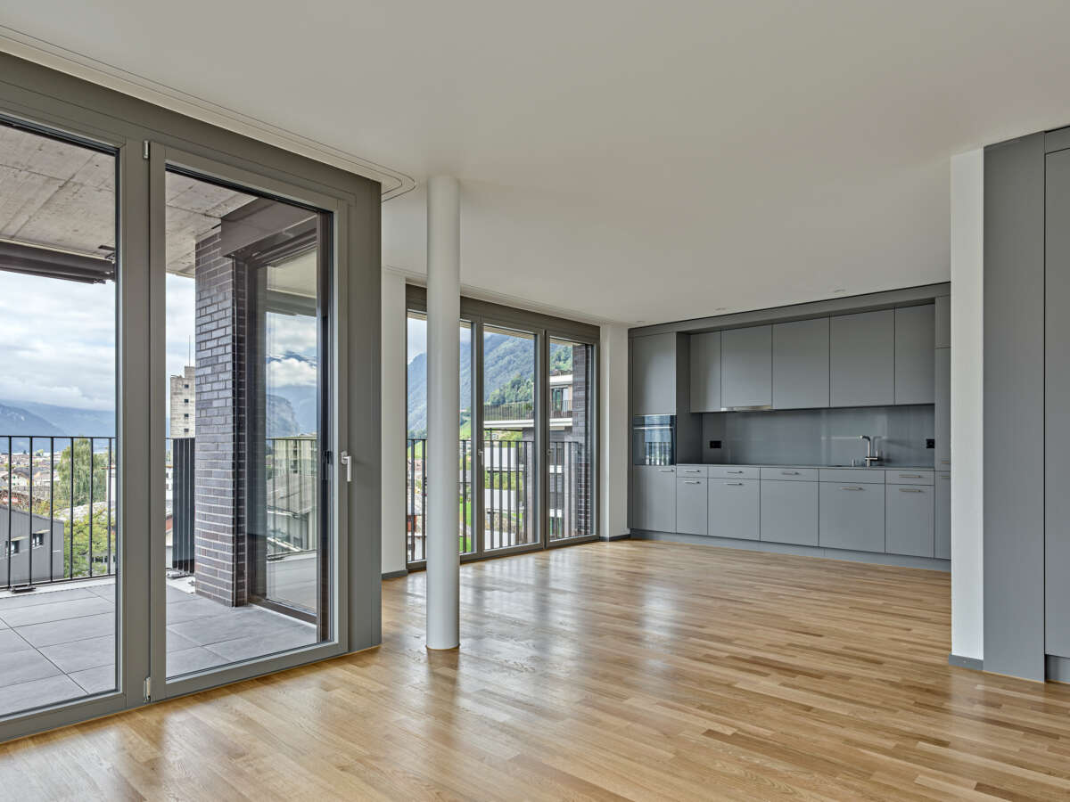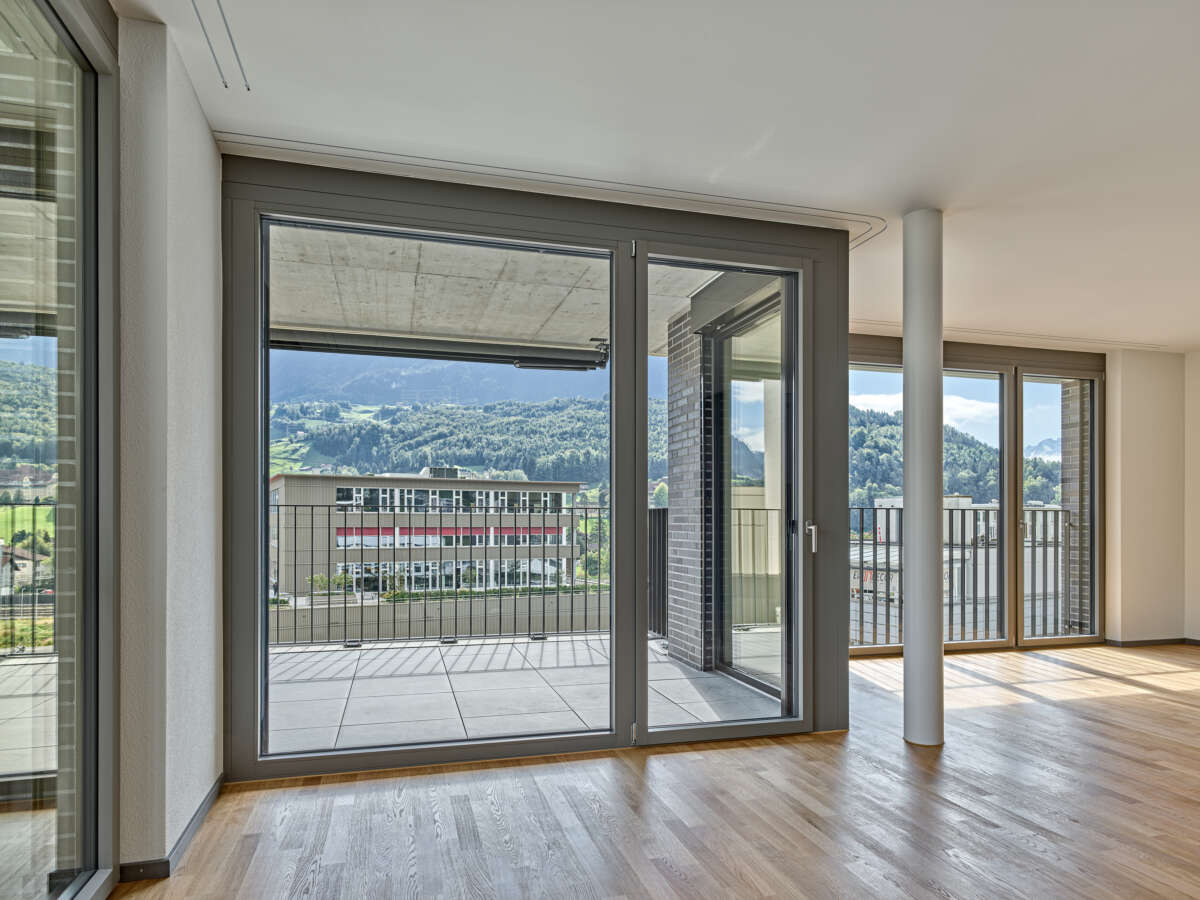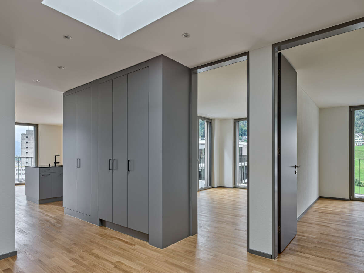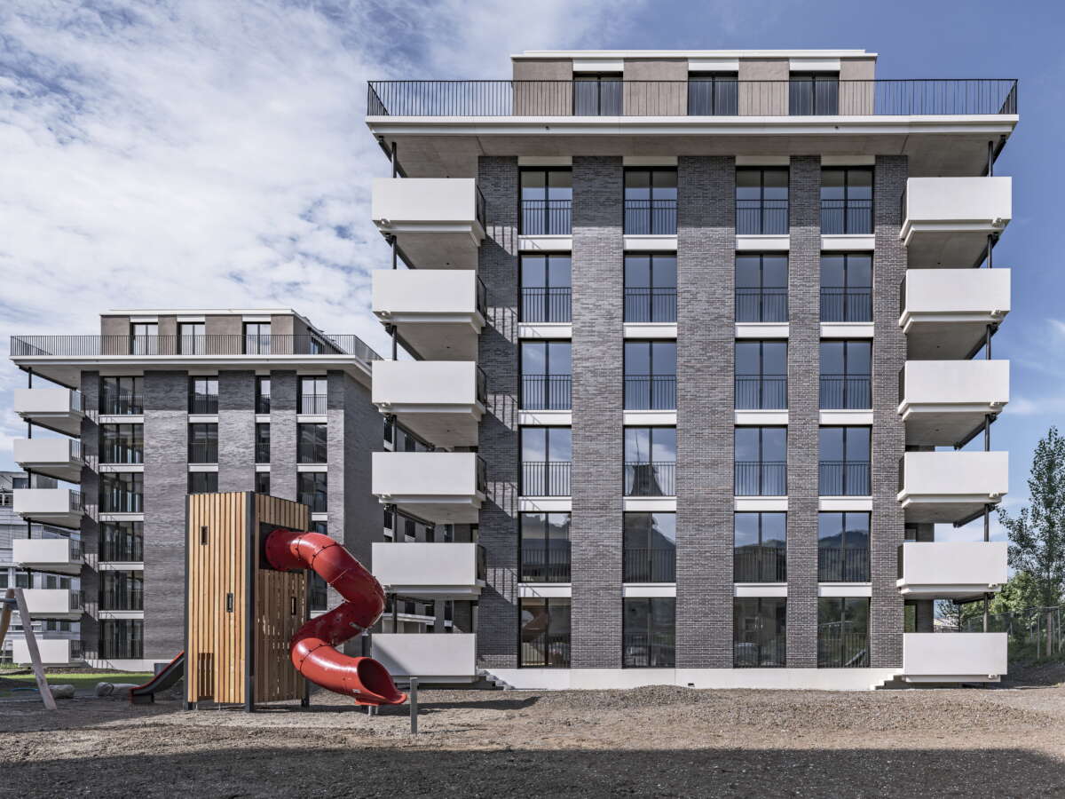 Nach über zehnjähriger Entwicklungszeit erfolgte 2022 der Spatenstich zu «Nova Port», dem zum Ortszentrum nächsten Baufeld: Hier machen vier Punktbauten sowie ein Silo als Zeitzeuge den Arealauftakt. Auch diese Häuser versetzt zueinander angeordnet, was abwechslungsreiche Ausblicke auf die Muota und die Bergkulisse gewährt. Zugleich entstehen zwischen den Vierspännern fein justierte Freiräume, die eine optimale Besonnung der insgesamt 101 Mietwohnungen mit ihren ausladenden Eckloggien erlauben. Zudem erhält die reiche Geschichte der ehemaligen Zementfabrik in den Bauten dank Klinkerfassaden und vorfabrizierten Betonelementen eine Reminiszenz. (mc)
