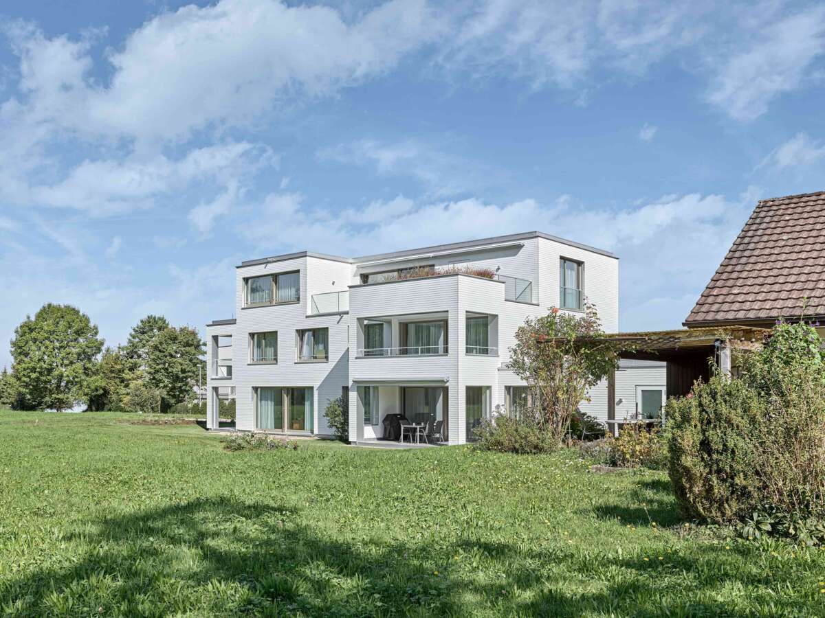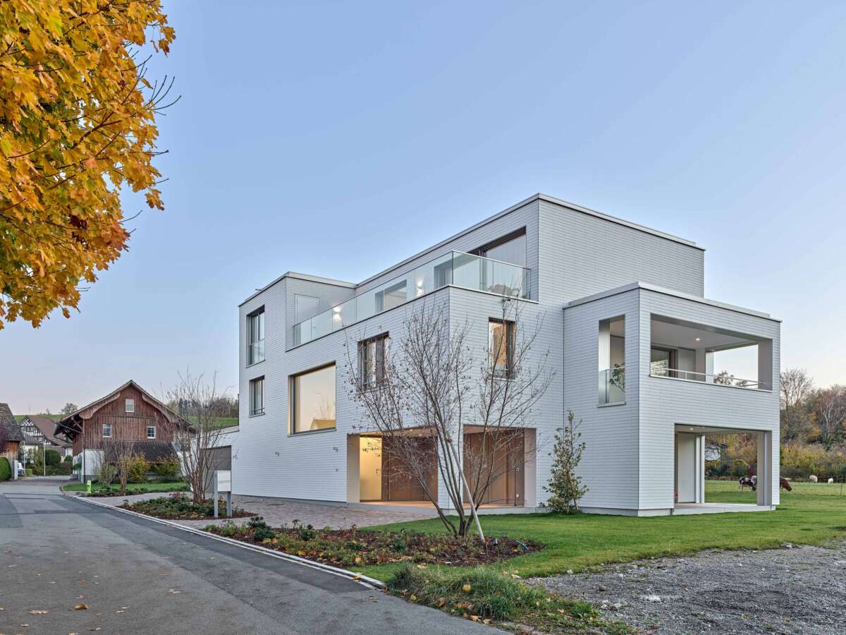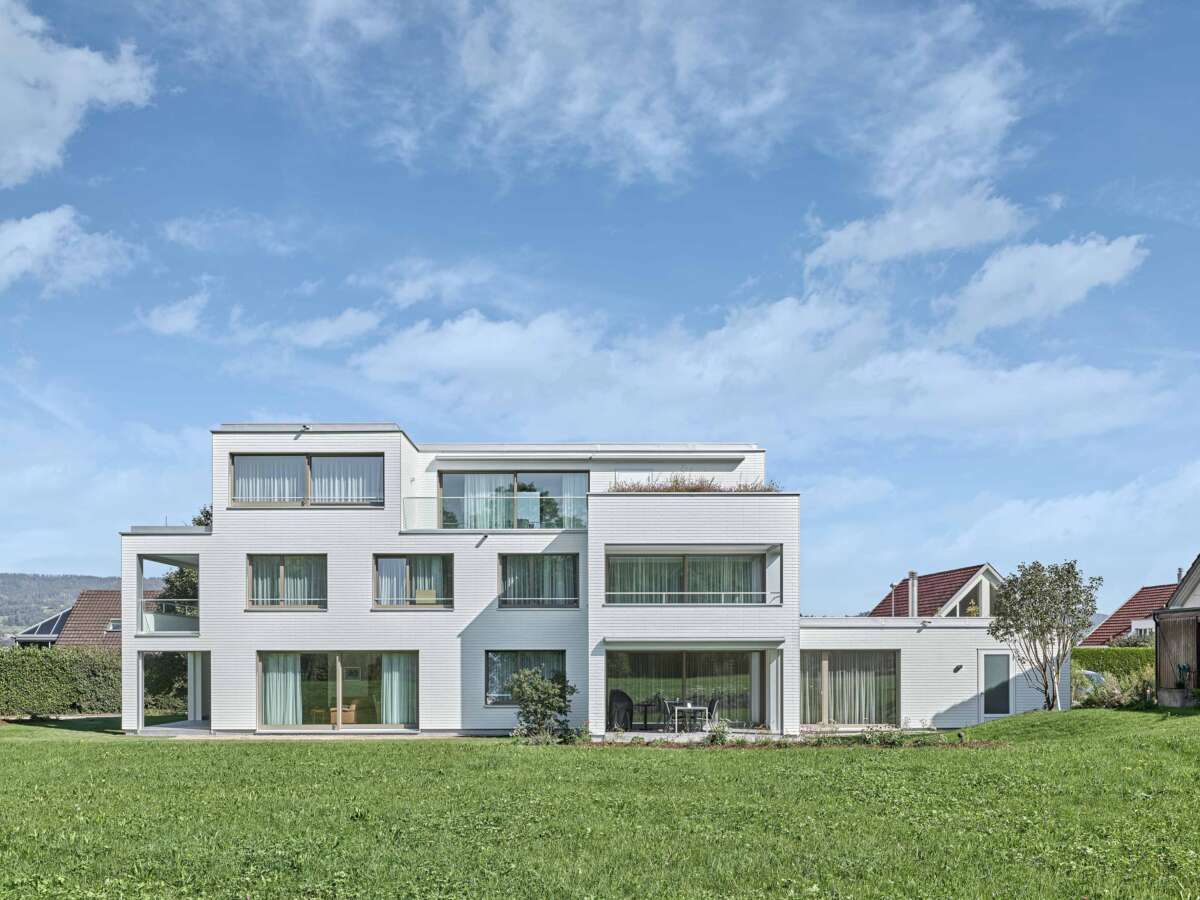 Die Alte Landstrasse ist eine historische Route, die entlang des Seeufers mäandriert. Hier auf einem Plateau in Hanglage und mit schönster Sicht auf den See, steht eine kubische Villa. Sie wurde auf Basis eines orthogonalen Volumens in eine städtebaulich wie baurechtlich angemessene Dimension gebracht, um sodann mittels körperhafter Aufbauten, Einschnitten und Loggien die topografischen Qualitäten in Szene zu setzen. Eine eigens aus dem Volumen ausgelagerte Garage schafft als Erweiterung der Hauptfassade gebührend Abstand zur benachbarten Scheune – sowie eine differenzierende Annährung an das Haus.