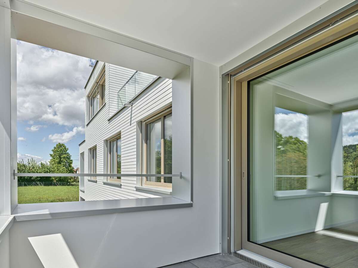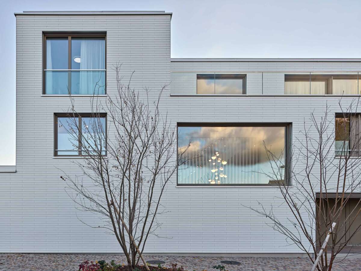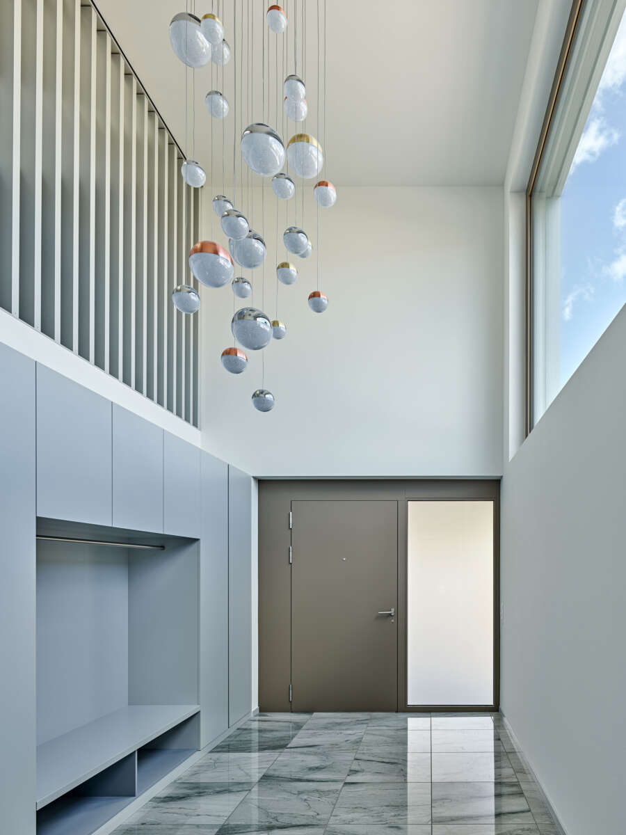An der langen Eingangsfassade ist das Spiel von Geschlossenheit und Offenheit der Blickinszenierung auf den See gewidmet. Ein hoch liegendes Fenster gewährt einen knappen Einblick ins Innere. Richtung Süden zum Landwirtschaftsidyll dominieren die privaten Freiräume wie Loggien, Terrassen und ein Pflanztrog. Das von der Erdenschwere leicht abgesetzte Haus wird über ein doppelstöckiges Entree betreten, das als Ort der Ankunft und kurzfristigen Verweilens dient. Es bietet eine Vielzahl von Zugängen, unter anderem zum ebenerdigen Wohn-Essbereich sowie eine interne Verbindung zur Einliegerwohnung.