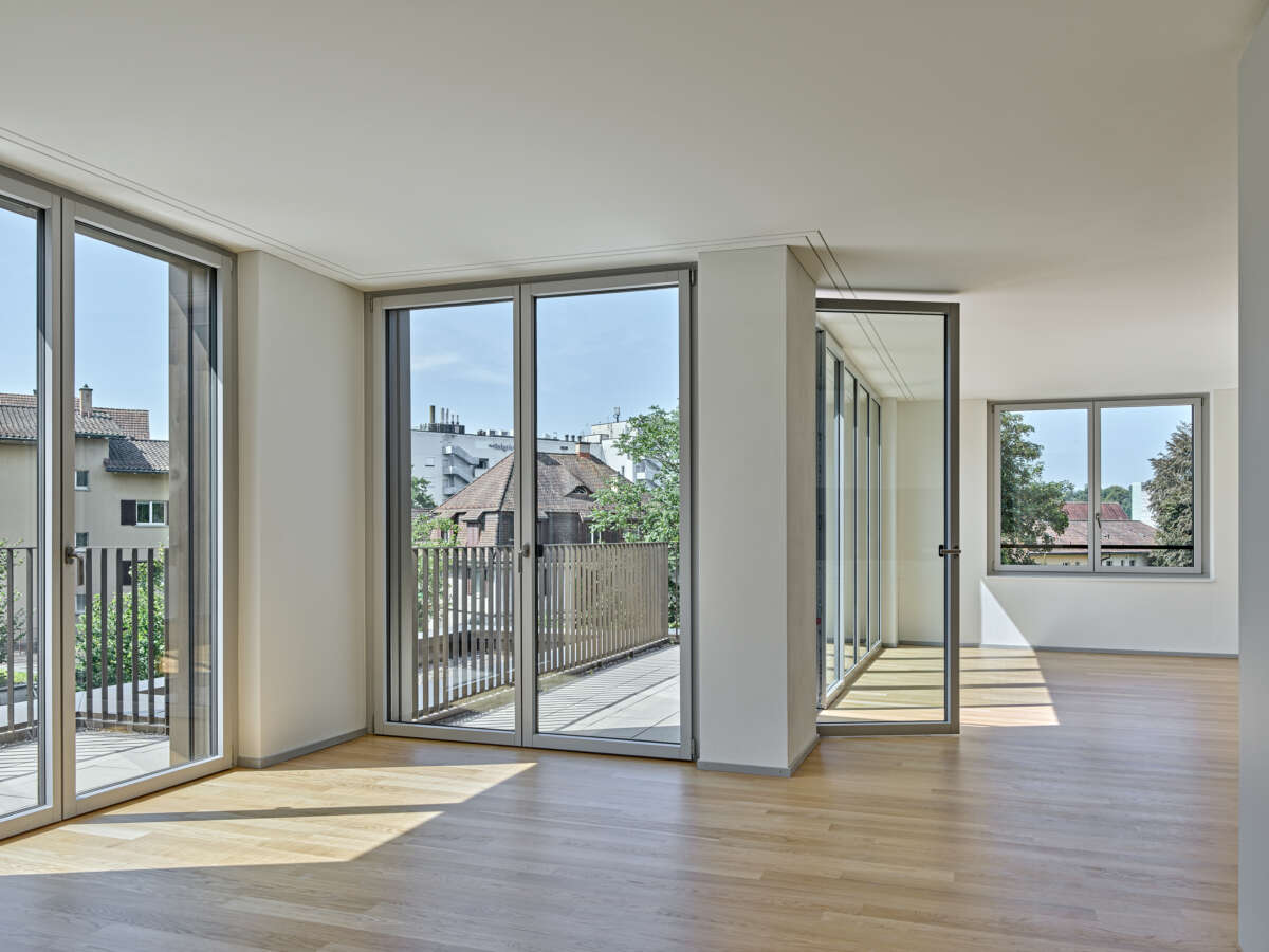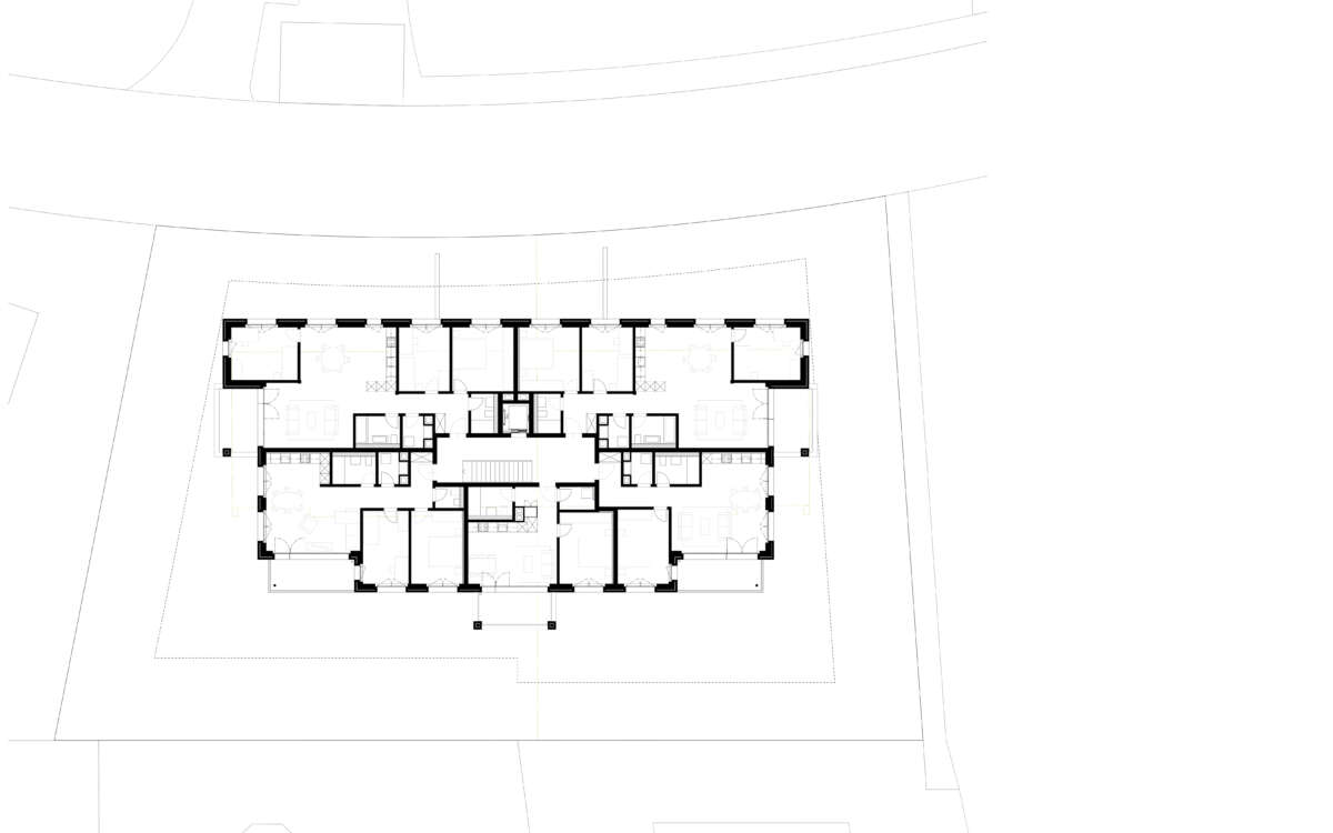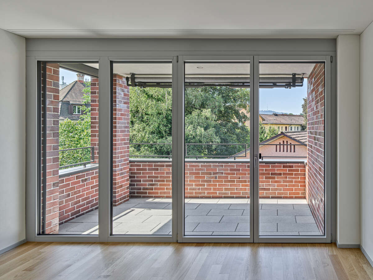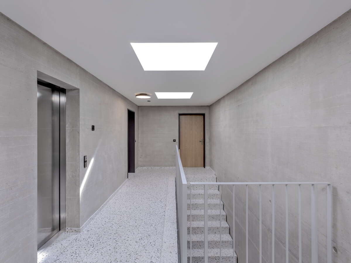Diese Wahrnehmung wird von Fensterformaten zementiert, die die Festigkeit und «Stärke» des Materials bewusst inszenieren. Hinter der regelmässigen Lochfassade gewinnt das Haus indes an räumlicher Transparenz: Das Übereck-Wohnen erweitert sich in den Räumen vorgelagerte Loggien. Dank der südseitigen Abtreppung des Baus kommt jede Einheit in den Genuss eines schönen Grünausblicks sowie diagonaler Raumbezüge. Dabei sind alle Wohnungen des Fünfspänners symmetrisch um einen effizienten Treppenkern angeordnet. Als changierender Abschluss fungiert ein aus Metallprofilen verkleidetes Attikageschoss in dunklem Kupferton, das den Traufhöhen den visuellen Vortritt lässt. (mc)