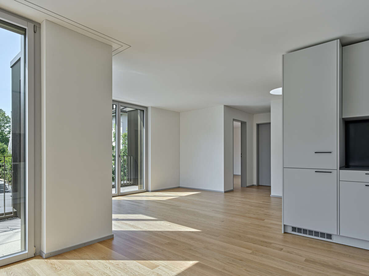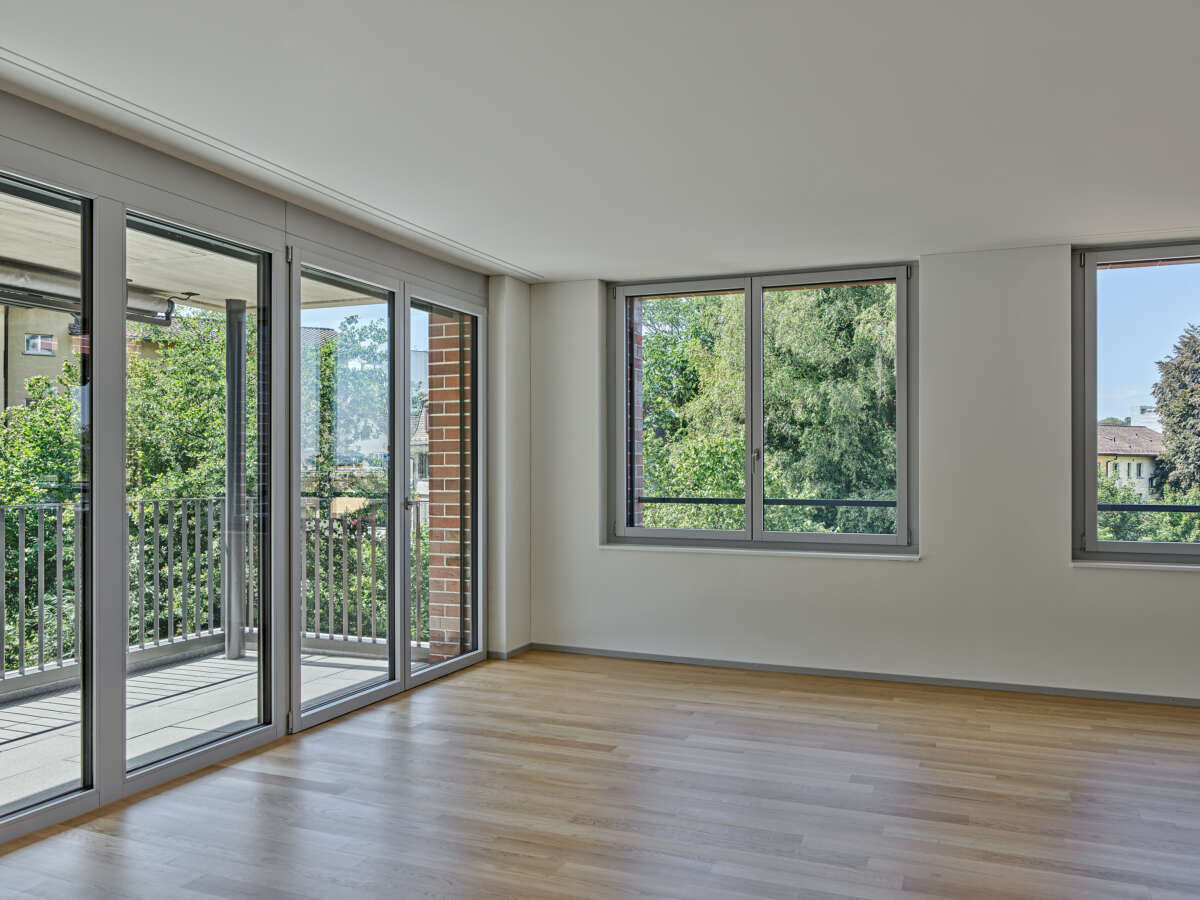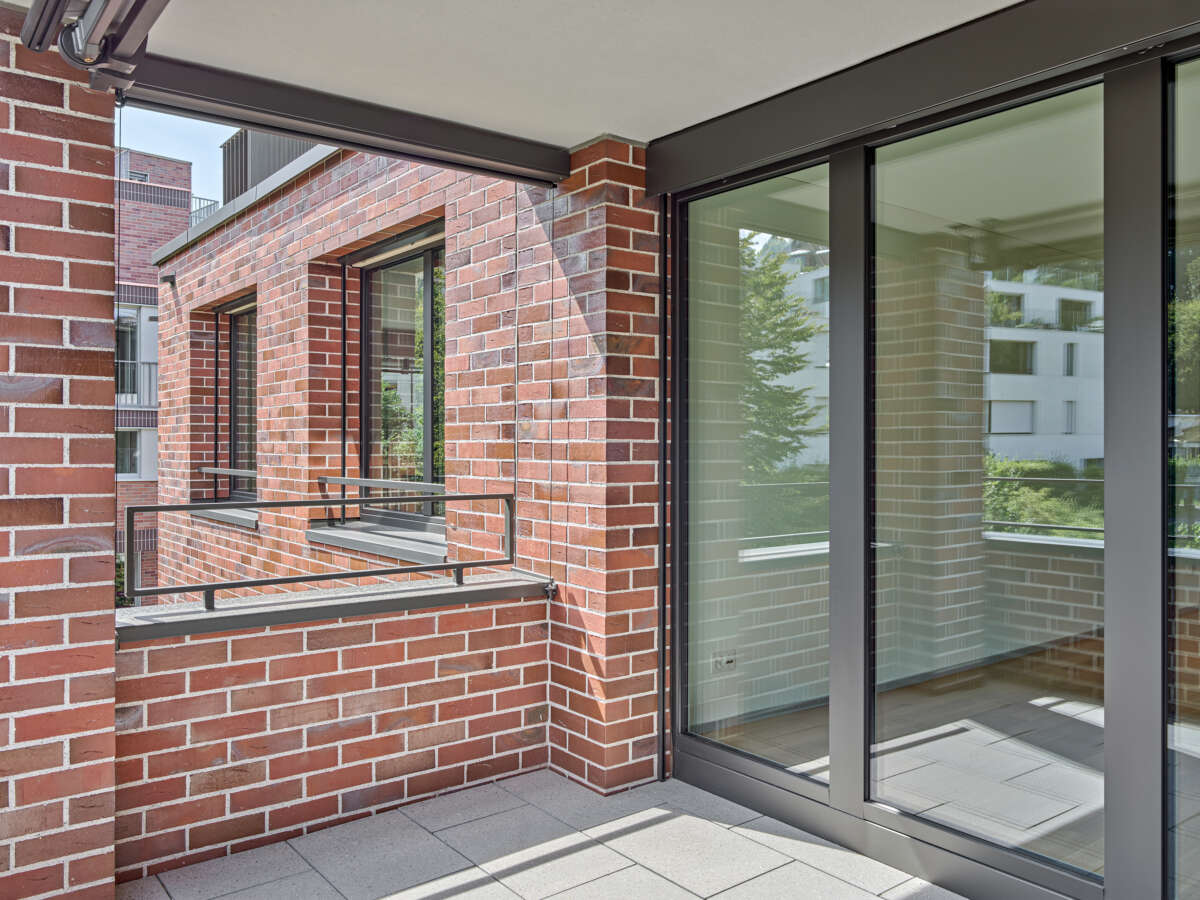 Diese Wahrnehmung wird von Fensterformaten zementiert, die die Festigkeit und «Stärke» des Materials bewusst inszenieren. Hinter der regelmässigen Lochfassade gewinnt das Haus indes an räumlicher Transparenz: Das Übereck-Wohnen erweitert sich in den Räumen vorgelagerte Loggien. Dank der südseitigen Abtreppung des Baus kommt jede Einheit in den Genuss eines schönen Grünausblicks sowie diagonaler Raumbezüge. Dabei sind alle Wohnungen des Fünfspänners symmetrisch um einen effizienten Treppenkern angeordnet. Als changierender Abschluss fungiert ein aus Metallprofilen verkleidetes Attikageschoss in dunklem Kupferton, das den Traufhöhen den visuellen Vortritt lässt. (mc)
