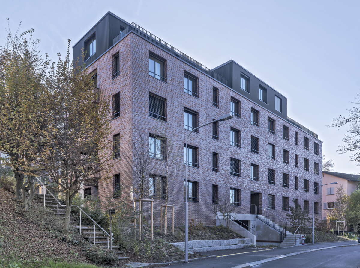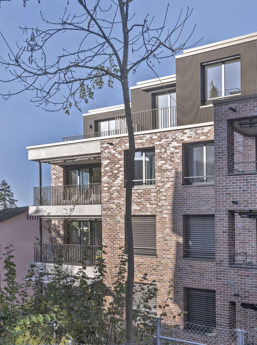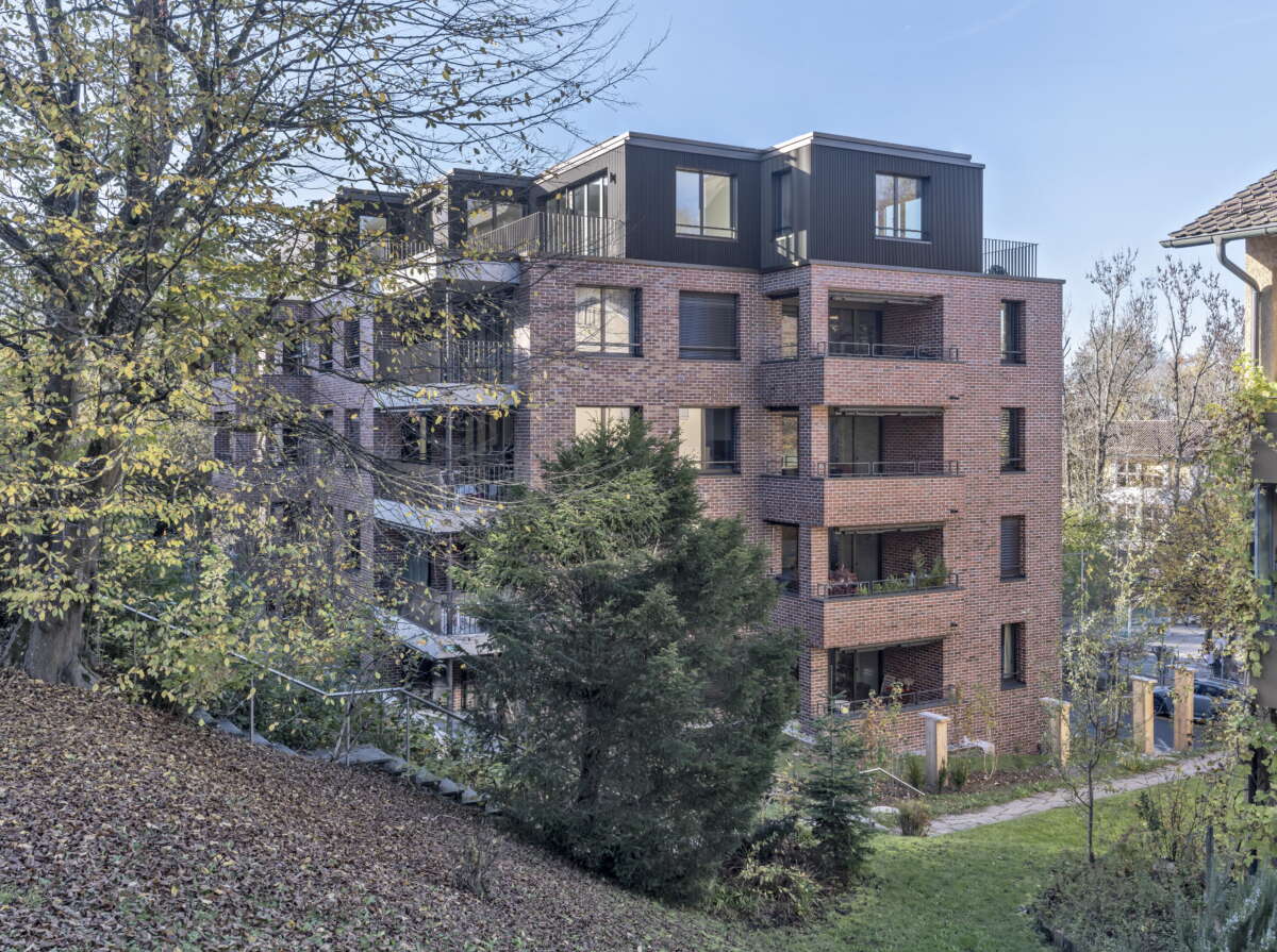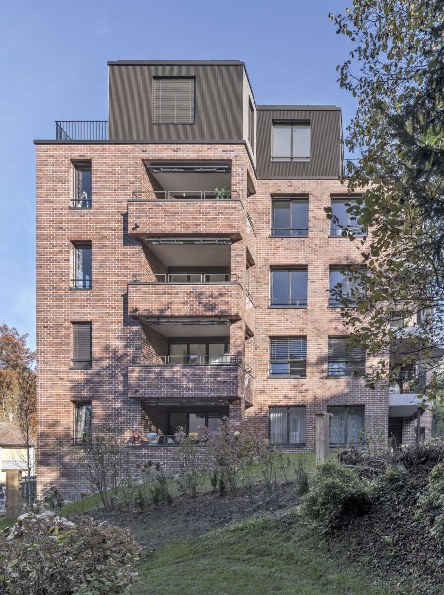 Tatsächlich ergab sich für den fraglichen Standort ein massives Verdichtungspotential von 233% – d.h. anstelle von 12 Wohnungen künftig deren 24, vorgeschlagen in einem kompakten Ersatzneubau. Allein die Lage am Hang hat den abgetreppten Baukörper massgeblich beeinflusst und sie auch für die speziell artikulierte Eingangspartie zu nutzen gewusst. Eine zweischalige Klinkerfassade sorgt für eine hochwertige Erscheinung an der privilegierten Wohnlage. Sie unterstreicht den kompakten, in sich ruhenden Eindruck des Hauses. Ebenso tritt sie der von der Strasse zurückversetzten Schule vis-à-vis mit ortsbaulicher Robustheit gegenüber.