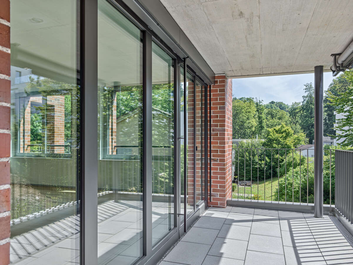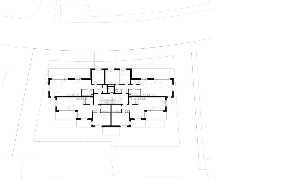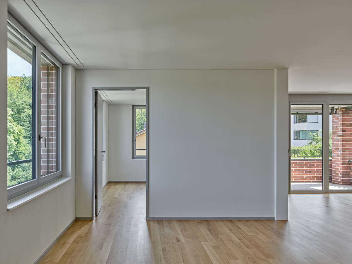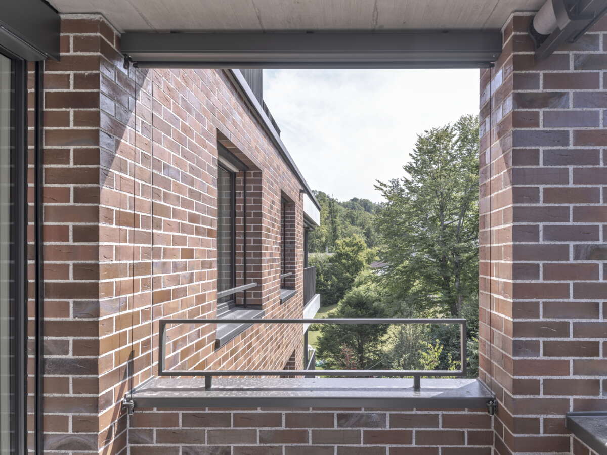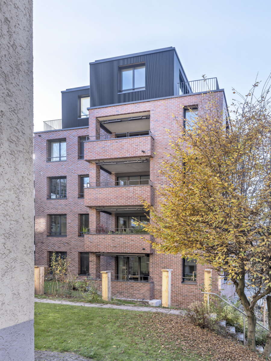 Tatsächlich ergab sich für den fraglichen Standort ein massives Verdichtungspotential von 233% – d.h. anstelle von 12 Wohnungen künftig deren 24, vorgeschlagen in einem kompakten Ersatzneubau. Allein die Lage am Hang hat den abgetreppten Baukörper massgeblich beeinflusst und sie auch für die speziell artikulierte Eingangspartie zu nutzen gewusst. Eine zweischalige Klinkerfassade sorgt für eine hochwertige Erscheinung an der privilegierten Wohnlage. Sie unterstreicht den kompakten, in sich ruhenden Eindruck des Hauses. Ebenso tritt sie der von der Strasse zurückversetzten Schule vis-à-vis mit ortsbaulicher Robustheit gegenüber.