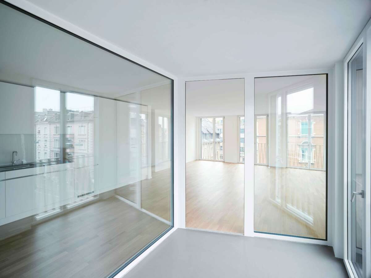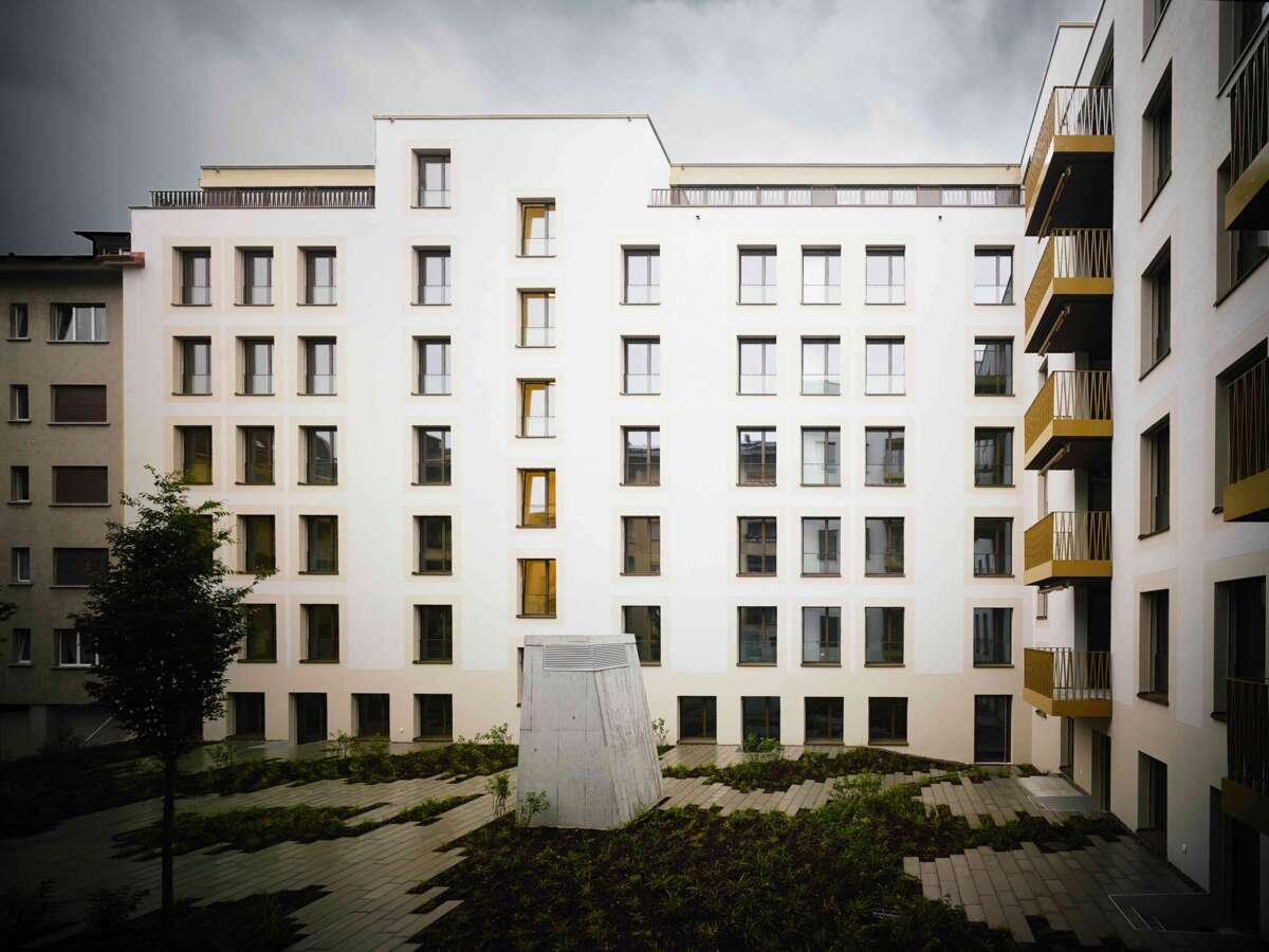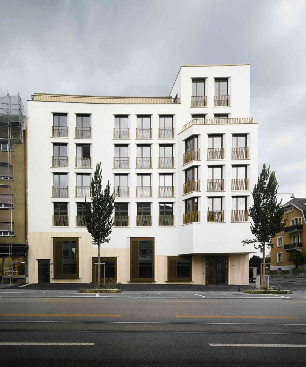 Die Gliederung der Fassade in Sockel, Mittelteil und Attika sowie spurenhafte Versatzstücke aus der Gründer- und Nachkriegszeit zitieren die heterogene Nachbarschaft. Dabei zeigt das Gebäude zwei Gesichter: Während sich die Hoffassade in ökonomischer Zurückhaltung übt, wirkt die reiche Schauseite zur Strasse hin eigentümlich vertraut – als wäre das Haus schon immer da gewesen. Seine subtile Plastizität und die Verlagerung der Schwerpunkte mittels Erker in die Straßen verleihen ihm nicht nur räumliche Kraft. Zusammen mit den französischen Fenstern und schmückenden Geländern verstärken sie die wohnliche Wirkung. (mc)