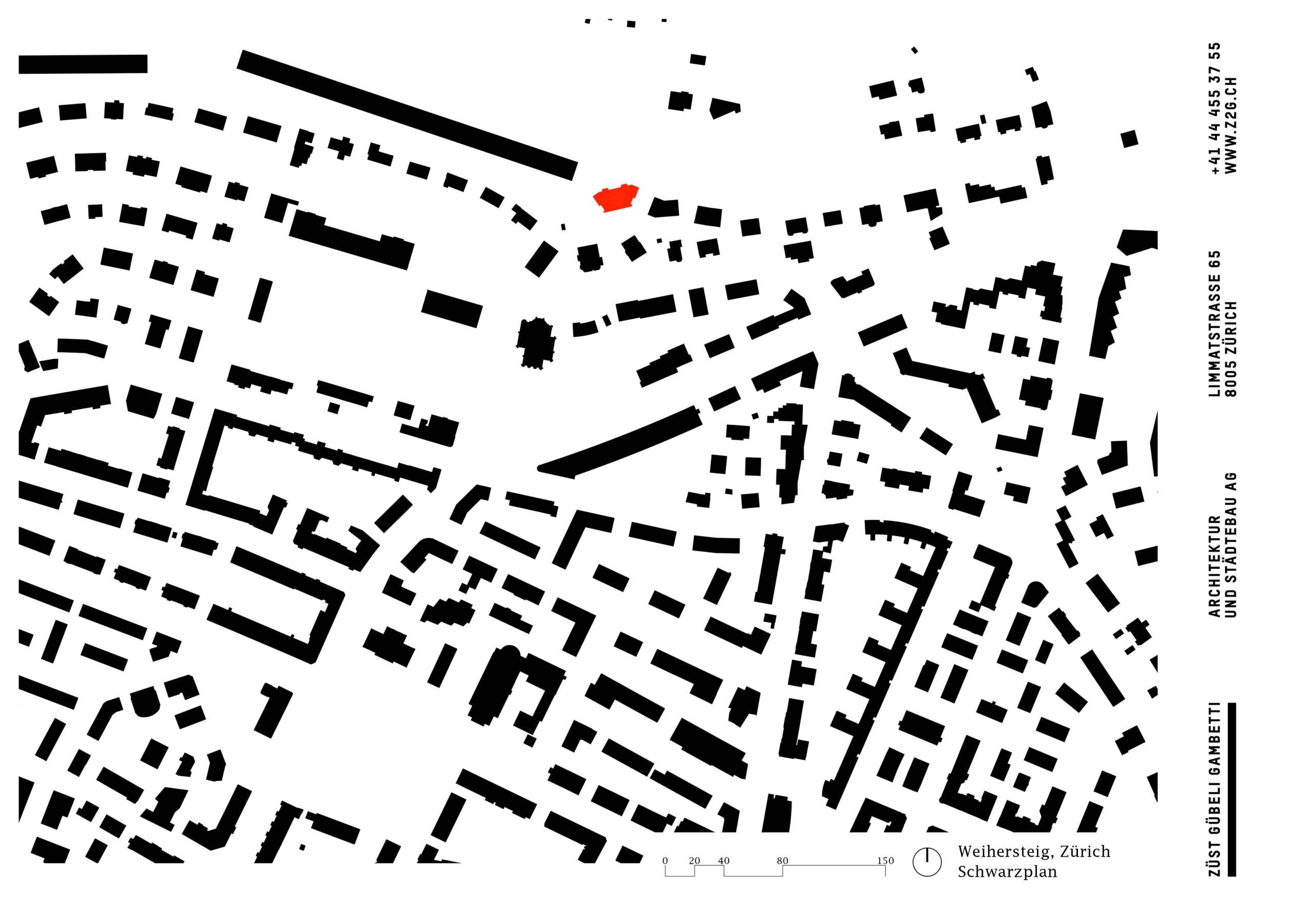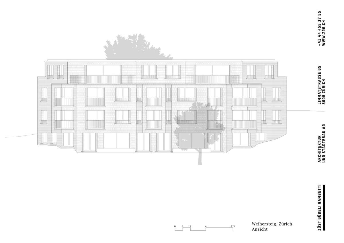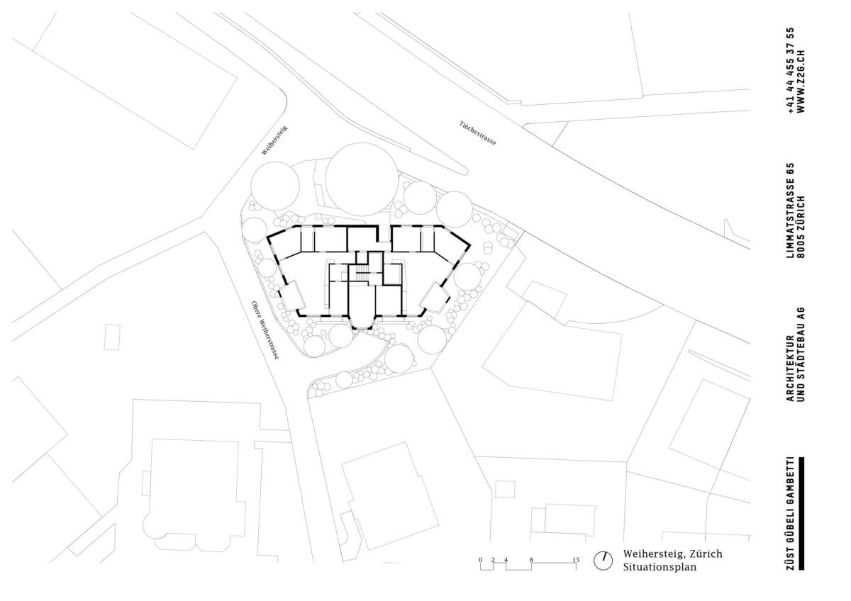 Im Rücken die stark befahrene Tièche-Strasse, hangabwärts das beinahe dörfliche Bild aus Punkthäusern und einer Kirche, im Westen der kolossale Riegel einer Genossenschaft: Der Ersatzneubau von Züst Gübeli Gambetti ist umringt von einer denkbar gemischten Nachbarschaft. Seine polygonale Form ist der Parzellenform geschuldet, deren baurechtliche Möglichkeiten er ausreizt. Zugleich passt er sich bestens in das heterogene Umfeld ein. Die Hauptrolle kommt indes einer wuchtigen Rotbuche zu; von der Strasse her ist zunächst nur die Krone sichtbar, dann schiebt sich der eigens für den Baum zurückversetzte Backsteinbau ins Sichtfeld.