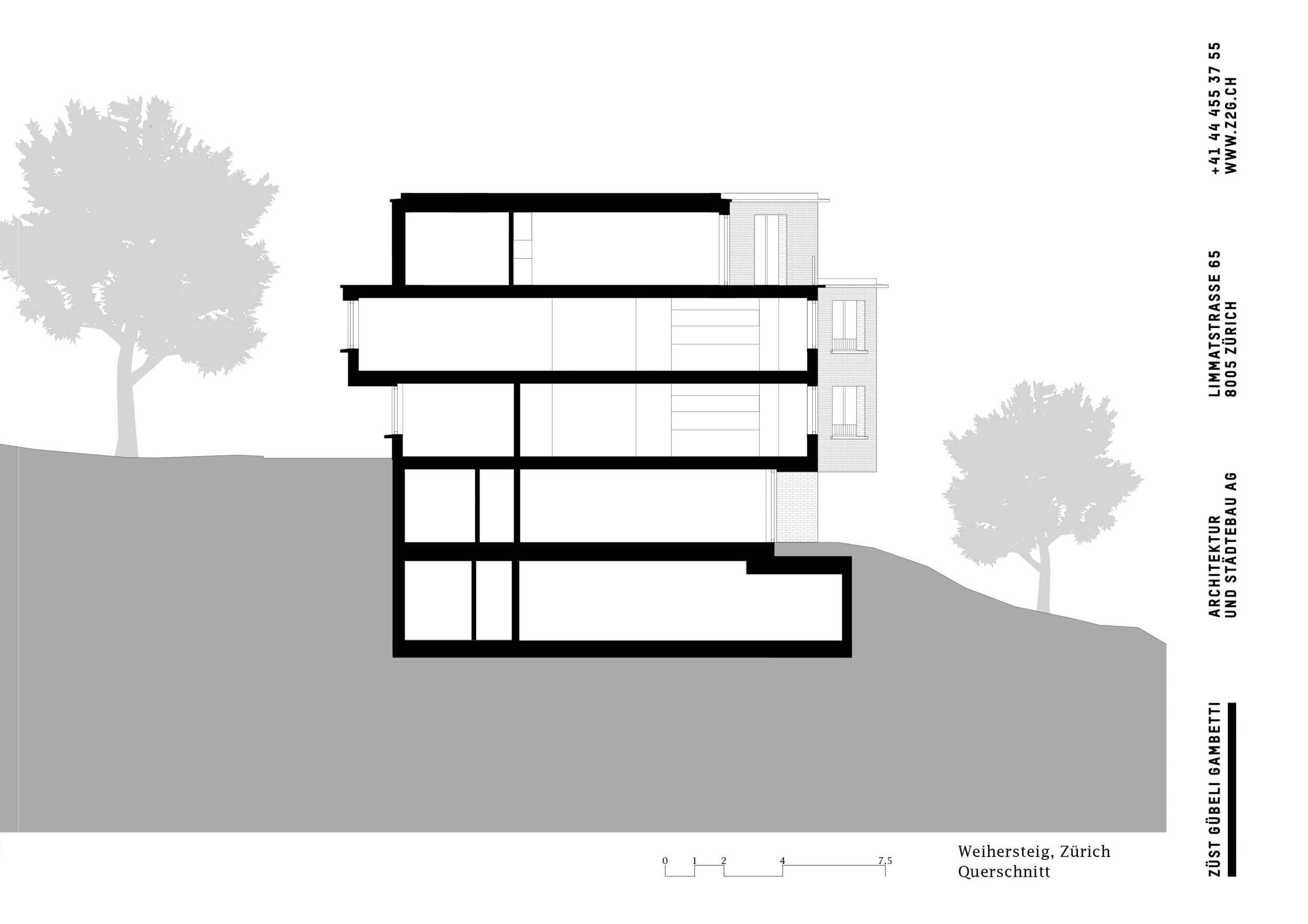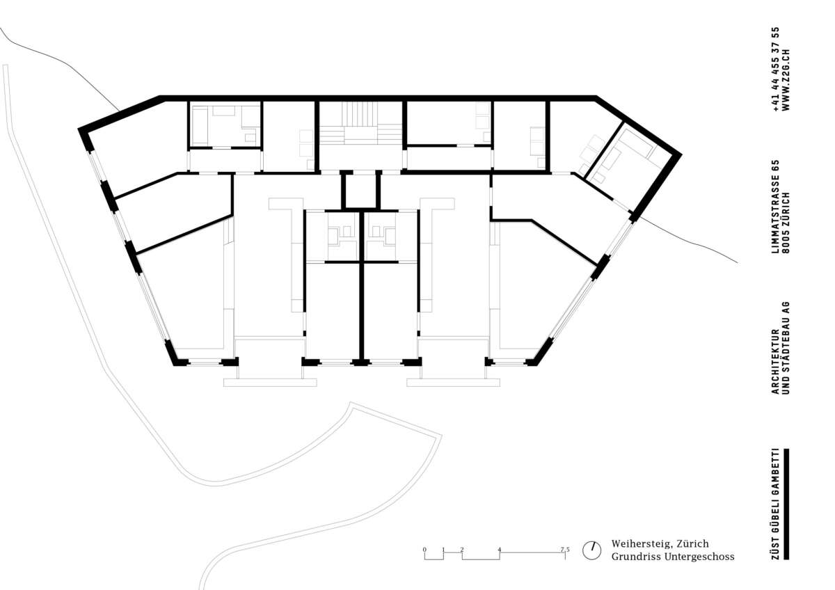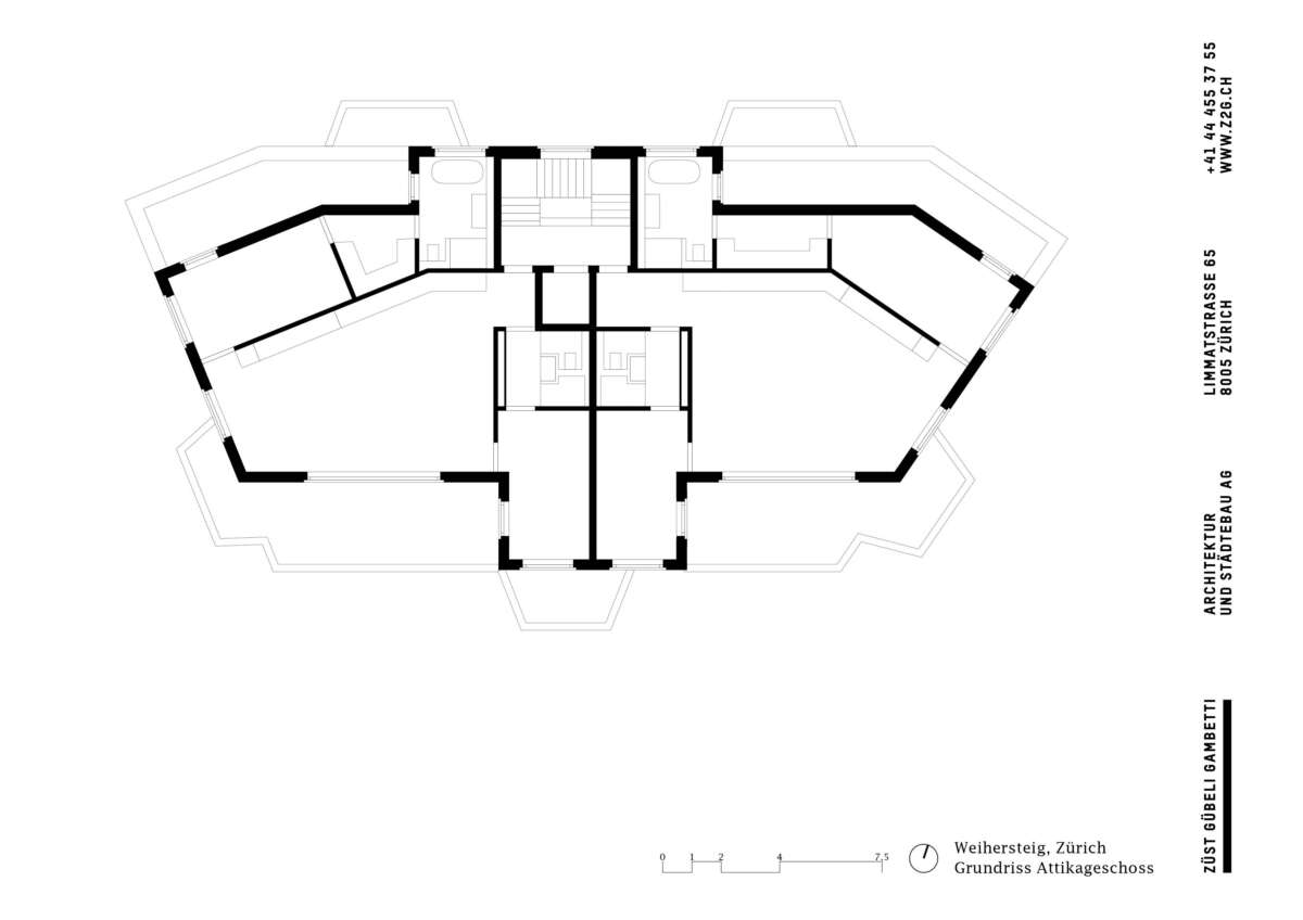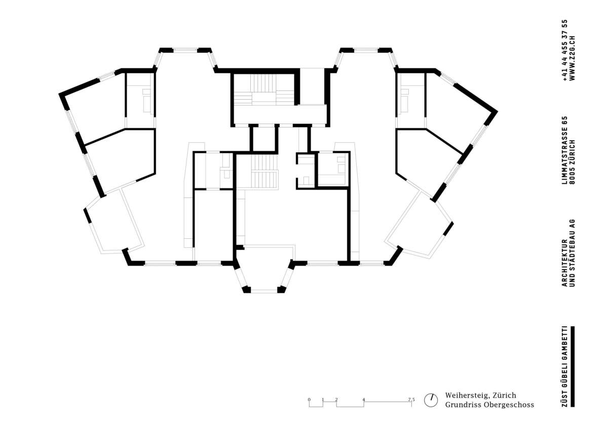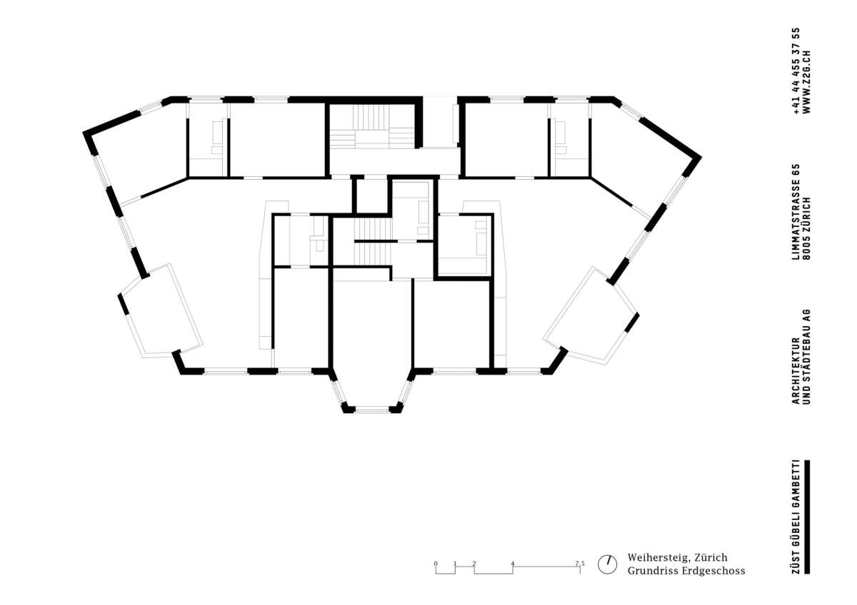 Der Dreigeschosser mit Attika nimmt sieben Wohnungen in sich auf, wobei sich seine wahre Grösse erst Richtung Stadt offenbart. Innen herrschen individuelle Wohnungszuschnitte statt gestapelter Kammerspiele. Dank der speziellen Grundform unterscheidet sich die Raumwirkung in jeder Wohnung. Im Grundtyp sorgt sie für Offenheit und – dank deckenhoher Schiebetüren – für Durchblicke von Fassade zu Fassade. Äussere Raumschichten nehmen Schlafkammern und Bäder auf. Dazwischen schieben sich trichterförmige Wohnräume, deren Fenster, Erker und Loggien das Aussen wie Bilder rahmen.