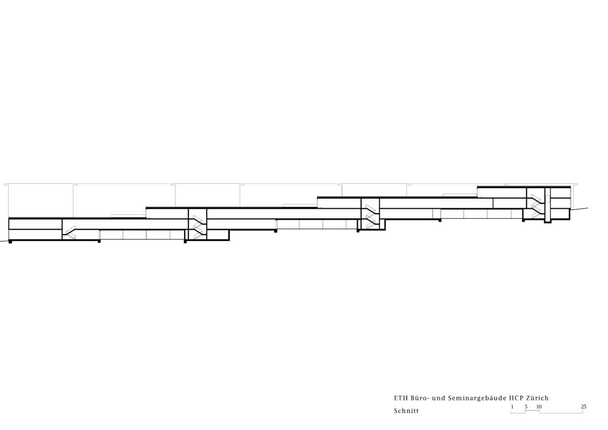 Durch die langgestreckte, gestaffelte Form entfaltet der lange Stapel eine ganz besondere Präsenz. Mit Respekt vor seinem grossen Bruder, dem Chemiegebäude HCI, duckt er sich, ohne sich unterzuordnen und markiert mit ihm den Auftakt zur Science City. Bei seiner horizontalen Expansion macht sich der 200-Meter-Bau die Topografie zu Nutze. Willkommener Effekt ist eine spezielle Schnittlösung, die nur einen einzigen Lift im Gebäude bedingt. Ebenso entstehen quasi umsonst vielseitig nutzbare überdachte Bereiche und Terrassen. Im Zusammenspiel mit dem Chemie-Riesen formieren sie sich zu hofartigen Aussenräumen und eröffnen Durchblicke in die Landschaft.