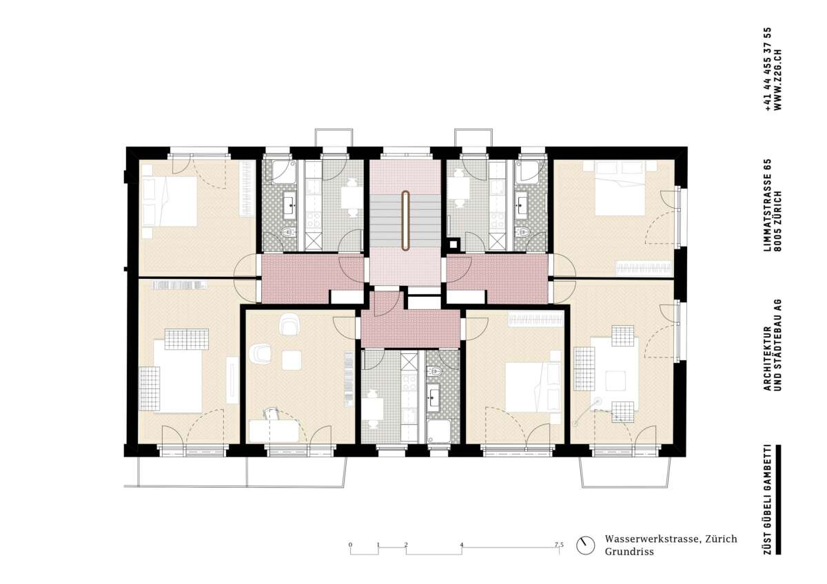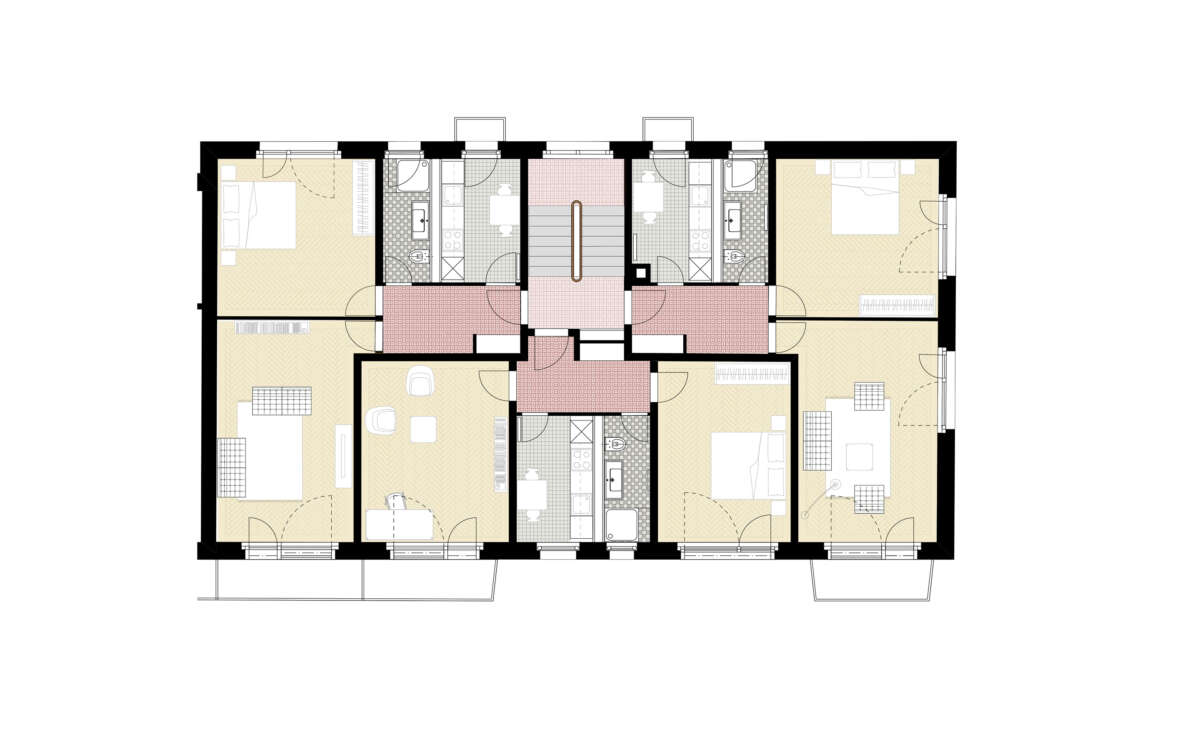 Aufgrund ihrer citynahen, aber lärmbelasteten Lage sowie einer Höhenbeschränkung wurden Szenarien für einen Ersatzneubau verworfen und stattdessen Kleinwohnungen für ein junges, urbanes Publikum anvisiert. Diese, nicht zu teuer, erforderten einen einfachen Ausbaustandard. Züst Gübeli Gambetti minimierte die baulichen Eingriffe und beschränkten sich mit Haustechnik, Nasszellen, Oberflächen und Hülle auf das Notwendigste. Aussen wie innen sollten die Gebäude im Ausdruck und den ihnen eigenen Raumqualitäten erhalten bleiben und nur eine respektvolle Auffrischung erfahren.