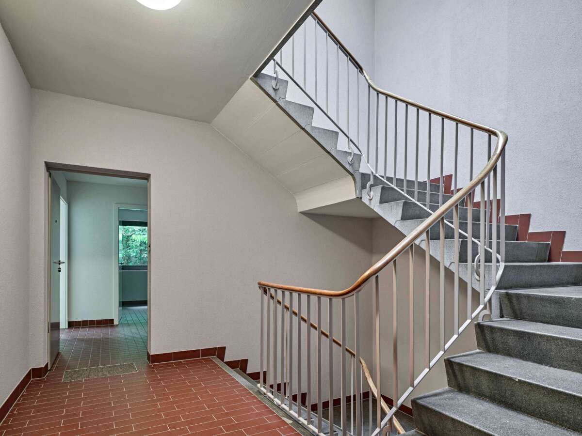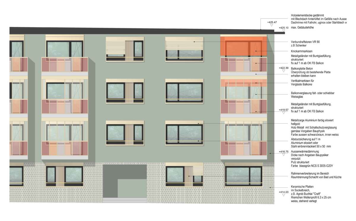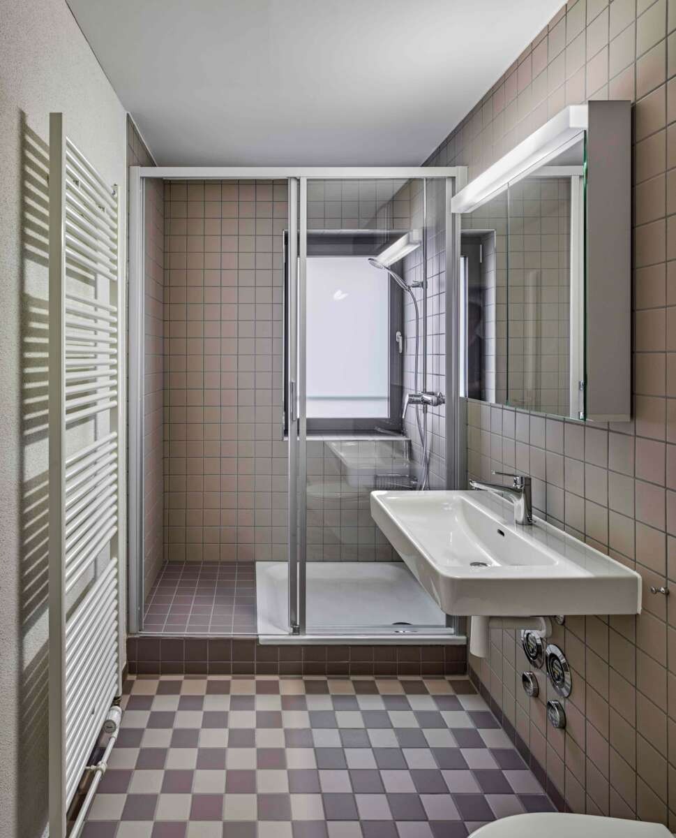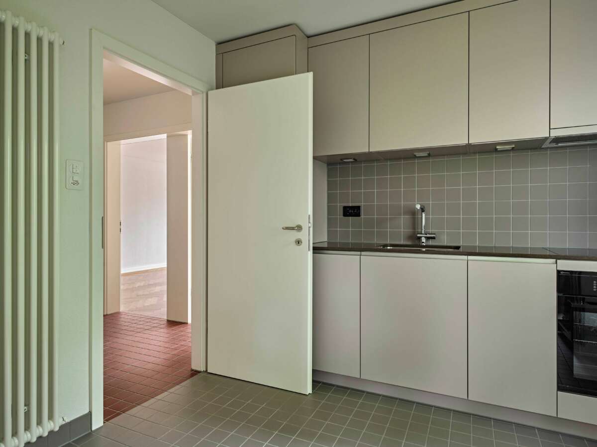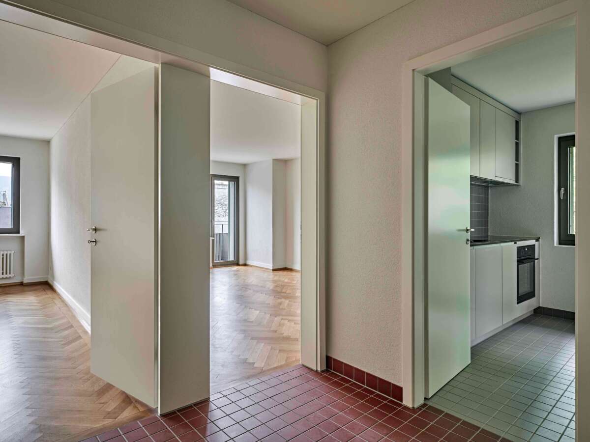 Waren im Vorprojekt noch ein Klinkersockel sowie Balkonverglasungen im Gespräch, deren einzige Extravaganz ornamentale Buntglasfüllungen gewesen wären, fielen diese der Kostenschere zum Opfer. Indes erfolgte eine visuelle Entrümpelung: Anstelle des Bestandsorange wurde für die Fassade ein schmutzresistentes Graugrün gewählt und Fenster, Markisen und Brüstungen farblich abgestimmt. Mit Akribie wurden Treppenhäuser und Fischgratböden der Wohnungen restauriert und Beläge, wo erforderlich, interpretierenderweise ersetzt. In den Räumen harmonieren nun gebrochen-weisse Wandfarben mit den warmen Erd- und Grautönen von Küche, Bad und Flur, wie auch die quadratischen Fliesen eine Reminiszenz an die Erbauungszeit sind. (mc)