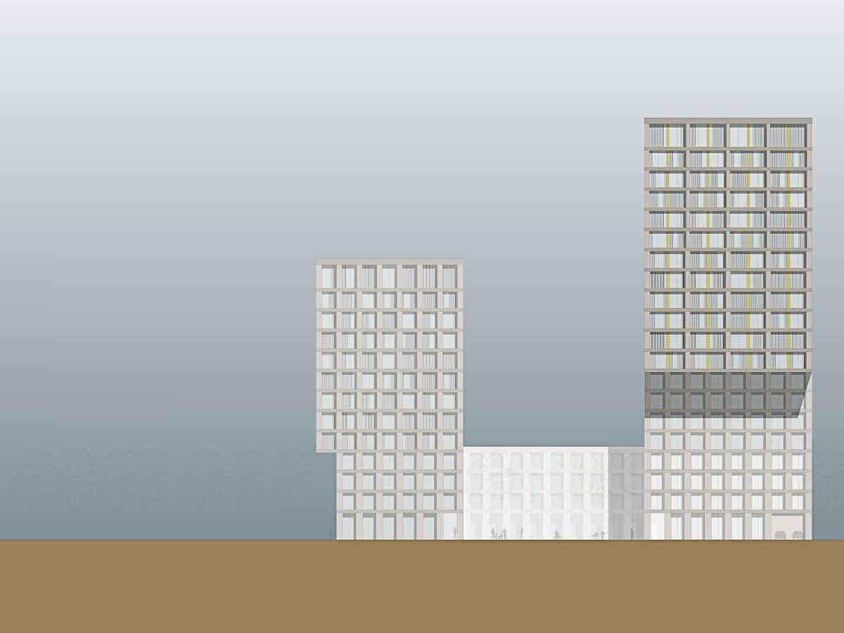 Das Volumen besteht aus drei Teilen: zwei Hochhäuser, mit 12 und 19 Geschossen und einem 3-geschossigen Mittelteil. Mit 40 bez. 60 Metern Höhe beziehen sie sich auf die bestehenden und geplanten höheren Bauten der Umgebung. Je eines der Hochhäuser richtet sich mit einer auskragenden Fassade Richtung Arbon und Richtung Steinach.