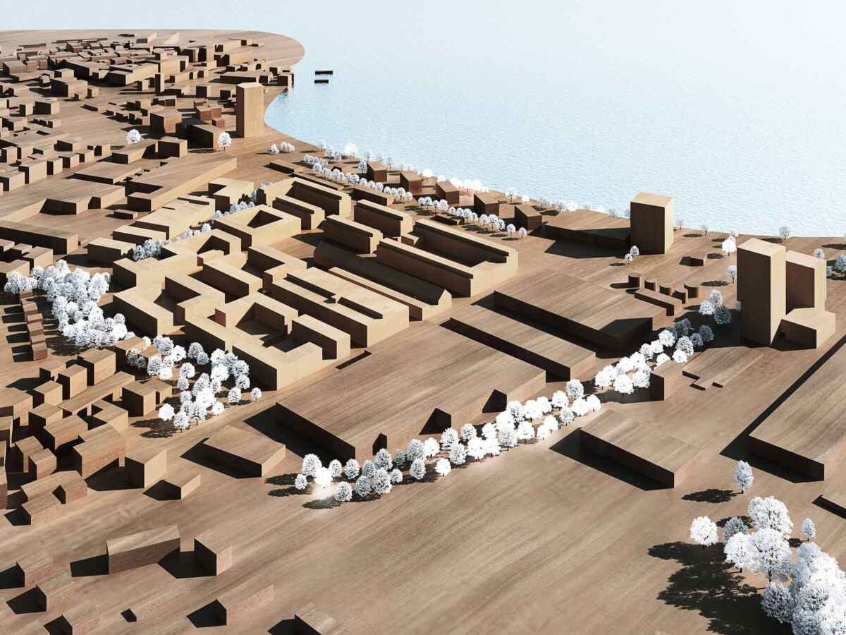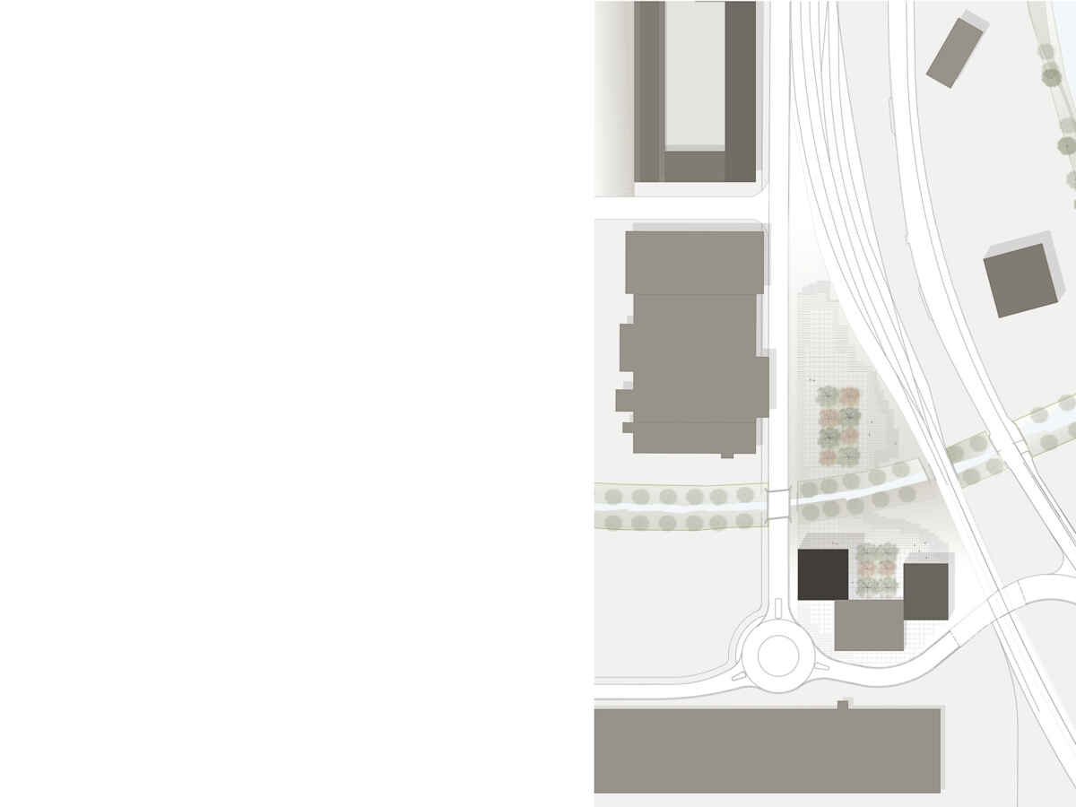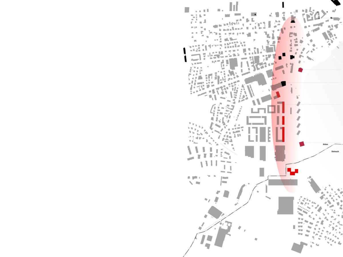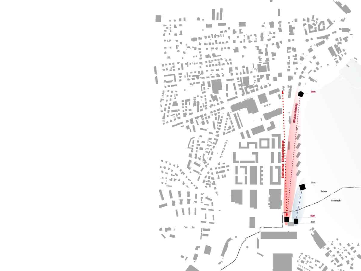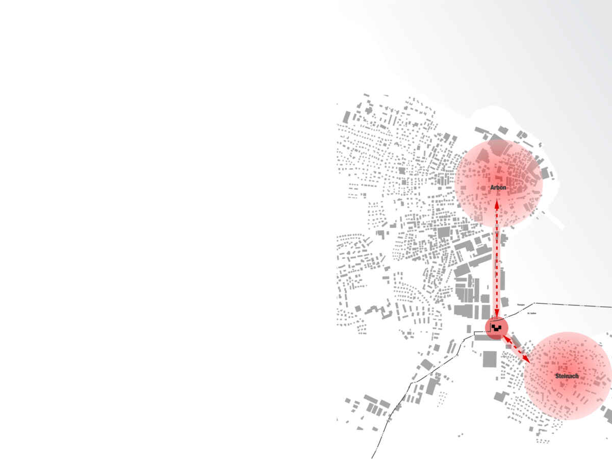 Zwei räumliche Achsen der Städte Arbon und Steinach definieren den Standort des Hochhauses. Durch dessen Lage im Schnittpunkt werden die beiden Stadtgebiete visuell miteinander verknüpft.