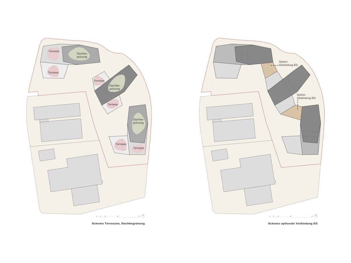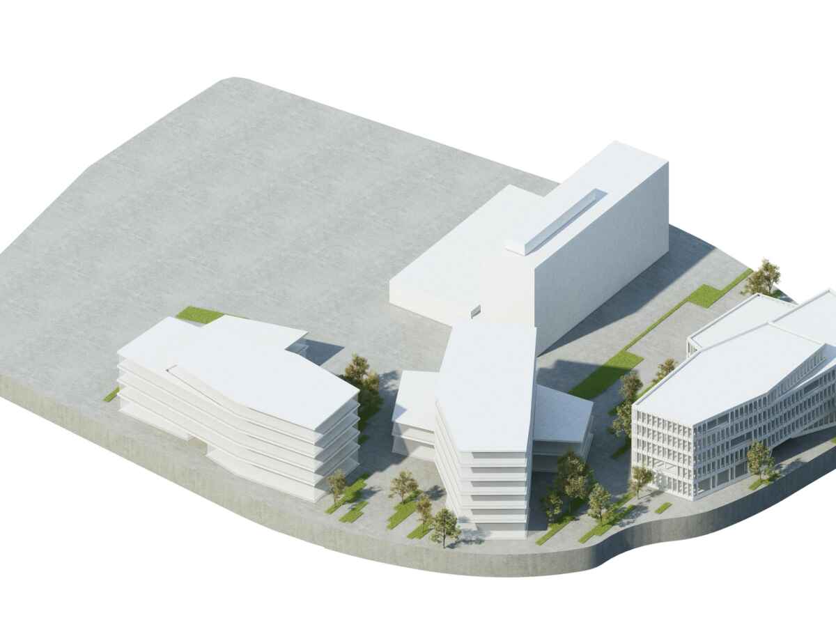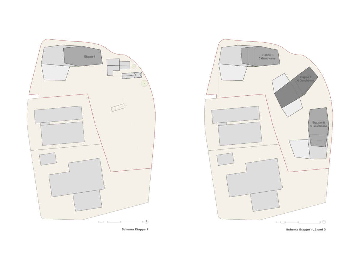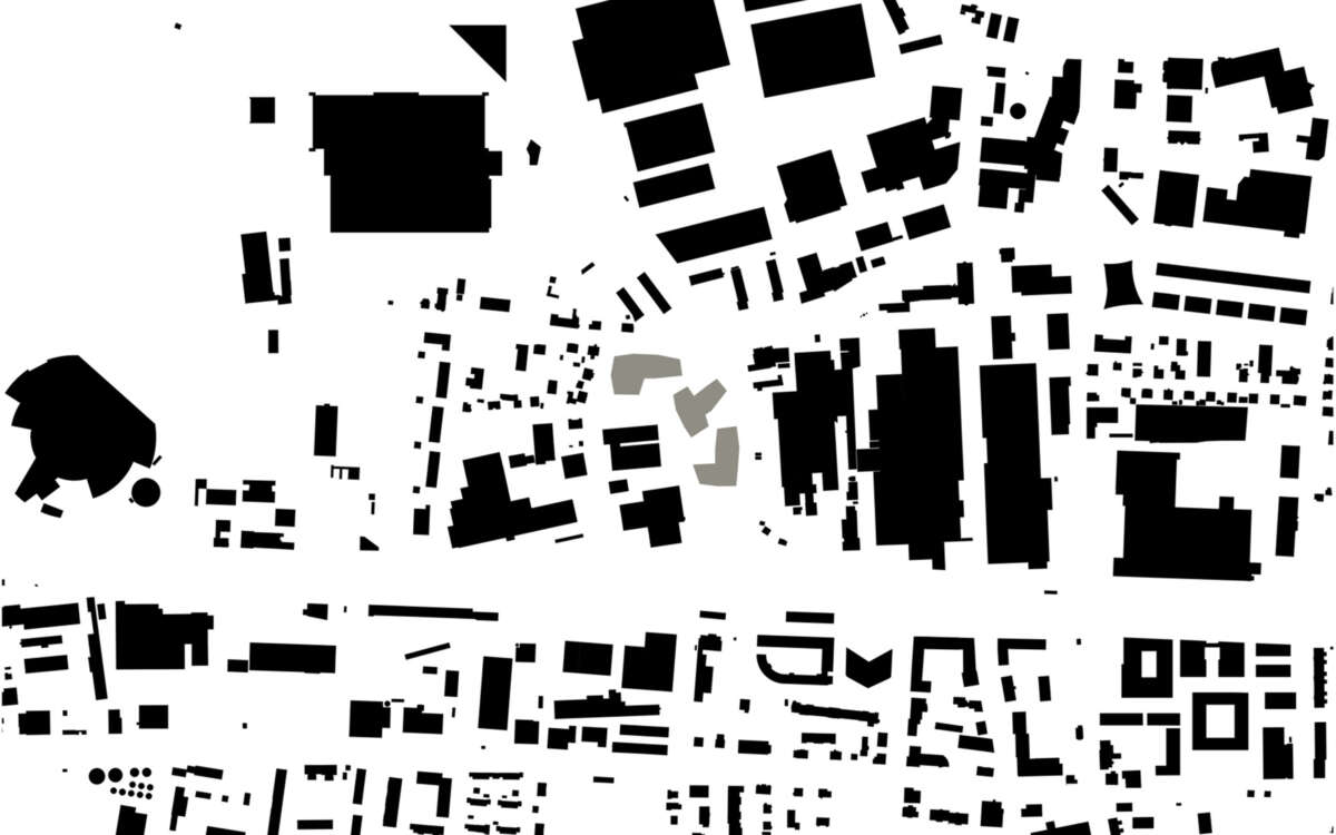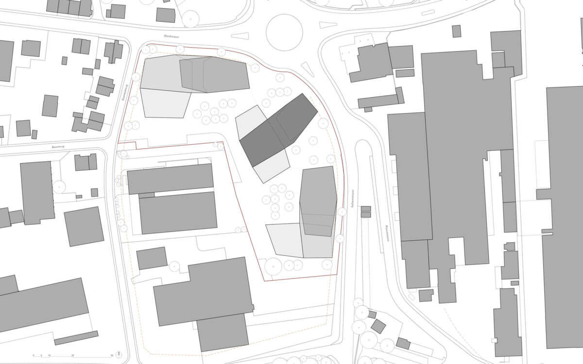 Die neue Bebauung reagiert auf die disperse Situation mit drei Baukörpern, die sich in Etappen zum Ensemble ergänzen. Ihre Höhenstaffelung ist dabei der jeweiligen Lage geschuldet – je nachdem nimmt sie sich zurück oder markiert städtebauliche Präsenz. Knicke und Stufen sorgen nicht nur für den skulpturalen Charakter der Gebäude, sondern auch dafür, dass ihre Masse optisch gebrochen wird. Überhaupt ist alles darauf ausgelegt, dass sich Neubebauung wie auch Freiräume ihrer Umgebung nicht verschliessen, sondern gerade auf der Fussgänger-Ebene einen vitalen Mikrokosmos bieten.
