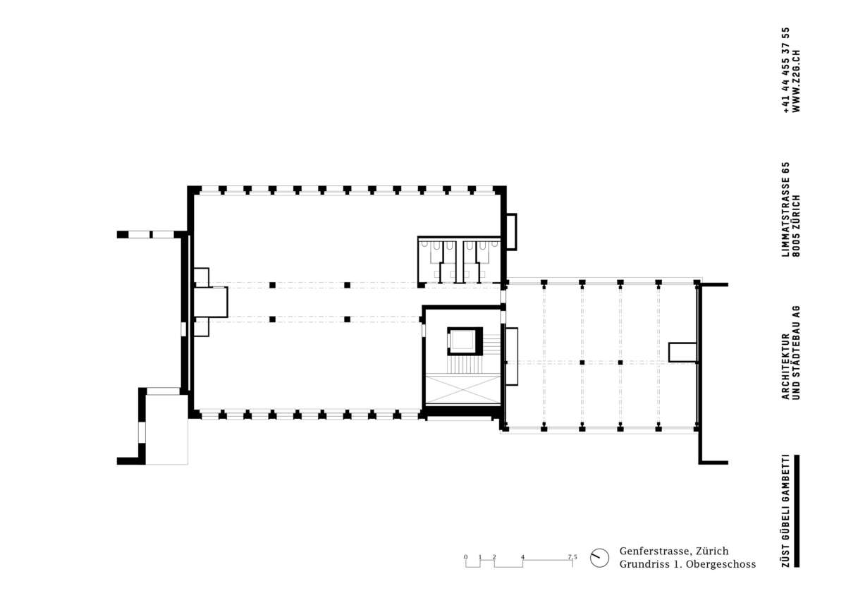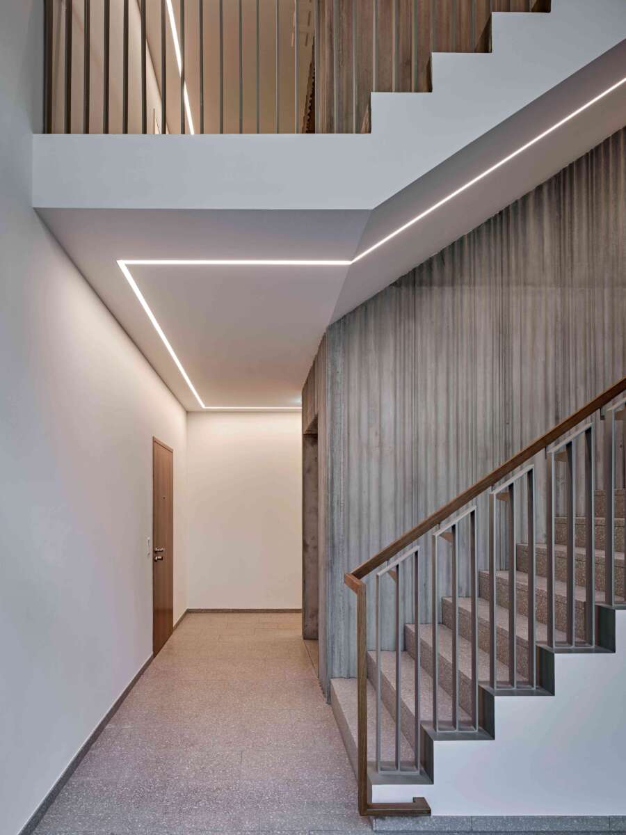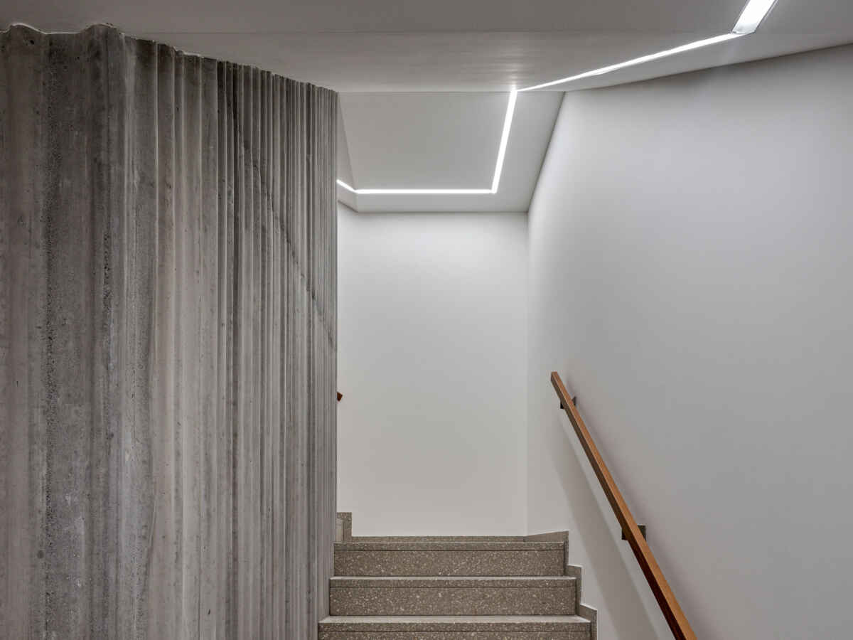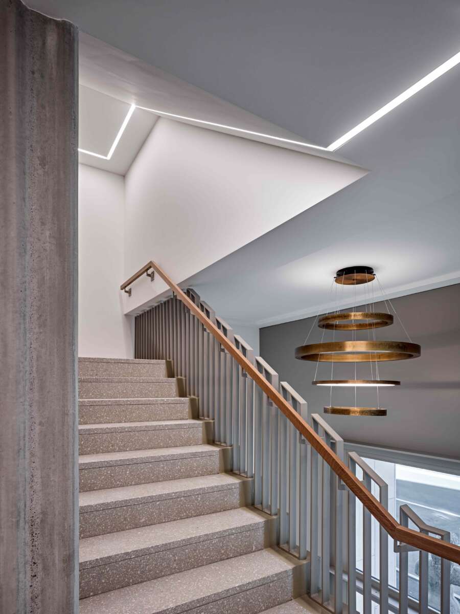 Ihre innere Entrümpelung ging einher mit der Verlegung der Treppe an die Nahtstelle der beiden Häuser. Neu gibt es eine zentrale Halle, die sich als sorgfältig materialisierte Bewegungsachse vertikal über zwei Etagen öffnet. Durch diesen Kniff sowie neu eingeführte Gesimse gelingt es, eine optische Einheit der Gebäude zu erwirken. Darüber hinaus wird mit der Überhöhung der Eingangspartie der klassische Sockel paraphrasiert, um sich im illustren Umfeld zu behaupten. Loch- und Bandfassade erfahren auch über ihre Materialisierung eine interpretierende Angleichung. So entsteht bei aller Verschiedenartigkeit eine elegante neue Hülle, die zugleich zur bildhaft-formalen Einbettung in die Umgebung beiträgt. (mc)