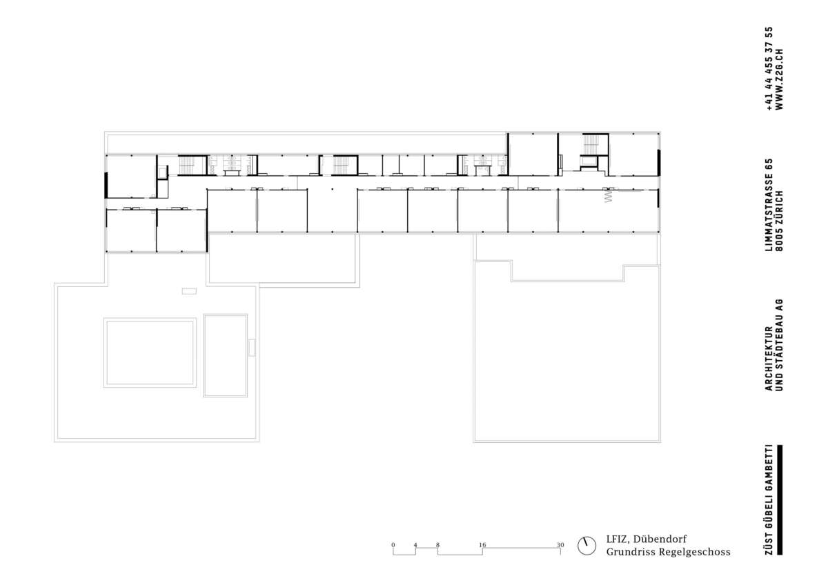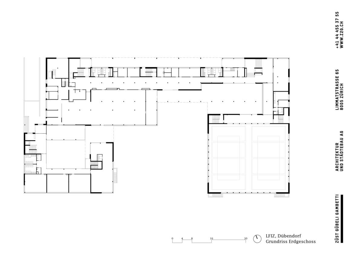 Das dreiteilige Raumgefüge umarmt einen zentralen Aussenraum, der zwischen den einzelnen Bereichen vermittelt. Während in den oberen Etagen des fünfgeschossigen Mitteltrakts die Klassenzimmer zweibündig untergebracht sind, finden sich im Erdgeschoss alle übergeordneten Einrichtungen sowie Foyer und Mensa. Letztere wird im Südwesten vom Kindergarten flankiert. In Reminiszenz an ein Kloster mit Innenhof und Wandelhalle bietet er den Kleinsten eine überschaubare eigene Welt. Sein volumetrisches Äquivalent findet er in der Doppelturnhalle vis-à-vis, die dank separatem Zugang auch den örtlichen Vereinen offen steht. (mc)