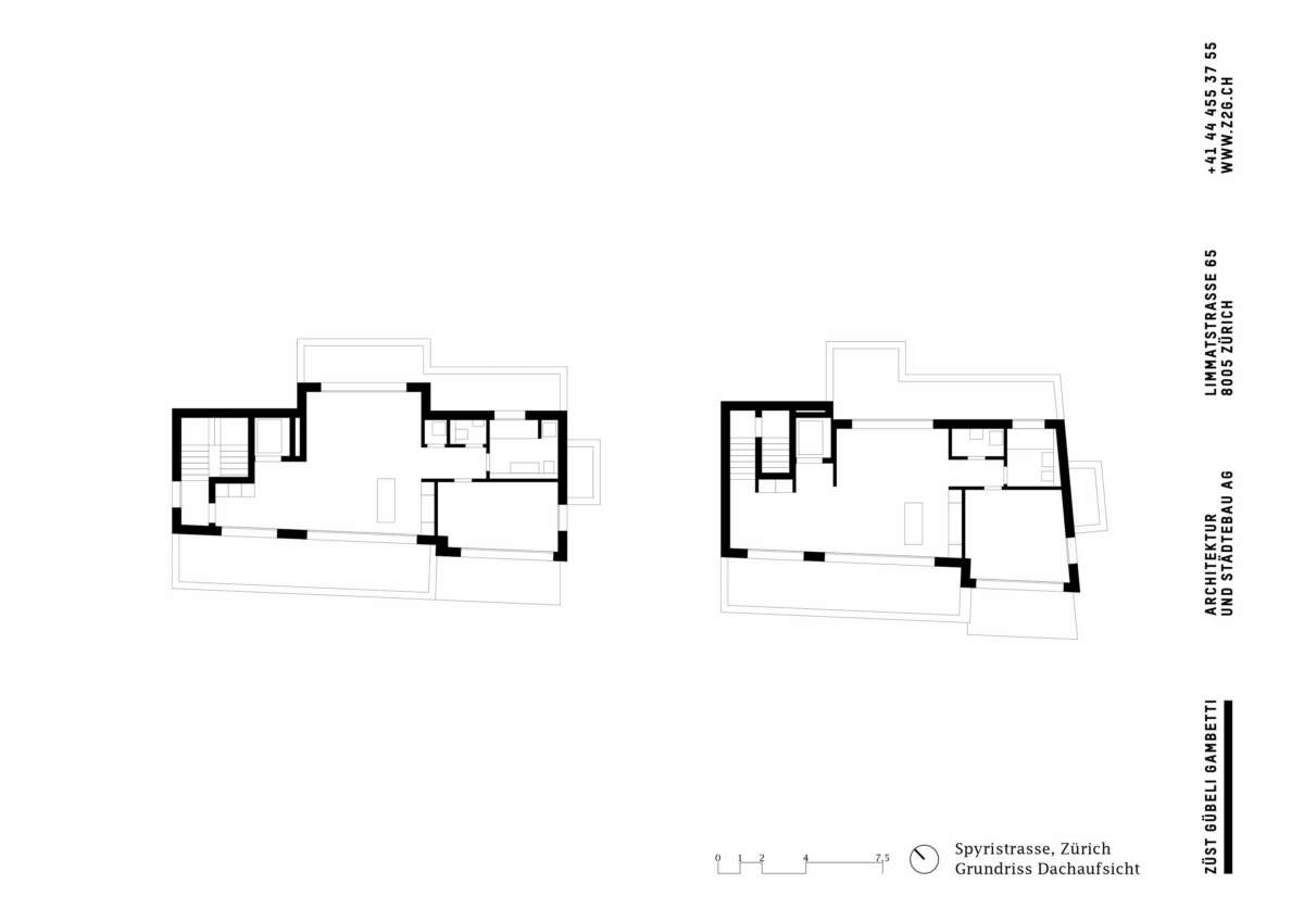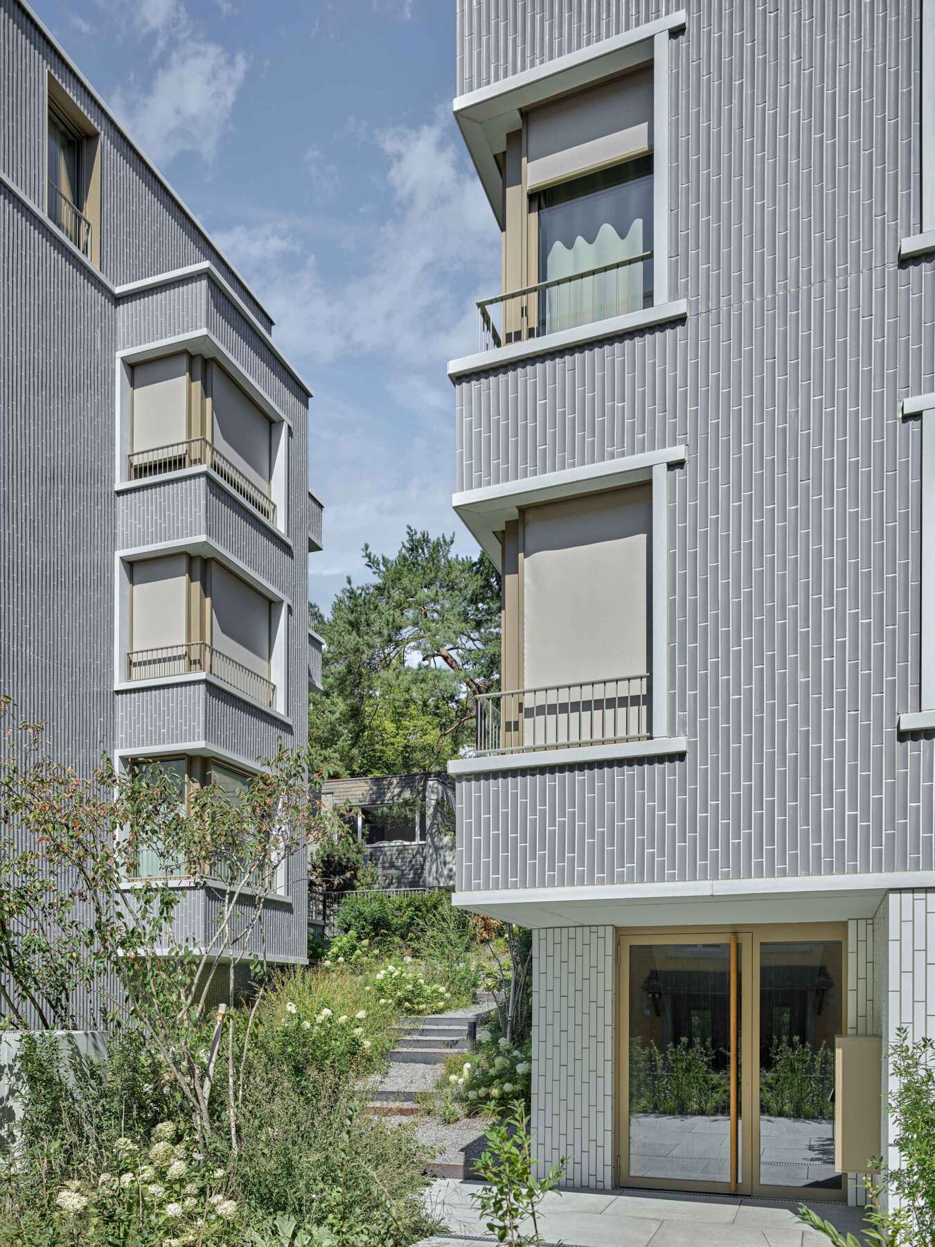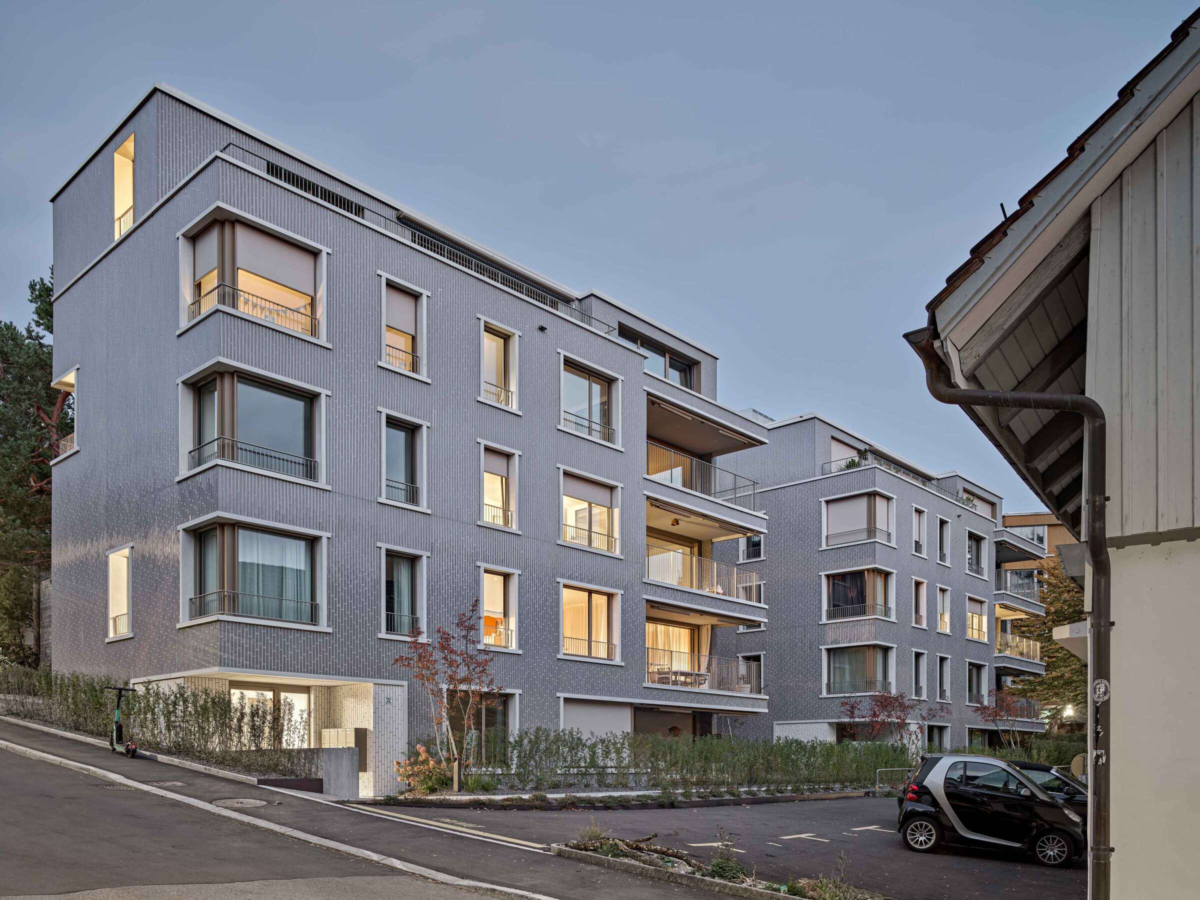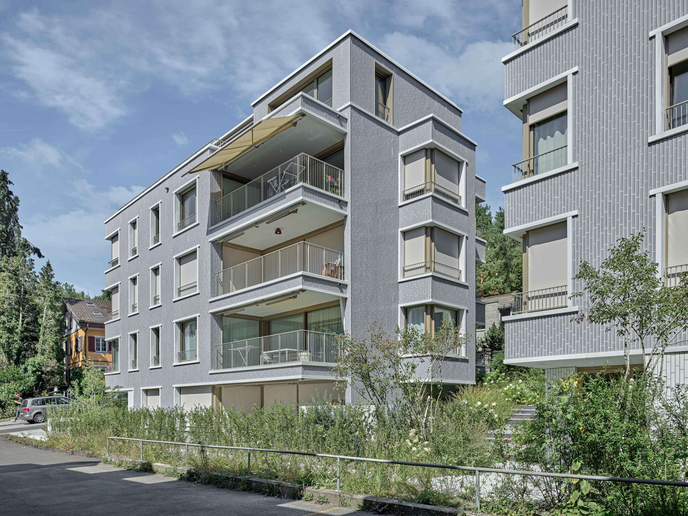 Fluntern ist geprägt von einem lockeren Potpourri aus denkmalgeschützten Zeitzeugen und freistehenden Mehrfamilienhäusern der unterschiedlichsten Dekaden. Nur unweit des Spyriplatzes befanden sich zwei in die Jahre gekommene Wohnblöcke aus den 1960er Jahren. Auf einem massiven Garagensockel vereint, machten sie einen wenig zugänglichen Eindruck. An ihrer Stelle sollten zwei Ersatzneubauten entstehen, die nicht nur dem Gebot der Innenverdichtung nachkommen, sondern auch die quartierstypische Hanglage wieder erfahrbar machen: Sie sollten jeden hermetischen Eindruck vermeiden und stattdessen Durchlässigkeit und Zugewandtheit vermitteln.