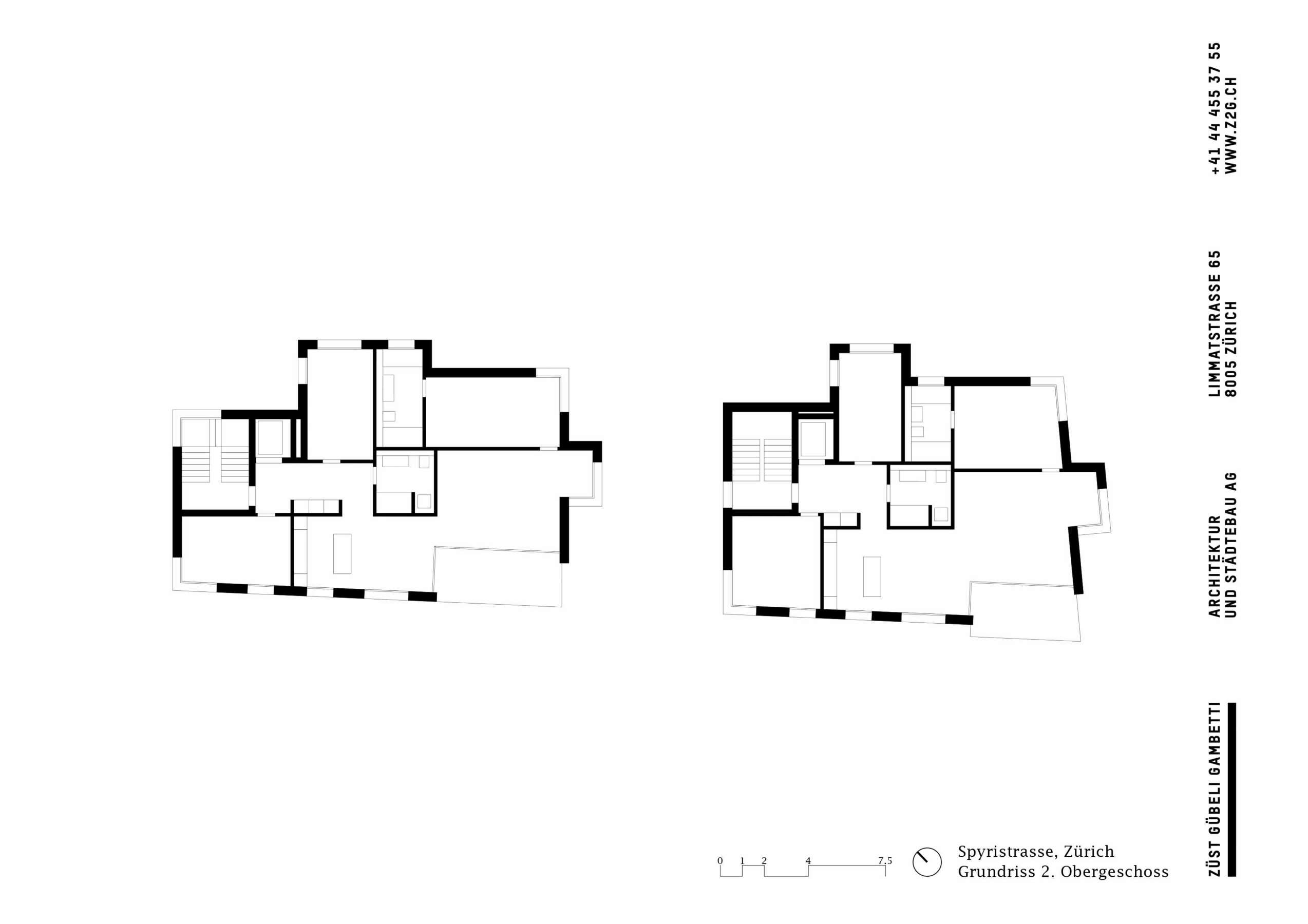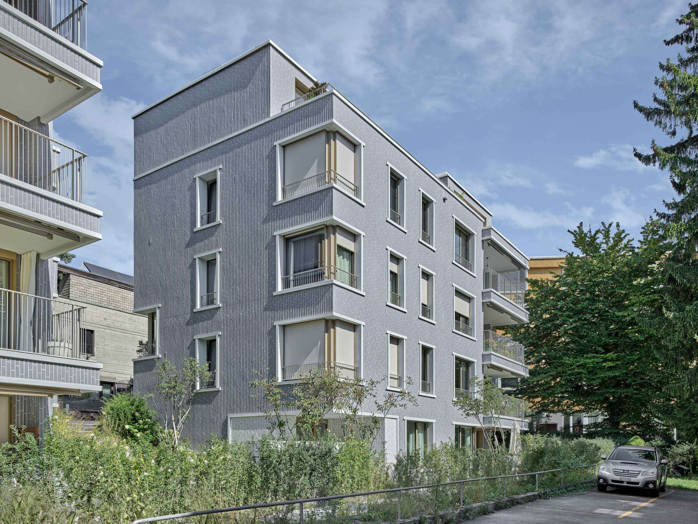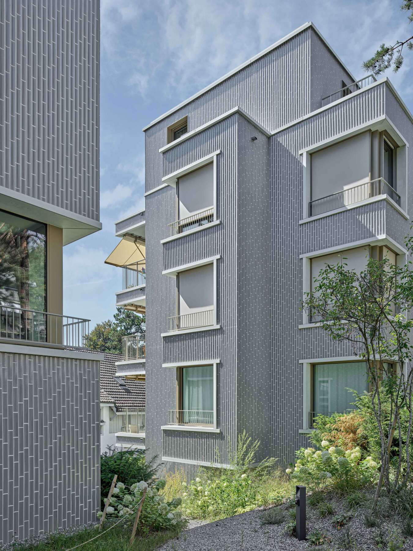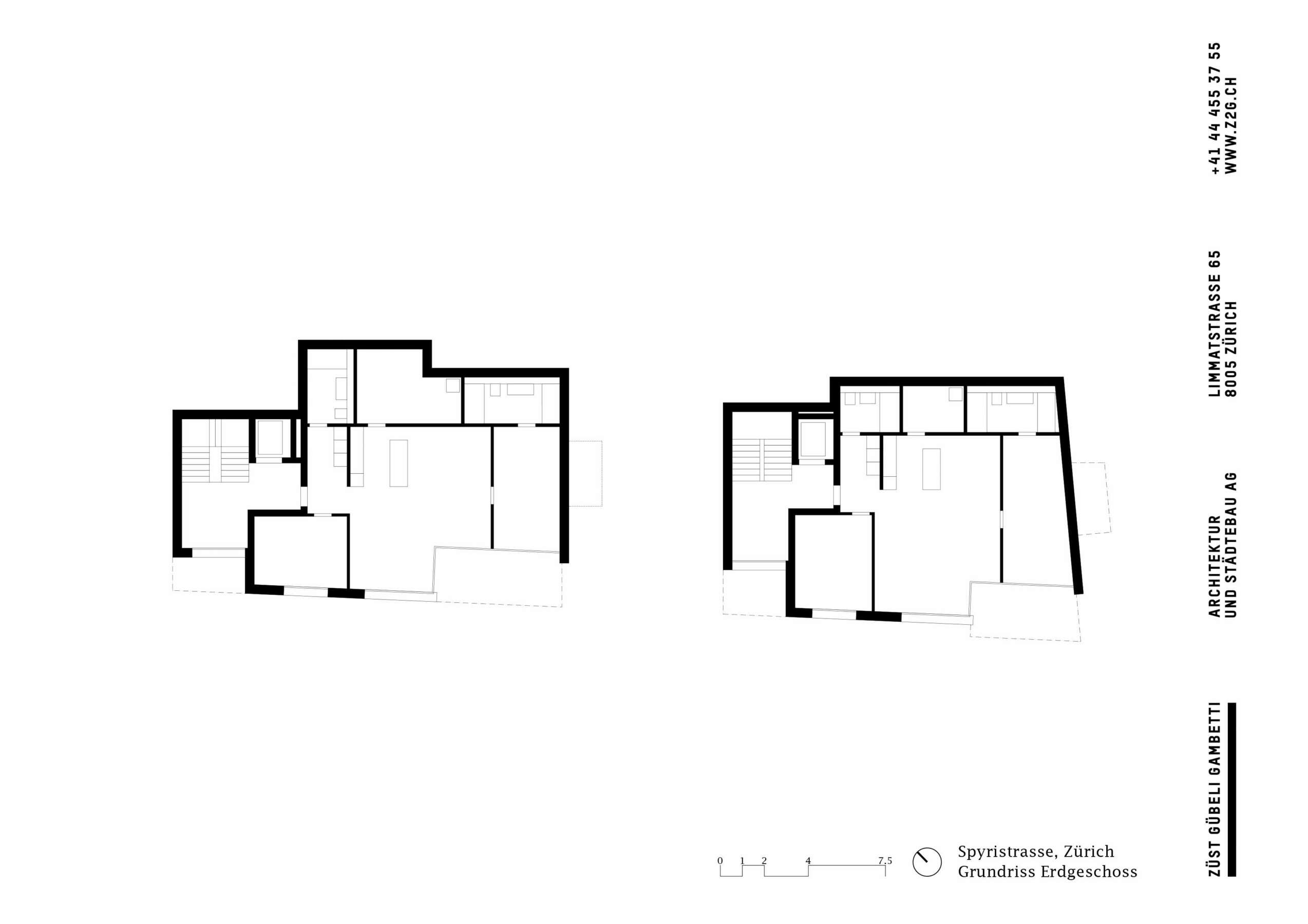 Fluntern ist geprägt von einem lockeren Potpourri aus denkmalgeschützten Zeitzeugen und freistehenden Mehrfamilienhäusern der unterschiedlichsten Dekaden. Nur unweit des Spyriplatzes befanden sich zwei in die Jahre gekommene Wohnblöcke aus den 1960er Jahren. Auf einem massiven Garagensockel vereint, machten sie einen wenig zugänglichen Eindruck. An ihrer Stelle sollten zwei Ersatzneubauten entstehen, die nicht nur dem Gebot der Innenverdichtung nachkommen, sondern auch die quartierstypische Hanglage wieder erfahrbar machen: Sie sollten jeden hermetischen Eindruck vermeiden und stattdessen Durchlässigkeit und Zugewandtheit vermitteln.