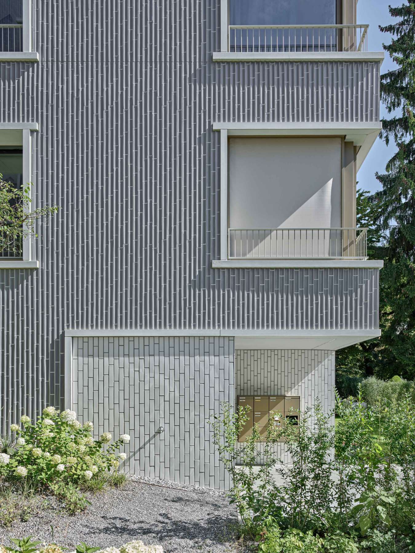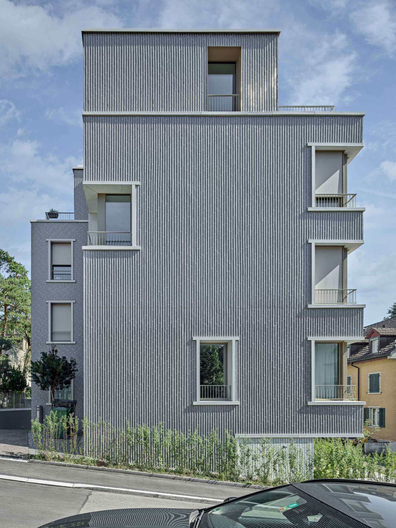 Von aussen präsentieren sich die Häuser als elegante, scharfkantige Bauten, die in der heterogenen Nachbarschaft gleichwohl moderat und gut integriert erscheinen. Dafür greifen sie auf eine repräsentative Gestaltung mit klassischer Lochfassade, Fensterfaschen und angedeuteten Erkern zurück, die Erinnerungen an die bürgerliche Wohnkultur wecken. In Verbindung mit einer wertigen wie dauerhaften Materialisierung aus profilierten graublauen Keramikplatten, hell kontrastierenden Rahmungen, filigranen Staketengeländern und ockerfarbenen Stoffmarkisen ist ein dem Ort angemessener Ausdruck geschaffen. (mc)