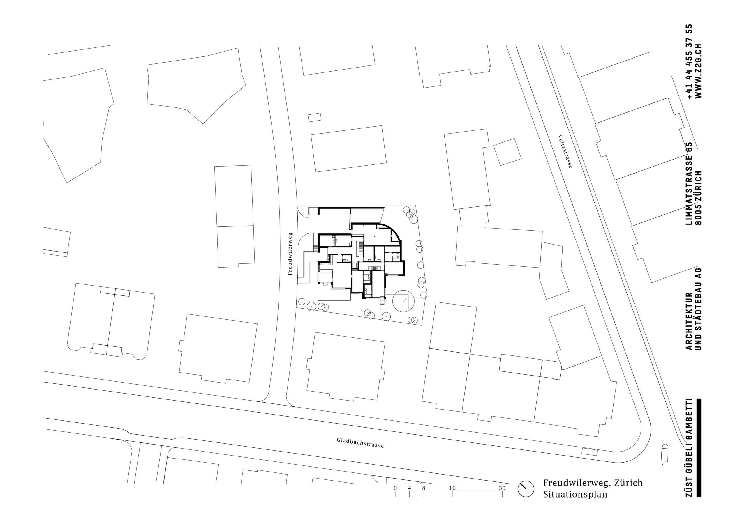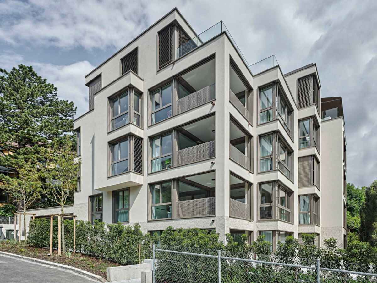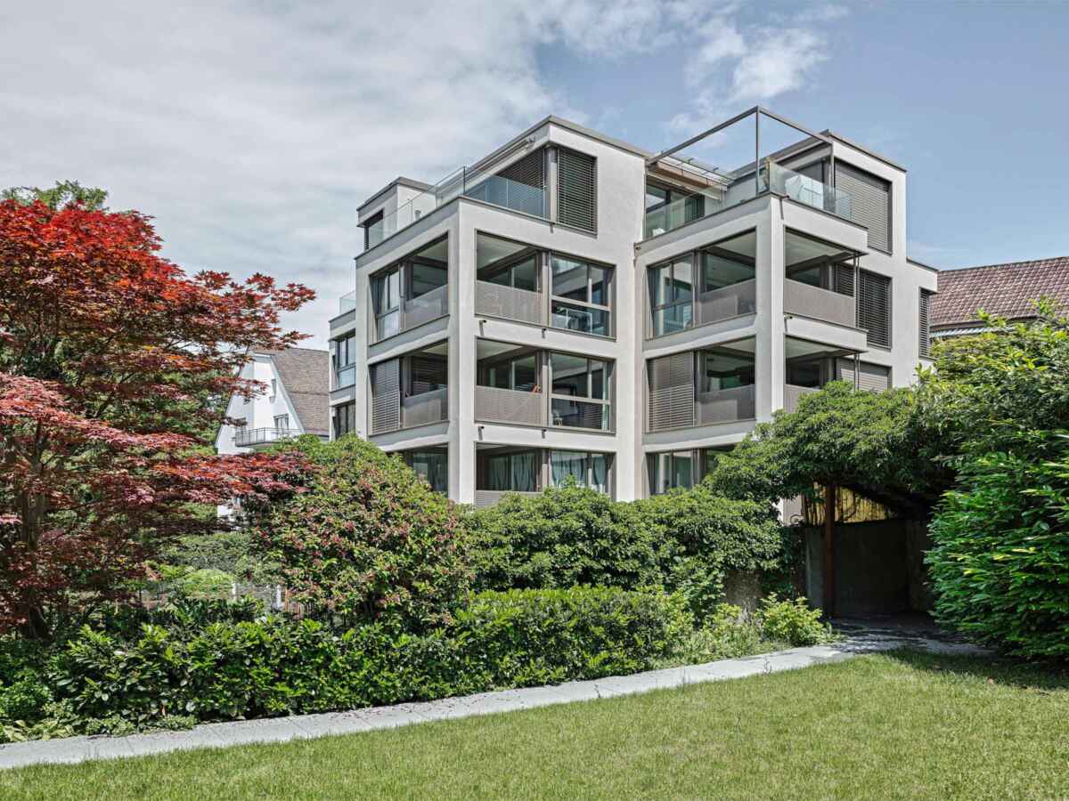 Auch am Zürichberg haben sich Ersatzneubauten als probates Mittel zu Verdichtungszwecken etabliert. Nachdem Durchgrünung und Weite den besonderen Reiz des Quartiers ausmachen, lag ein spezielles Augenmerk von Züst Gübeli Gambetti darauf, diese Qualität auch auf das Grundstück zu übertragen. Man entschied sich deshalb bewusst gegen das Hermetische, das ein strassenbegleitender «Riegel» mit sich bringen würde. Stattdessen sorgt jetzt ein Punkthaus ohne klare Vorder- und Rückseite für allseitig vermittelnde Gesten.