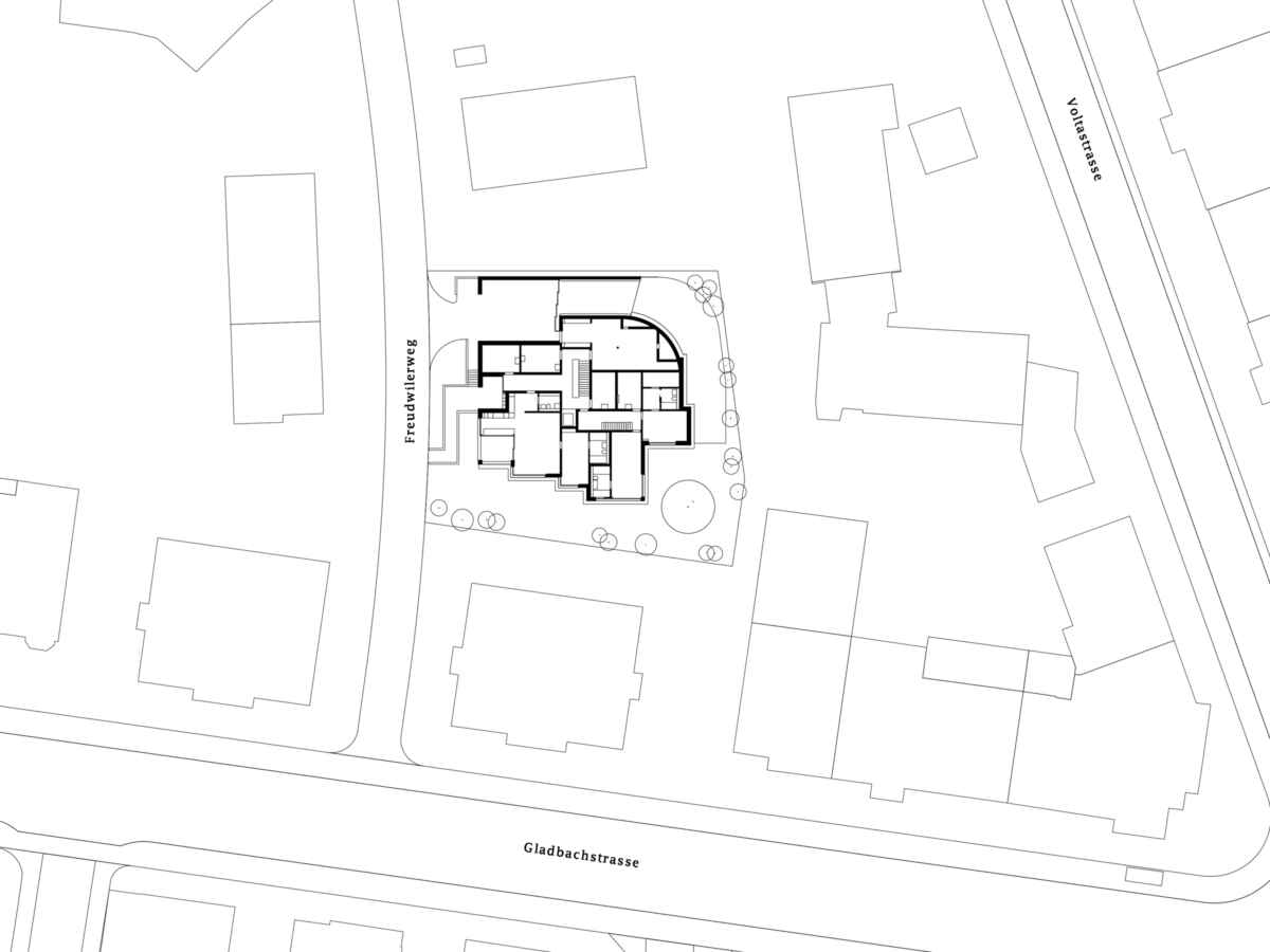 Der Bau wird als Implantat aufgefasst, das frei im Garten steht und präzise auf Lage und Nachbarschaften Bezug nimmt. Eine Nelke mit ihren gezackten Rändern wurde denn auch zur Metapher für die Grundrissfigur. Das stark gegliederte Gebäudevolumen unterstreicht die Orientierung auf alle Seiten hin, während es zugleich Belichtung und Wohnqualität fördert. Die zwölf Wohnungen werden seitlich über das Gartengeschoss erschlossen. Auf diese Weise kann das Treppenhaus ins Innere des Baukörpers verlegt und die ganze Fassade für Wohnzwecke freigespielt werden.