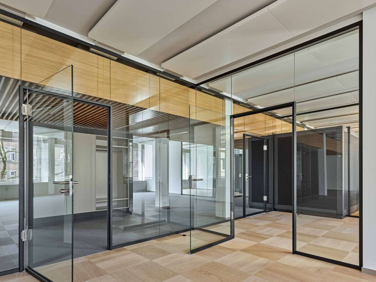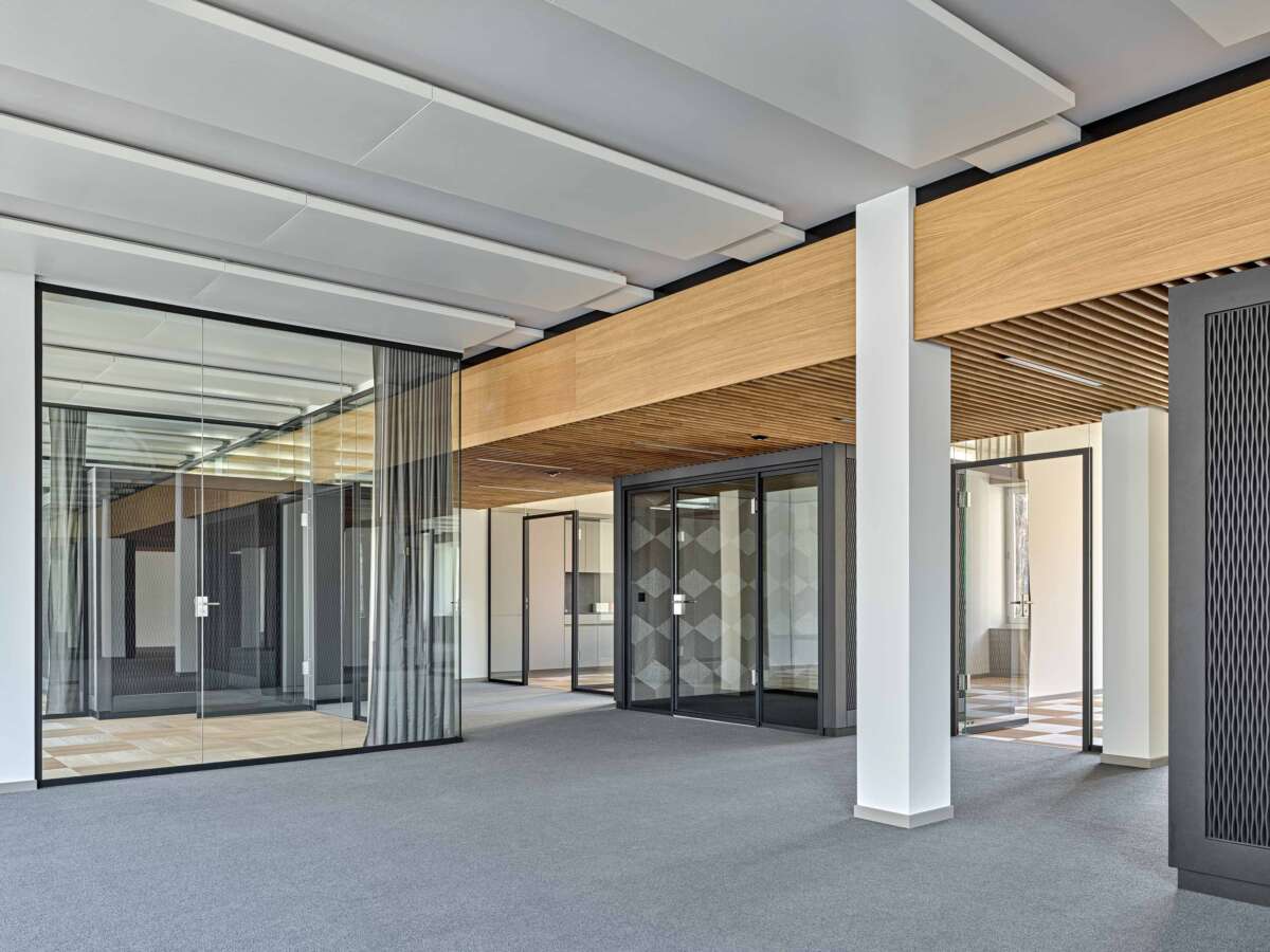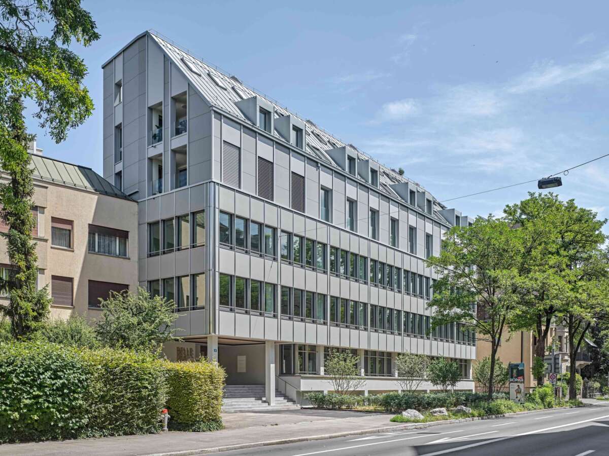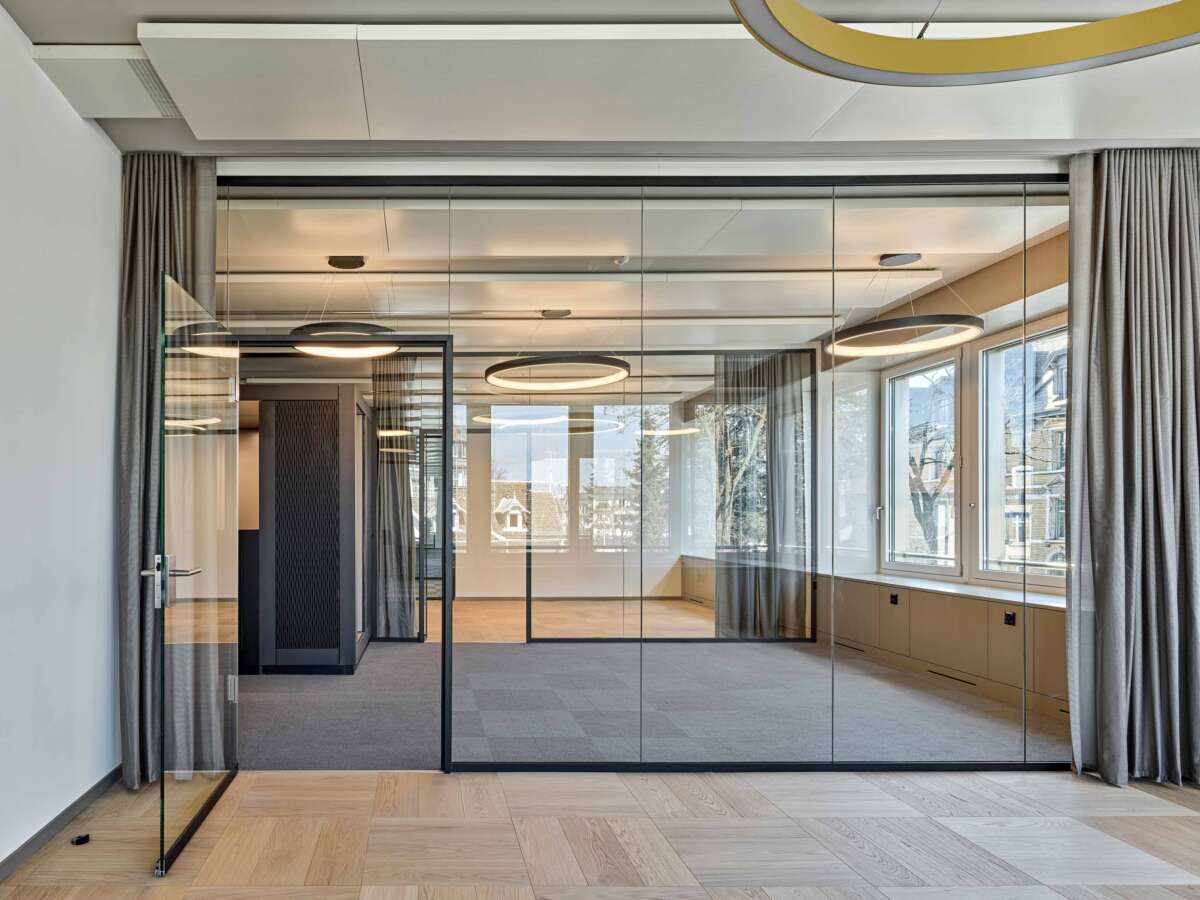 Nahe des Zürcher Seebeckens eröffnete sich für ein in die Jahre gekommenes Bürohaus eine neue Chance: Dank der Aufstockung um zwei Wohnetagen konnte die Gebäudehöhe voll ausgeschöpft und der Bau fit für die Zukunft gemacht werden. Im zweiten Bürogeschoss erteilte eine Privatbank den Auftrag zum Ausbau der angemieteten Etage. Technische Gegebenheiten wie die auf das Fassadenraster ausgerichteten Deckensegel zur Klimaregulierung erschwerten eine freie Raumeinteilung in kleinere Einheiten. Dies führte Züst Gübeli Gambetti zu einer interessanten Lösung.