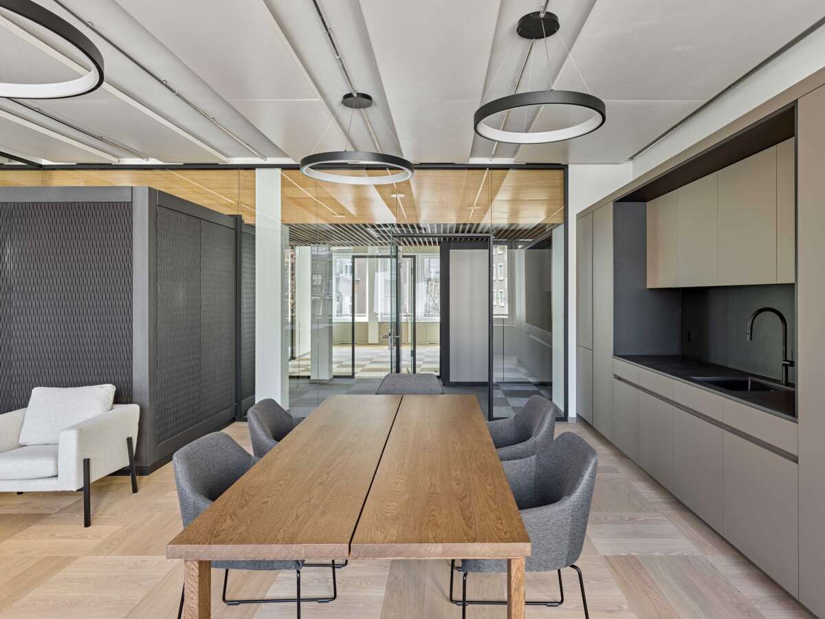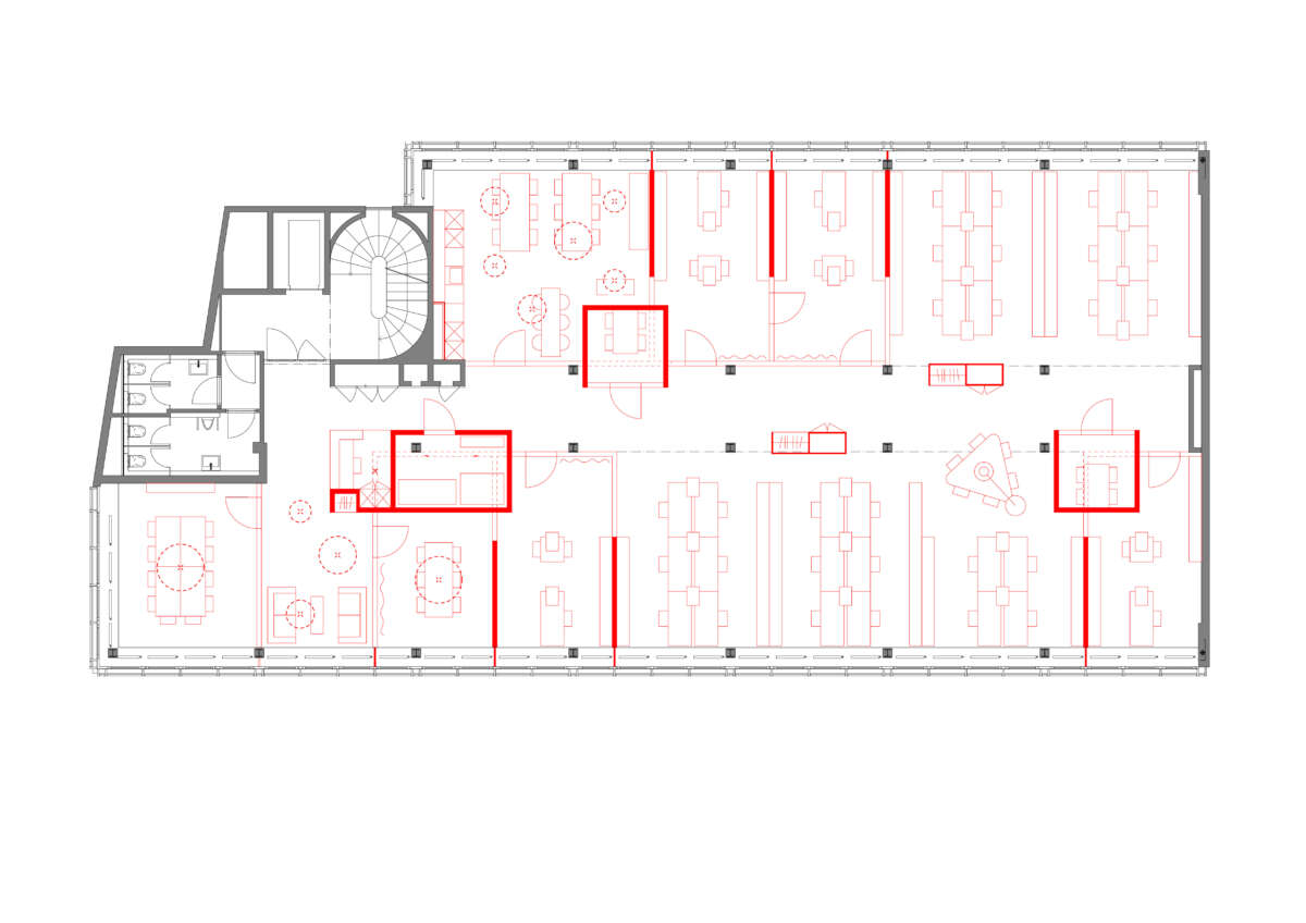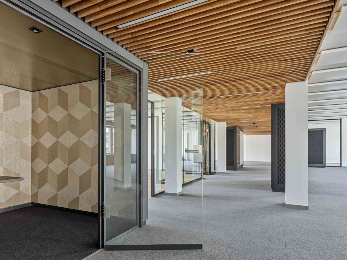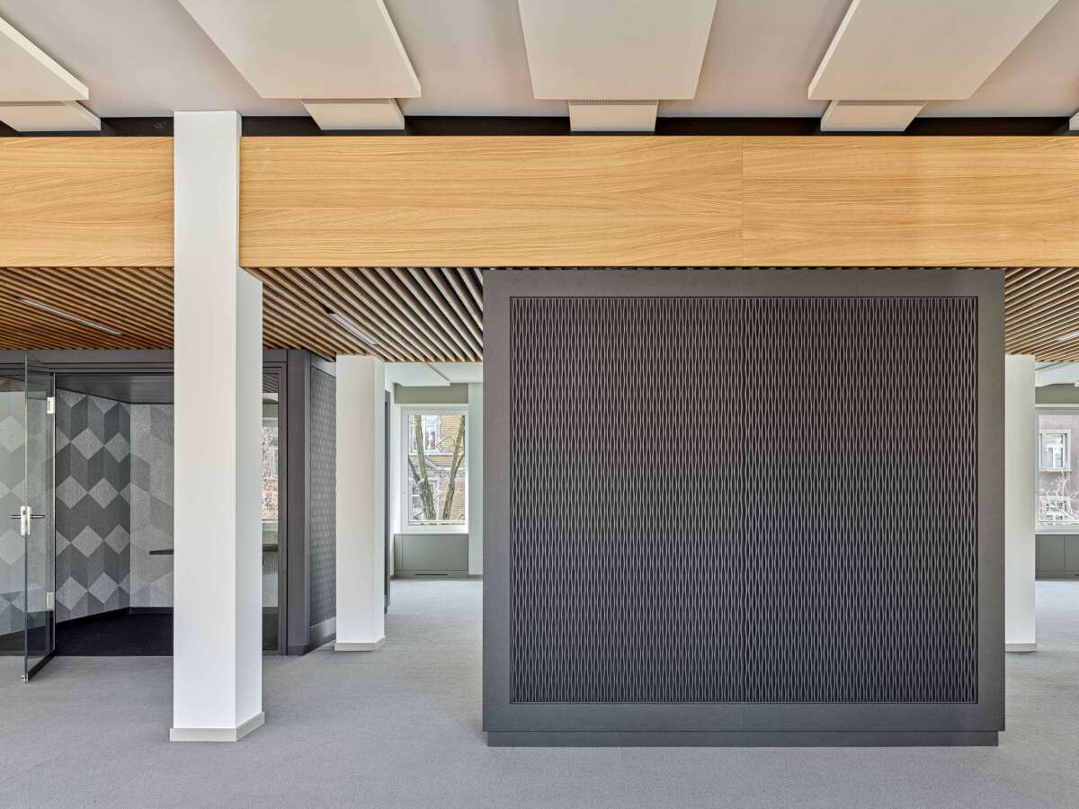 Nahe des Zürcher Seebeckens eröffnete sich für ein in die Jahre gekommenes Bürohaus eine neue Chance: Dank der Aufstockung um zwei Wohnetagen konnte die Gebäudehöhe voll ausgeschöpft und der Bau fit für die Zukunft gemacht werden. Im zweiten Bürogeschoss erteilte eine Privatbank den Auftrag zum Ausbau der angemieteten Etage. Technische Gegebenheiten wie die auf das Fassadenraster ausgerichteten Deckensegel zur Klimaregulierung erschwerten eine freie Raumeinteilung in kleinere Einheiten. Dies führte Züst Gübeli Gambetti zu einer interessanten Lösung.