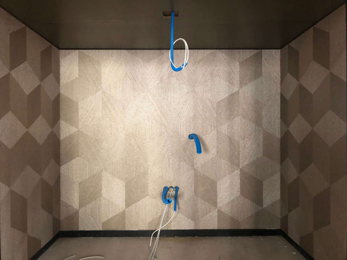 Drei freischwimmende, raumhaltige Boxen zonieren den Grundriss. Sie bilden eine Raumabfolge, die Blickverbindungen schafft, stoppt und sogar komplette Durchsichten ermöglicht. Die Boxen sind – ganz «Black Boxes» – aussen in Schwarz gehalten, innen dagegen mit schimmernden Gold-, Silber- und Kupfertönen austapeziert. Nur von einer Seite zugänglich, bieten sie introvertierte Rückzugs- oder Sitzungsräume. Sie stehen im atmosphärischen Kontrast zu den gläsernen Trennwänden, die da und dort eine Parallelwelt im Grundriss ausscheiden. Ein bisschen fühlt man sich – im positiven Sinn – wie in einem Aquarium, in dem drei geheimnisvolle Schatzkisten ruhen.