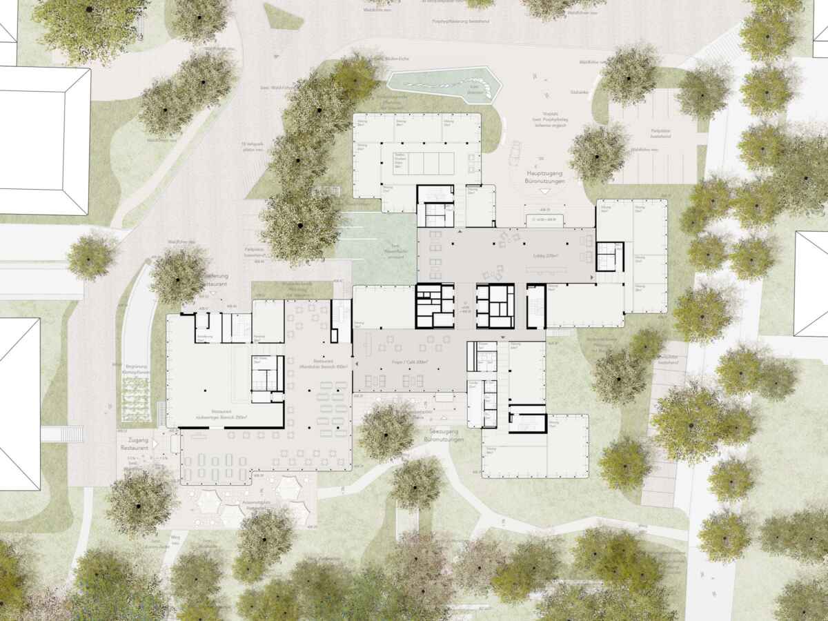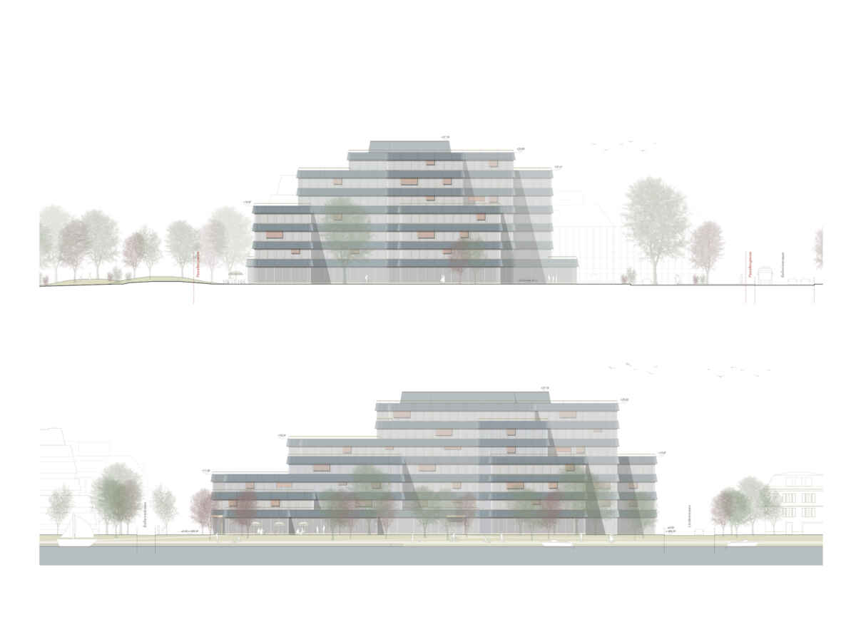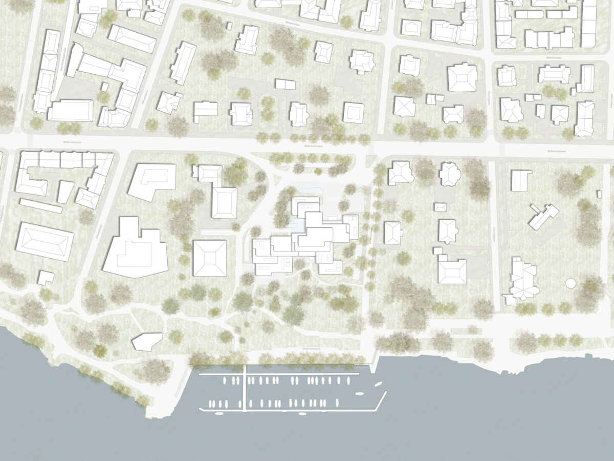 Der in die Jahre gekommene Büroriese ruht wortkarg an prominenter Lage im Zürcher Seebecken. Eine Kompletterneuerung sollte ihn in ein multifunktionales, zukunftsweisendes Bürohaus transferieren, das den besonderen Lagequalitäten gerecht wird und eine Neupositionierung des Gebäudes ermöglicht. Ziel war ein repräsentabler wie flexibler Bürobau, der bestehende Qualitäten ins Heute verlängert, funktionalistische Rigiditäten hinterfragt sowie mittels einer interpretierenden «Anverwandlung» künftigen Anforderungen und der Atmosphäre des Orts gerecht wird.