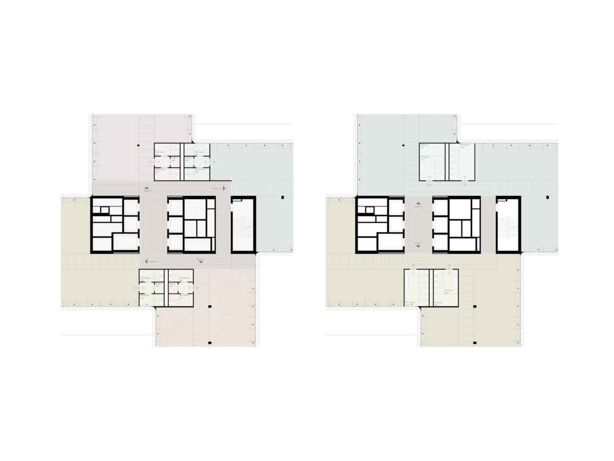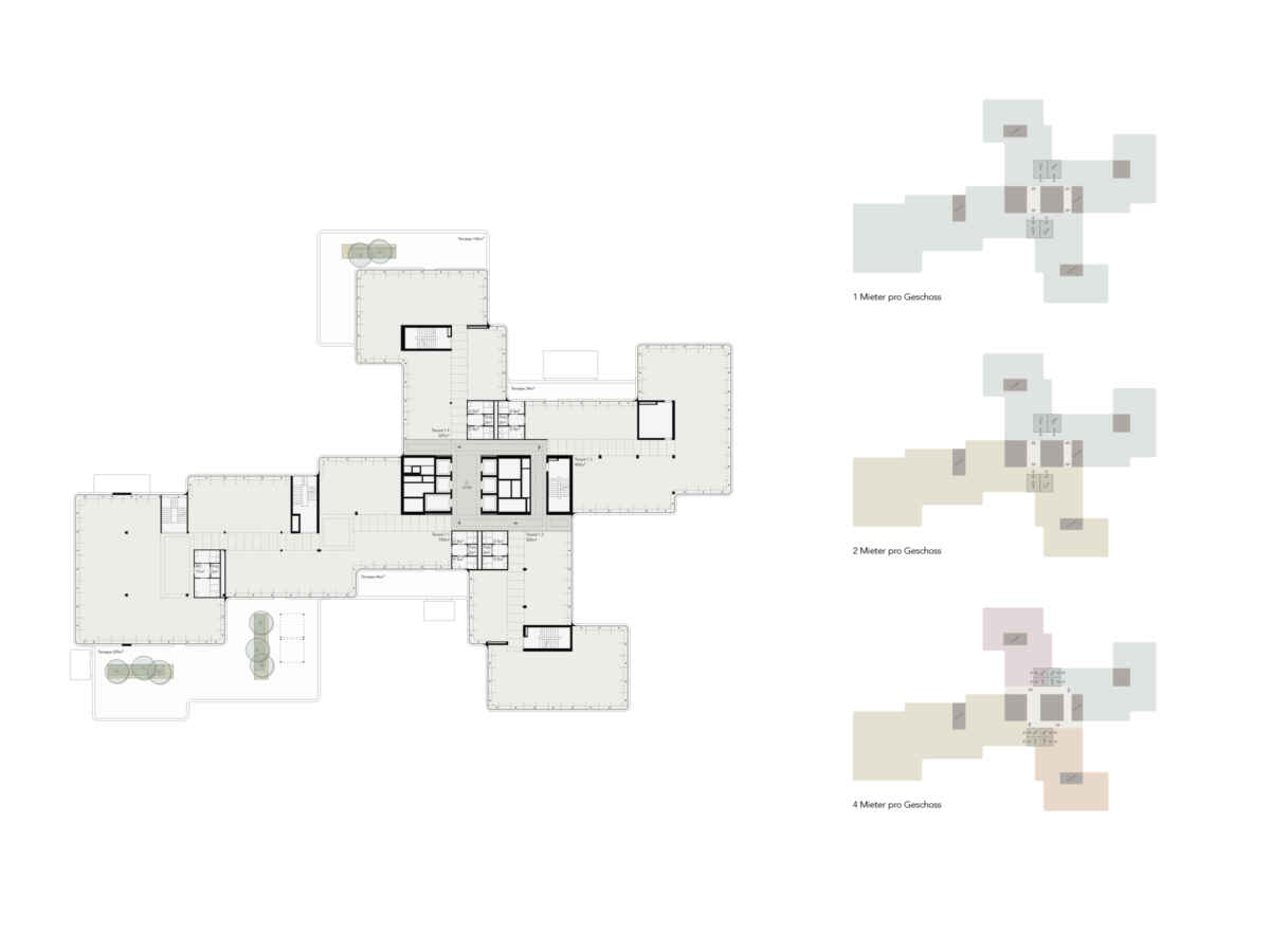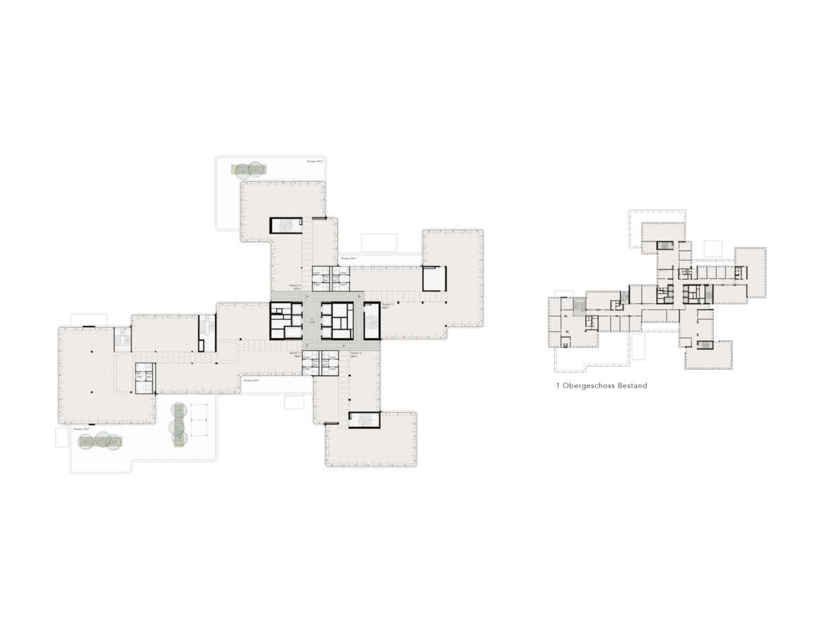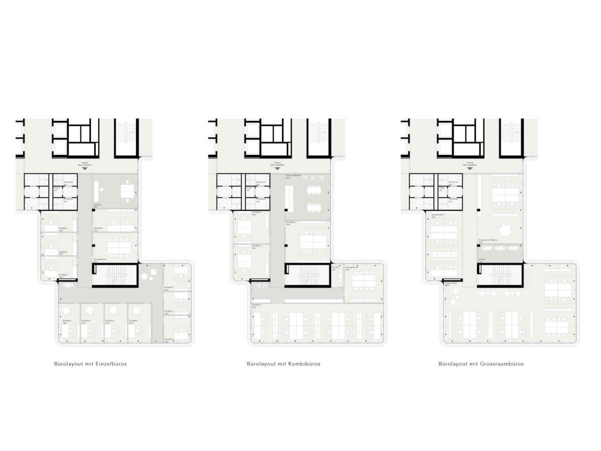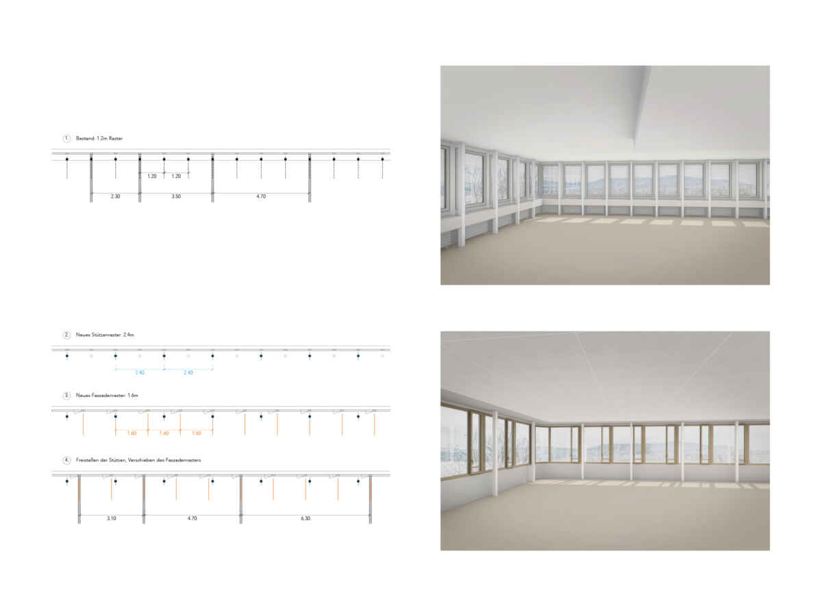 Der Anspruch, das Gebäude innen wie aussen zu einer organischen Einheit zu verschmelzen, erforderte einen Grundsatzentscheid: Struktur- und Fassadenraster sollten künftig losgelöst voneinander bestehen. Mittels einer neuen Hülle sollte zudem eine energetisch hochstehende Fassade befördert werden und auch eine Neupositionierung des Gebäudes. In der Folge wurde der «Stützenwald» von 1.20 m in ein 2.40 m-Raster überführt, was jede zweite Bestandsstütze obsolet machte. In der Fassade wurde dagegen aus Effizienzgründen ein 1.60 m-Raster eingeführt. Massnahmen, die nicht nur einen visuellen Befreiungsschlag erzielten, sondern auch mehr Freiheit und Effizienz in der Büroorganisation.