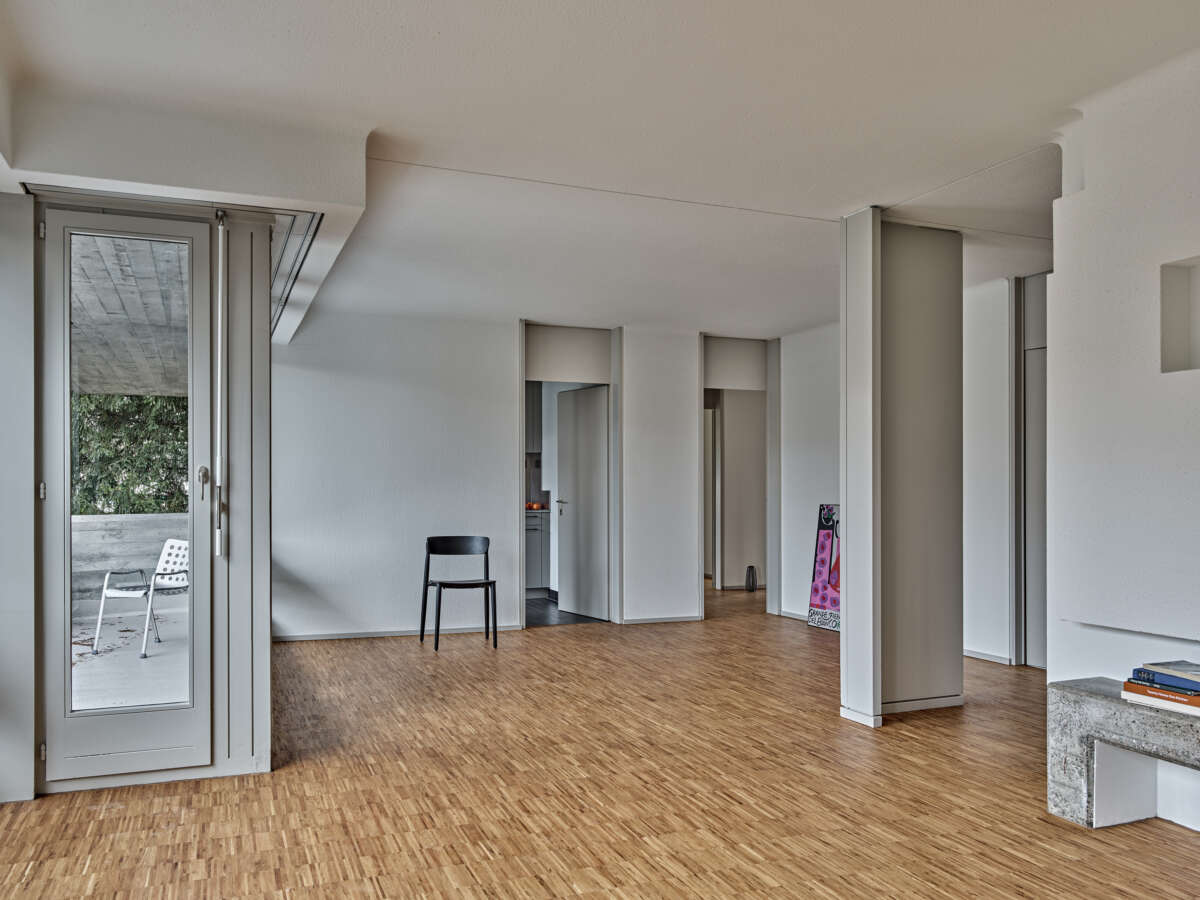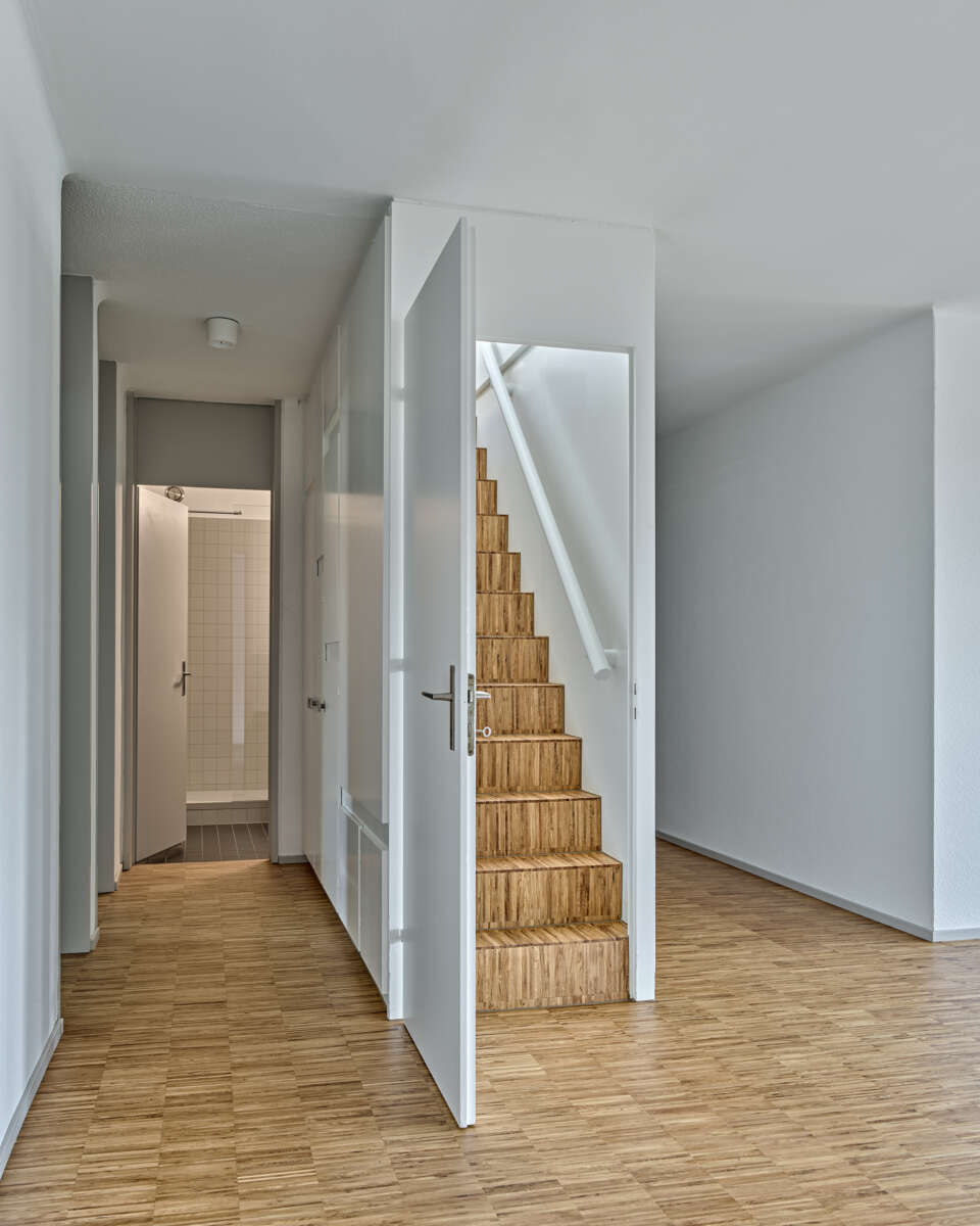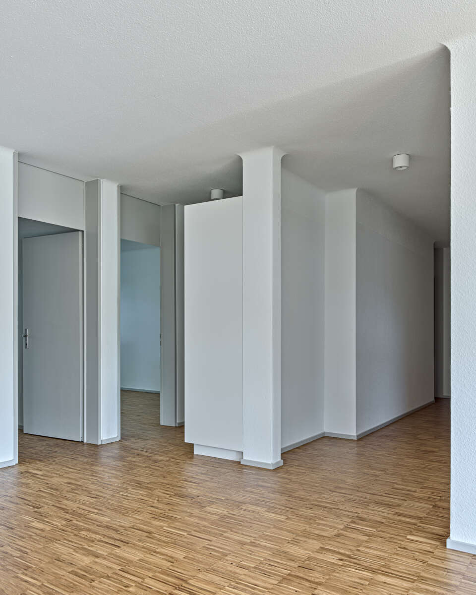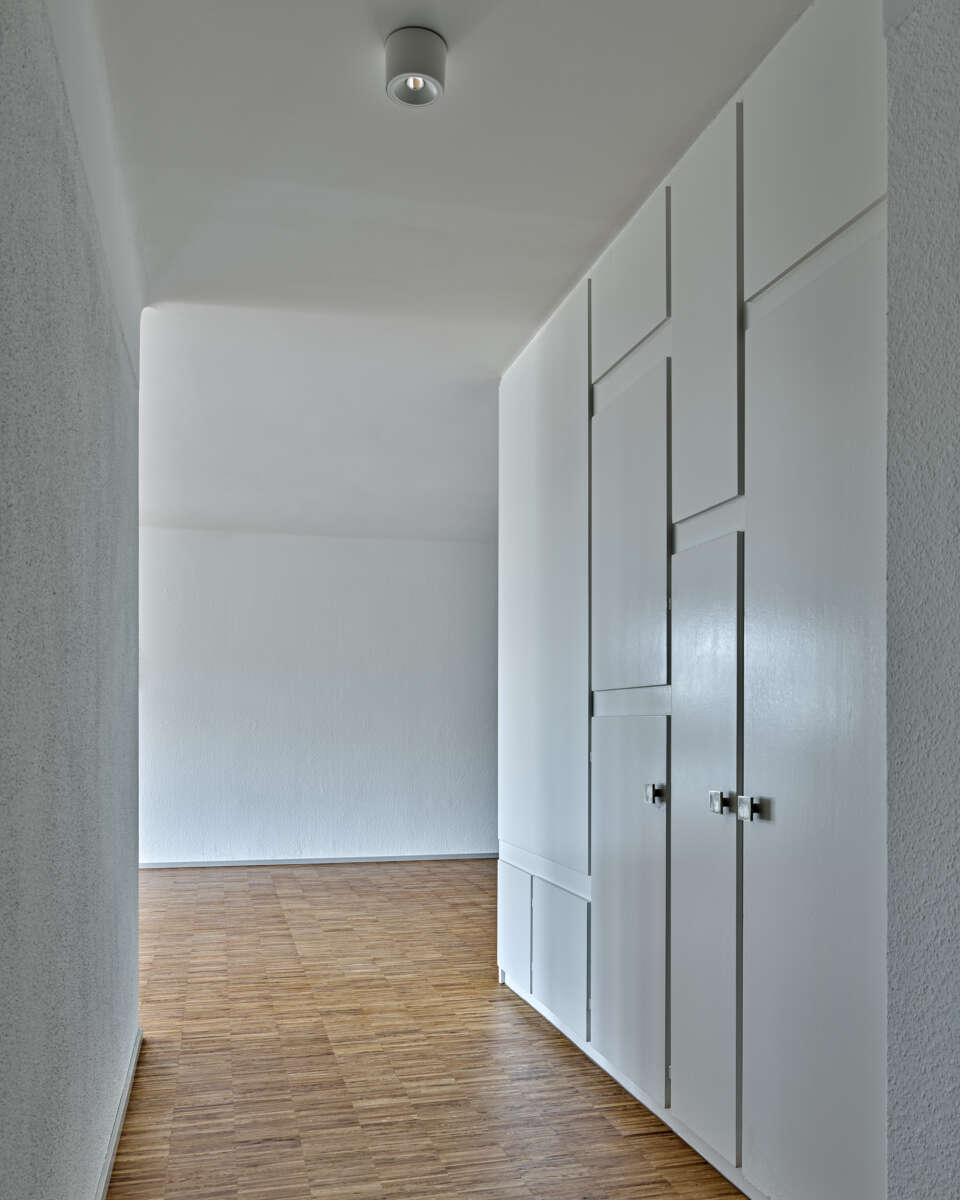 Innen fügt sich eine Vielzahl von Wohnungstypen zu individuellen Raumfolgen. Als Möbelentwerfer kümmerte sich Glaus auch um die Erstausstattung. In dieser auf Details bedachten Baukunst gründet die Schutzwürdigkeit des Ensembles. Im Laufe der Zeit haben indes Alterung und Sanierungssünden Spuren hinterlassen. Zudem ist das Gebäude an der Verkehrsachse im Ausdruck verändert: Einst als städtebaulicher Akzent mit expressiver Pergola bedacht, wurde diese später einer Attikawohnung einverleibt. So umfasste der Status Quo 50 Wohnungen unterschiedlichen Zustands, als der Auftrag kam: Sanierung und Überprüfung, ob ein Lift sowie Attikaaufbau ebenso für die zwei anderen Gebäude denkbar wären.