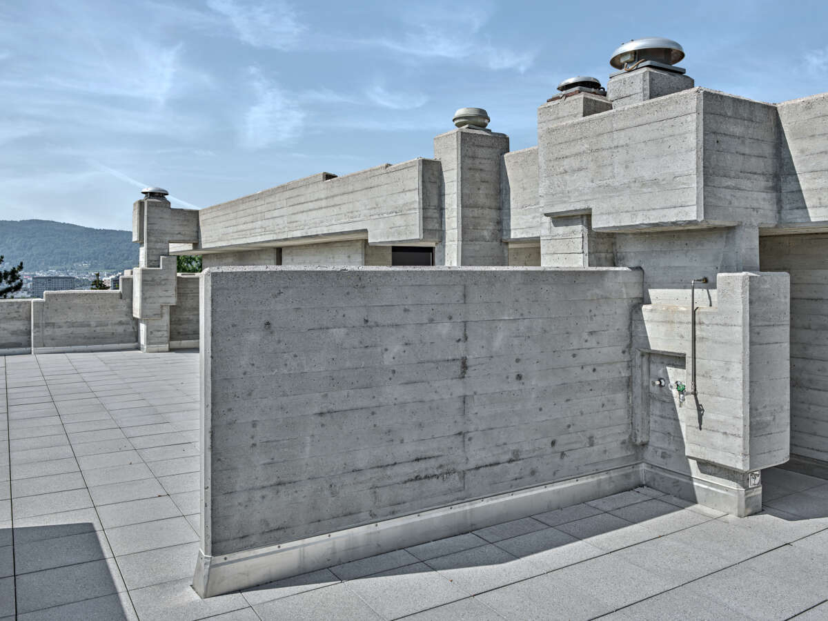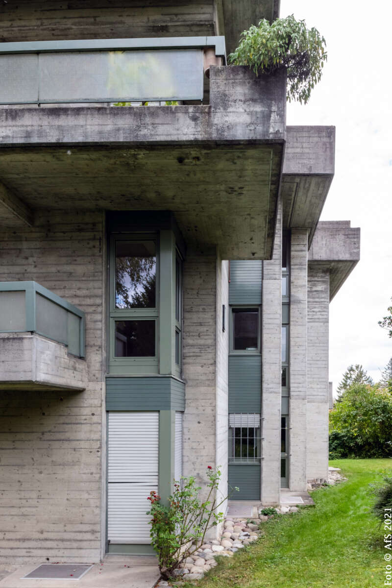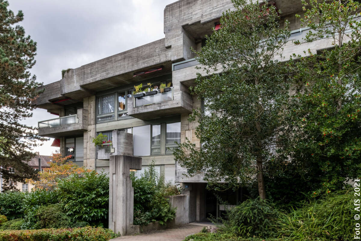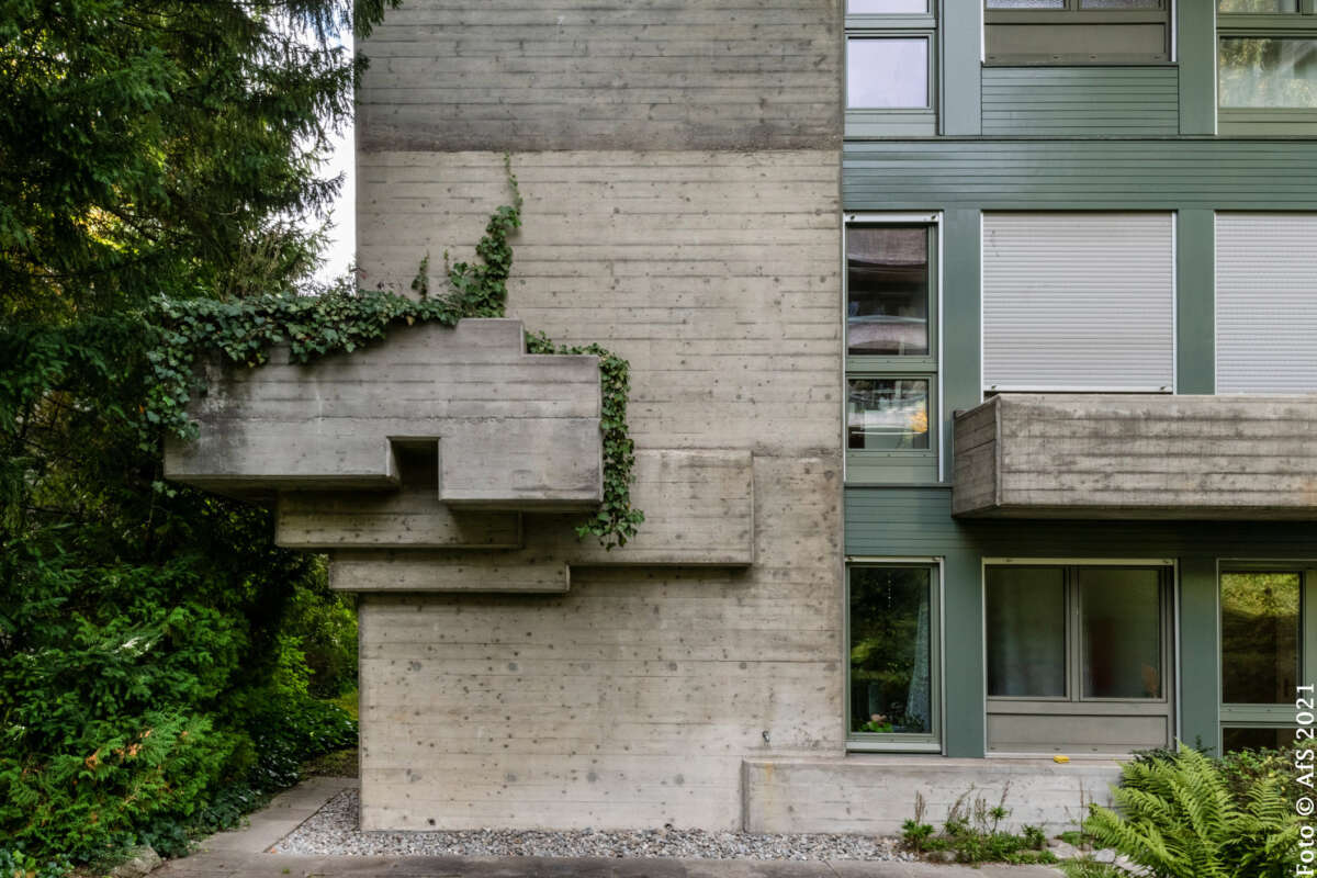 Sie stechen ins Auge; drei skulpturale Betonbauten, die sich den Hang hinaufstaffeln. Ihr Schöpfer Otto Glaus zählt zu den wichtigsten Vertretern des Brutalismus. Einst Mitarbeiter von Le Corbusier, ist der Einfluss sichtbar: das plastische Spiel mit Volumen, Balkonen und Pflanztrögen, die die Fassaden rhythmisieren, die Verwendung von strukturiertem Sichtbeton. Aber auch das angewendete Modulor-Masssystem sowie ein gewisser Sozialanspruch, der aus den sorgfältig komponierten Aussenräumen, Dachgärten und -aufbauten spricht. Sie dienen kompensatorisch als Erholungsraum für die verbaute Fläche.