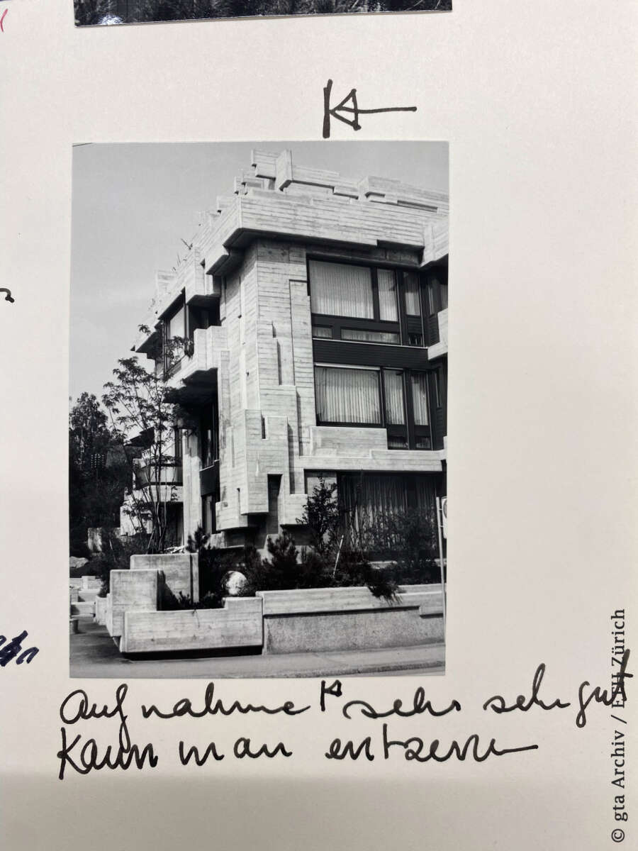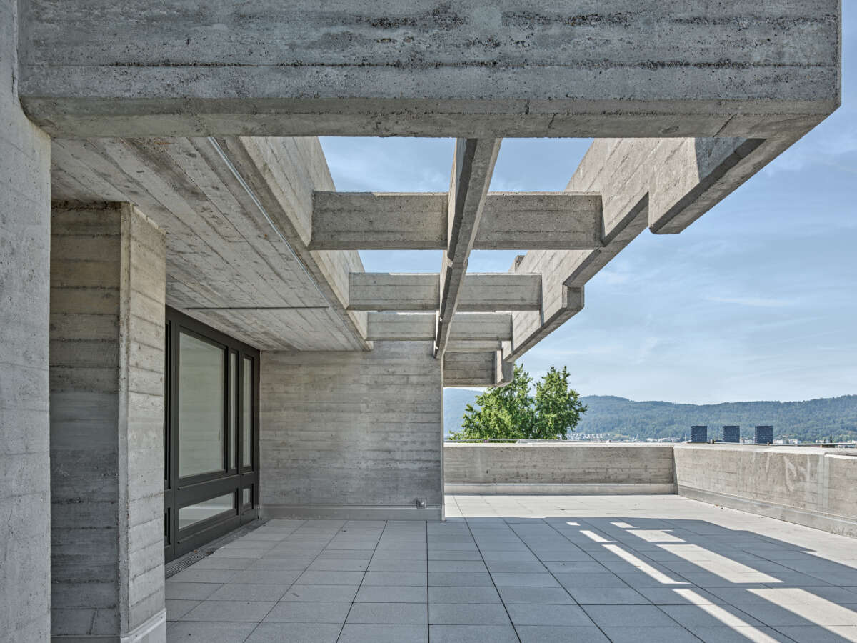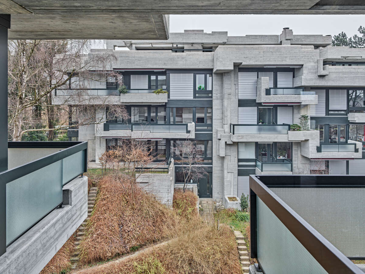 Sie stechen ins Auge; drei skulpturale Betonbauten, die sich den Hang hinaufstaffeln. Ihr Schöpfer Otto Glaus zählt zu den wichtigsten Vertretern des Brutalismus. Einst Mitarbeiter von Le Corbusier, ist der Einfluss sichtbar: das plastische Spiel mit Volumen, Balkonen und Pflanztrögen, die die Fassaden rhythmisieren, die Verwendung von strukturiertem Sichtbeton. Aber auch das angewendete Modulor-Masssystem sowie ein gewisser Sozialanspruch, der aus den sorgfältig komponierten Aussenräumen, Dachgärten und -aufbauten spricht. Sie dienen kompensatorisch als Erholungsraum für die verbaute Fläche.