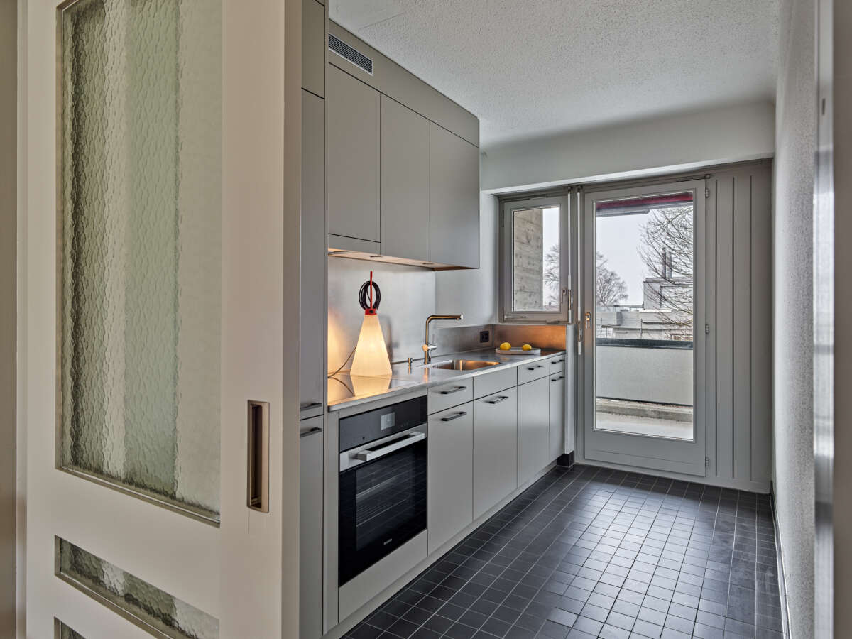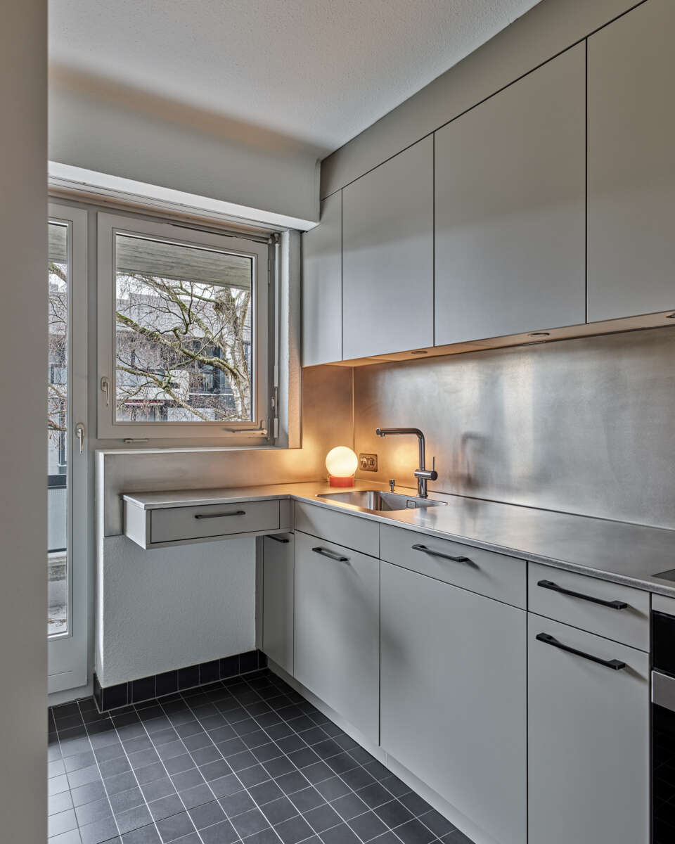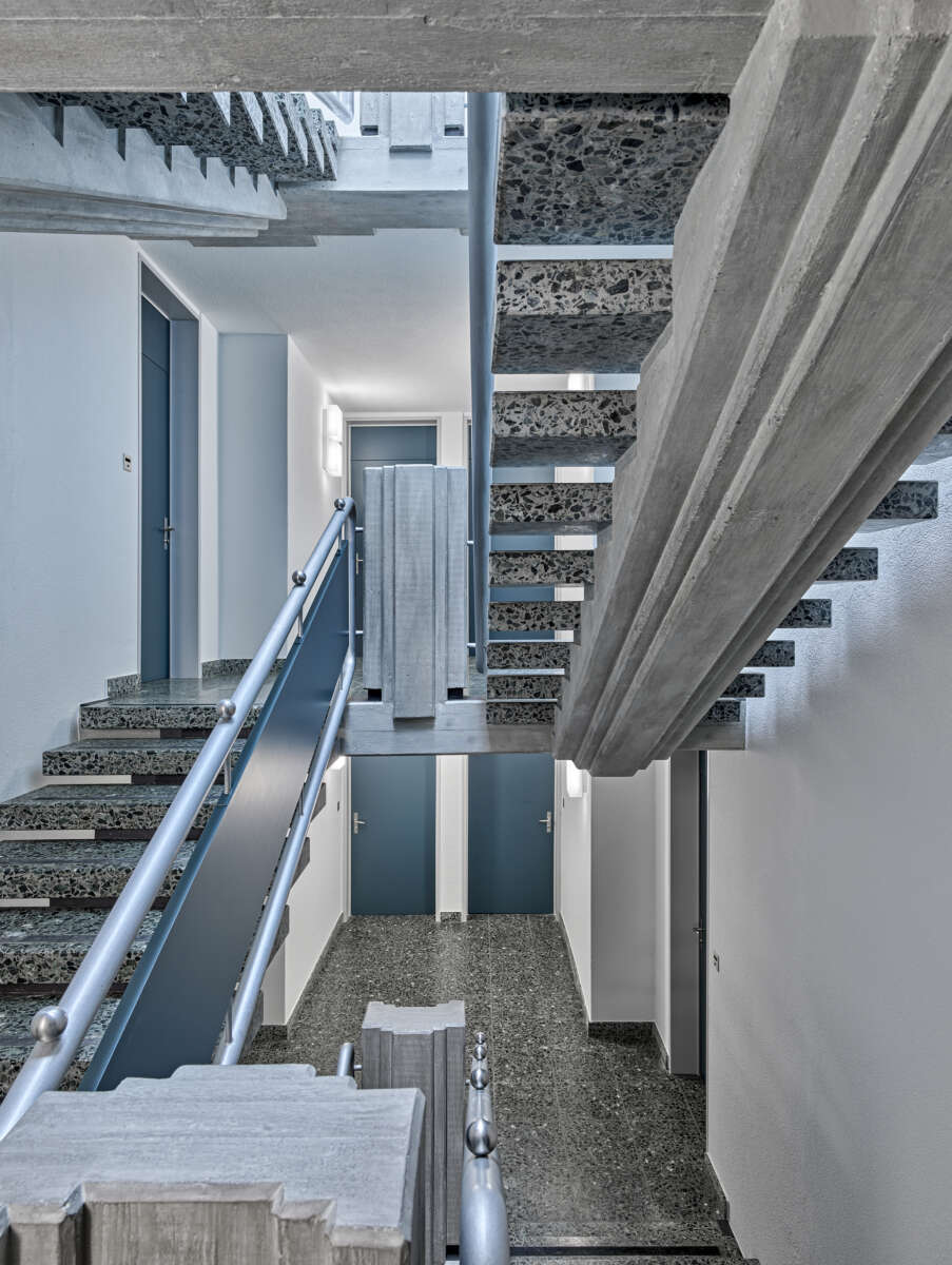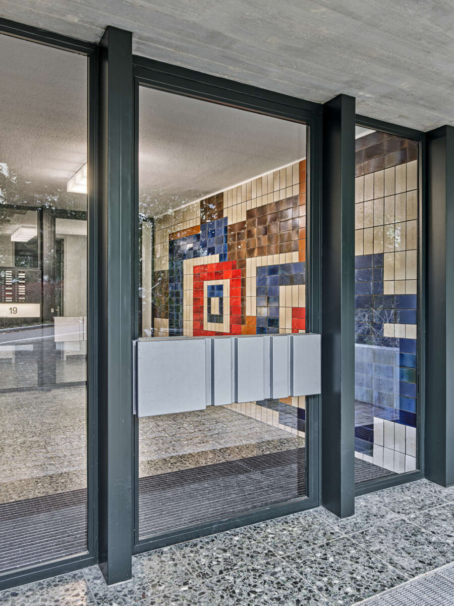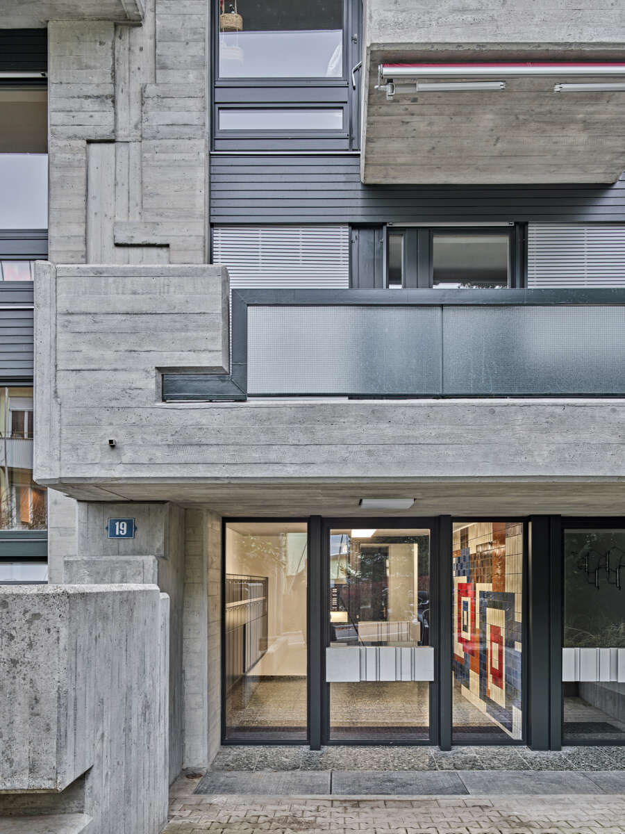 Im engen Austausch mit der Denkmalpflege fiel der Entscheid zugunsten einer sanften Sanierung im Geist der Zeit. Die Betonfassaden erfahren eine Säuberung und Rekonstruktion der Farbigkeit unter Wahrung des Schalungseffekts, die Drahtglas-Brüstungen eine normkonforme Neuinterpretation. Die Bepflanzung der Tröge als wichtiges Gestaltungselement übernimmt künftig die Verwaltung. Heimische Gebirgspflanzen halten selbst extremen Wetterperioden stand, unterstützt von einer Anstaubewässerung. Innen erfolgt eine Auffrischung der originären Farben und gestalterischen Elemente. In den Wohnungen werden sämtliche Oberflächen und Nasszellen erneuert – inklusive Neuauflage der Küchenabdeckungen in Edelstahl. (mc)