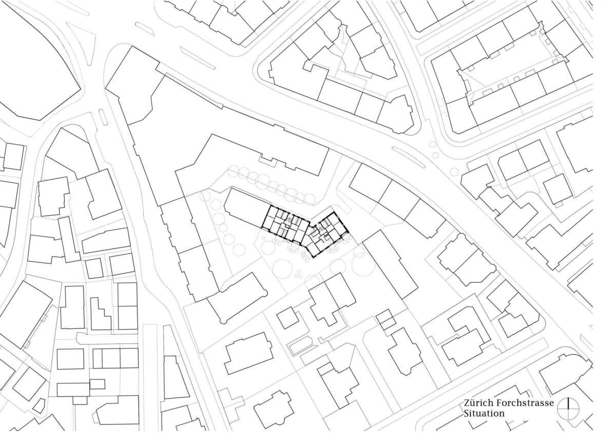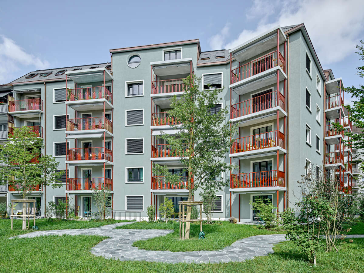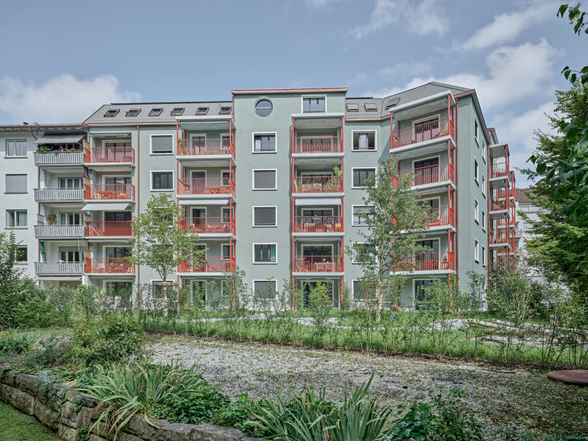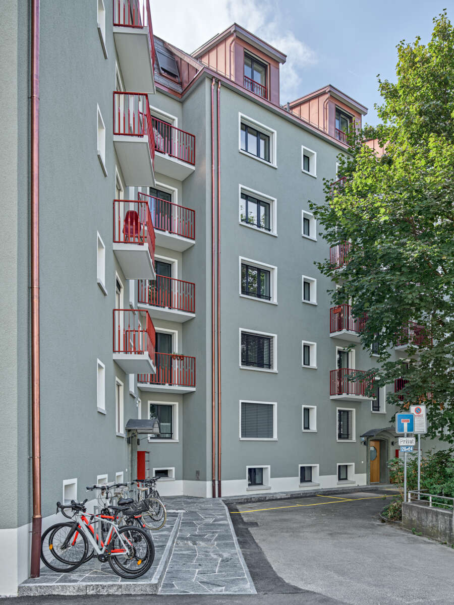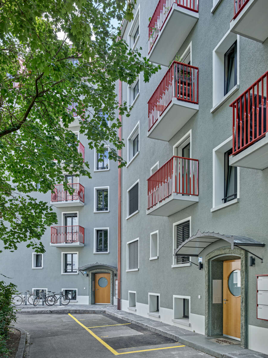 Wohnungen sind nicht nur in Zürichs Innenstadt ein rares Gut. Eine Möglichkeit zur Innenentwicklung liegt in der vertikalen Verdichtung; vor allem, wenn sowieso eine energetische Sanierung ansteht. Mittels Gesamtleistungswettbewerb wurde ein erfahrener Partner gesucht: Es galt, für vier Zürcher Standorte die je «richtige» Objektstrategie zu finden – und so das Verdichtungspotential für dringend benötigten Wohnraum auszuloten. Eines dieser Objekte liegt nahe des Kreuzplatz – abgerückt von der Verkehrsschlagader – im Hinterhof eines Blockrandfragmentes. Die beiden aneinandergebauten 1940er-Mehrfamilienhäuser sind via Stichstrasse an das beliebte Quartier angebunden.