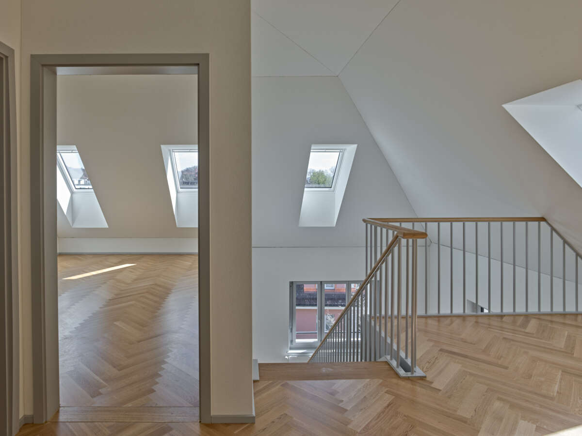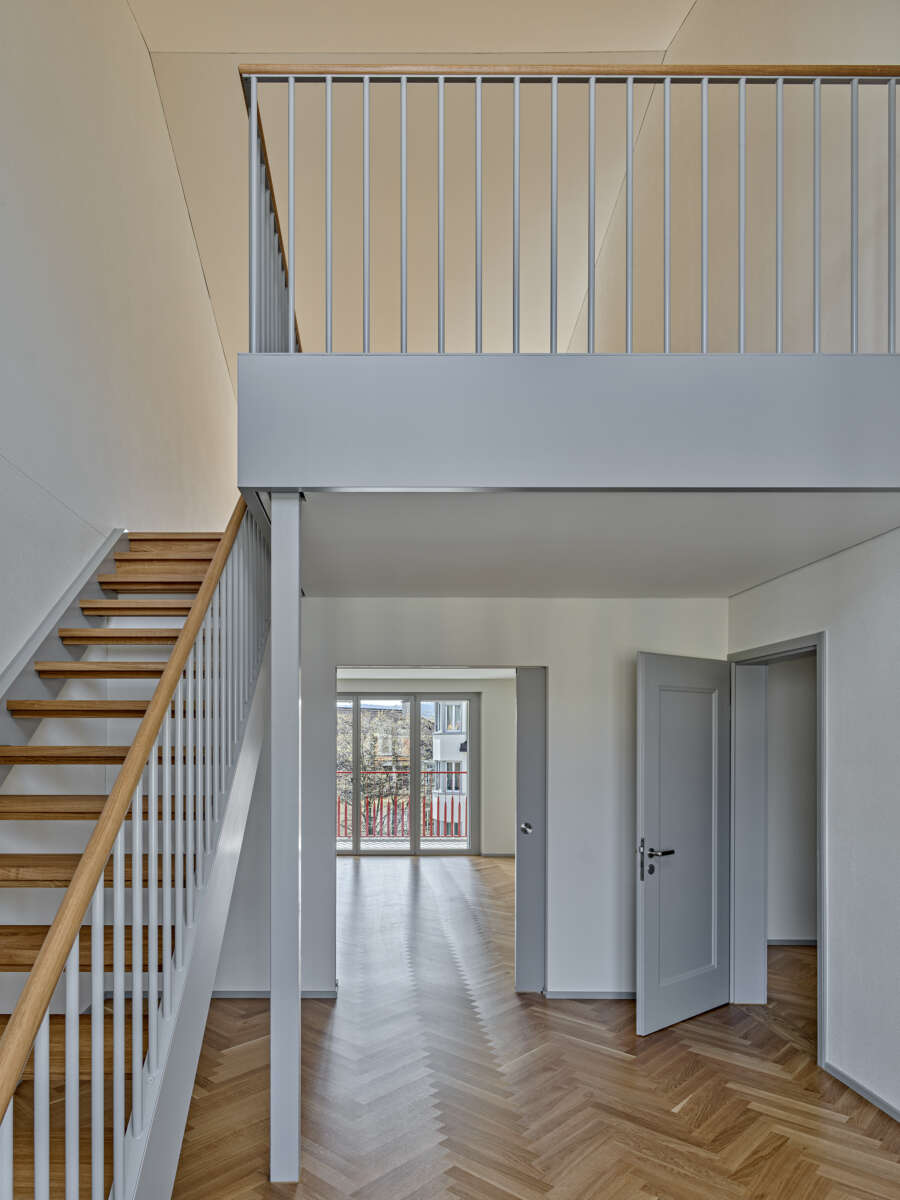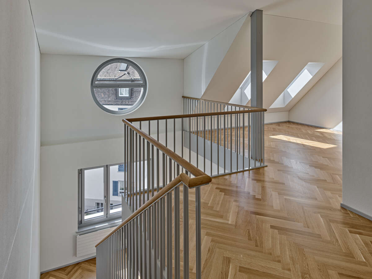 Ihre Dachstühle wurden mittels Holzelementbauweise zum Mansardendach transformiert. Derart erhält die oberste Etage mehr «Luft» und Wohnraum obendrauf. Das heisst, man nutzte den baurechtlichen Spielraum, um die Wohnungen der vierten Etage in sechs grosszügige Maisonettes zu überführen. Die neuen Wohnungen greifen im Knick der Häuser ineinander. Eine klare Zuordnung von aussen ist nicht möglich – und auch nicht gewollt. Innen entstehen dank interner Treppe spannende Raumgefüge und überhohe Wohnräume. Letztere machen sich im Stadtraum mit hohen Fenstern bemerkbar, die sich gleichwohl in die Fassadenordnung integrieren.