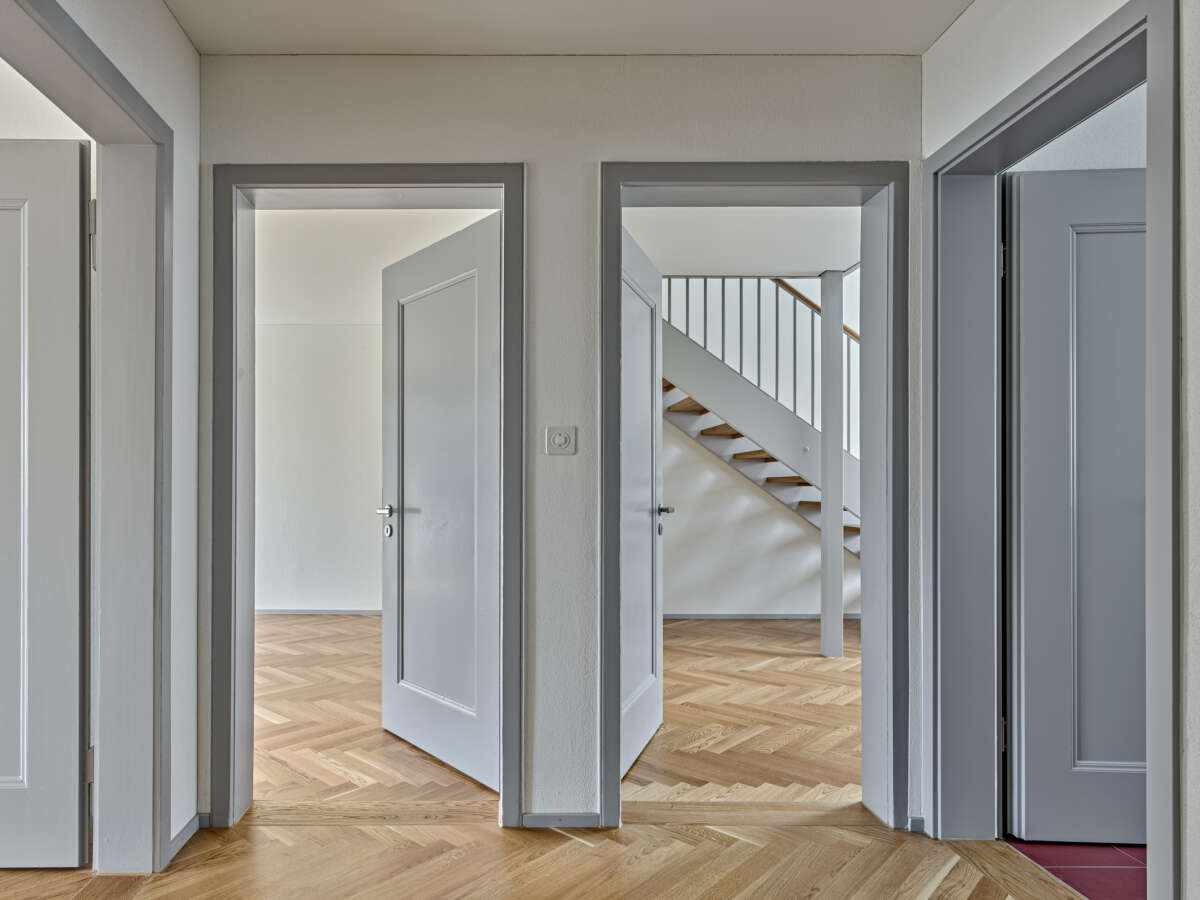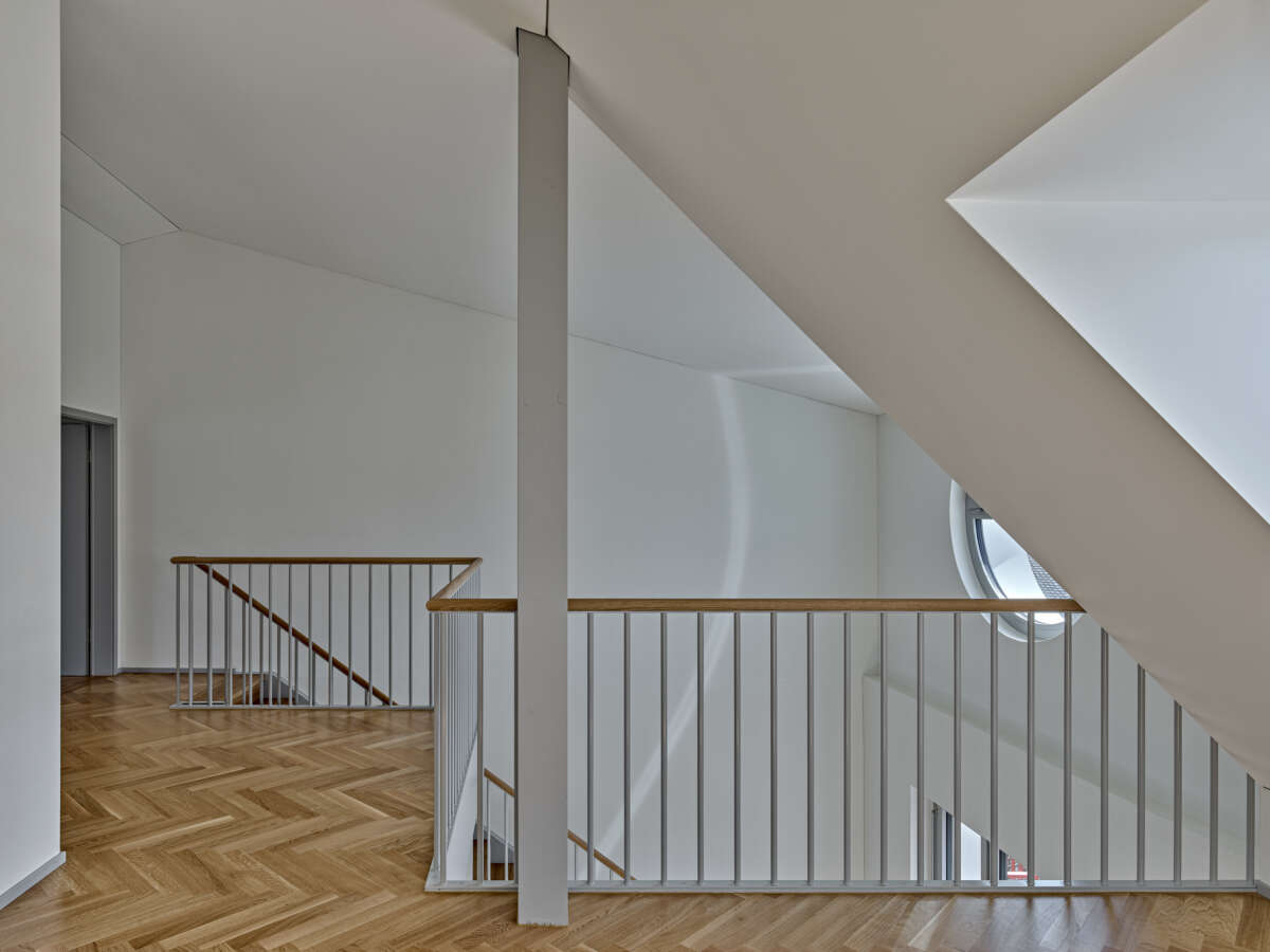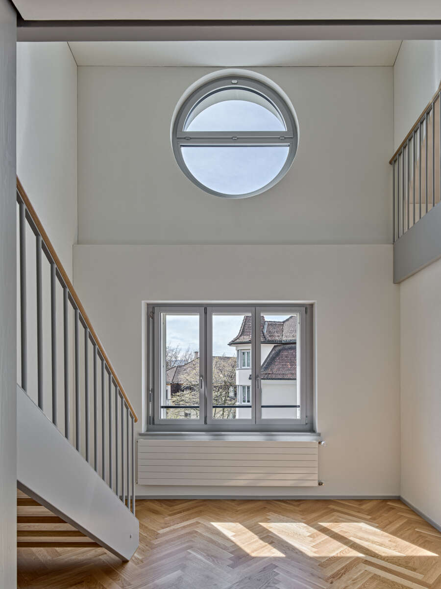 Ihre Dachstühle wurden mittels Holzelementbauweise zum Mansardendach transformiert. Derart erhält die oberste Etage mehr «Luft» und Wohnraum obendrauf. Das heisst, man nutzte den baurechtlichen Spielraum, um die Wohnungen der vierten Etage in sechs grosszügige Maisonettes zu überführen. Die neuen Wohnungen greifen im Knick der Häuser ineinander. Eine klare Zuordnung von aussen ist nicht möglich – und auch nicht gewollt. Innen entstehen dank interner Treppe spannende Raumgefüge und überhohe Wohnräume. Letztere machen sich im Stadtraum mit hohen Fenstern bemerkbar, die sich gleichwohl in die Fassadenordnung integrieren.